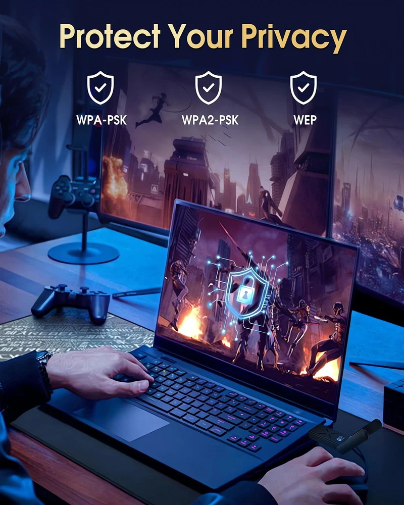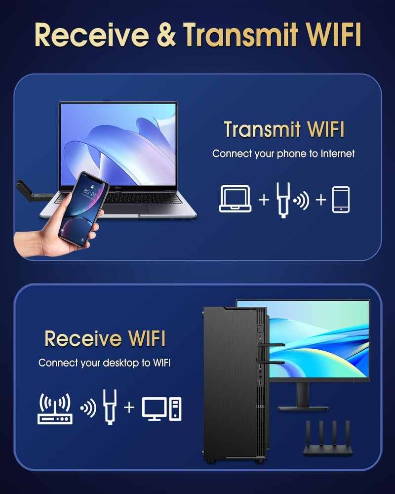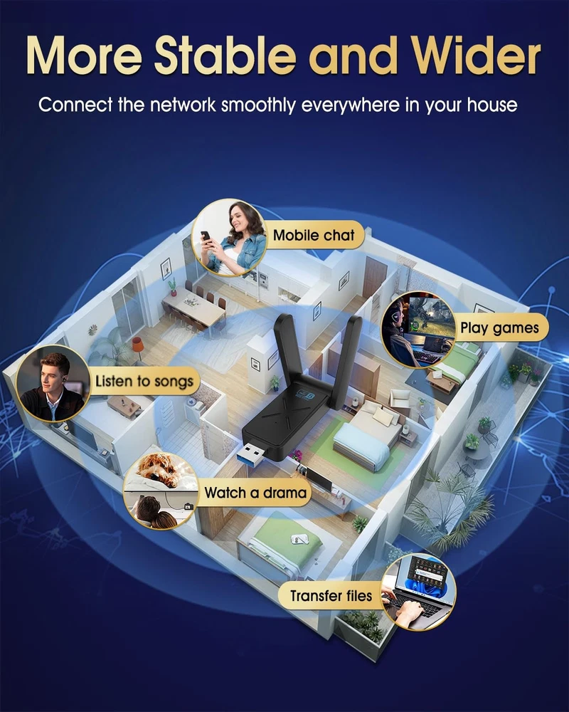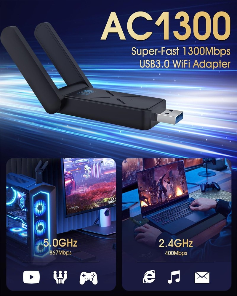 Super-Fast Wifi USB Adapter Basic Usage Scenarios Experience the latest Wifi technology with a USB3.0 Wifi adapter for desktop PCs, delivering high-speed AC 1300Mbps transmission, long-range, lag-free, and stable Wifi connections. Whether you're participating in real-time meetings, streaming your favorite shows, or playing games, you can enjoy seamless connectivity without any interference. Product Features *1.Widely Compatible* The USB WiFi Dual-Band Network Adapter supports Windows 11/10/8.1/8/7. Only Windows 11/10 can be used without the driver, while other systems can easily install the driver through our instructions. *2.Dual-band 5GHz and 2GHz bands* Supports dual frequency seamless switching, ensuring high-speed performance during use. The Wifi speed can be up to 867Mbps on the 5GHz band or 400Mbps on the 2.4GHz band, ideal for online gaming and HD video. *3.Soft AP Mode and Advanced Security* The USB WiFi dongle turns a wired internet connection to a PC or Laptop into a Wi-Fi hotspot. It employs the latest WPA3/WPA2/WEP security protocols to prevent others from stealing your network and avoid information leakage. *4.High Gain Dual Antennas* The USB Wifi adapter comes with 2 high gain long range 5dBi dual band antennas. Even if the signal is weak, this 5dBi high gain WiFi remote antenna can connect to the network, greatly improving the signal strength of the USB adapter for reception and transmission. *5.Super Speed USB 3.0* The USB 3.0 Wifi dongle offers up to 10 times faster transfer speeds compared to USB 2.0. Enjoy quicker response times during data transfers, smooth video streaming, and online gaming. đăSuper-Fast Wifi AdapterăExperience the latest Wifi technology with USB3.0 Wifi adapter for desktop pc, delivering high-speed AC 1300Mbps transmission, long-range and lag-free and stable Wifi connections. Whether you're participating in real-time meetings, streaming your favorite shows, or playing games, you can enjoy seamless connectivity without any interference. đăWidely Compatibleă USB WiFi Dual-Band Network Adapter can support Windows 11/10/8.1/8/7. Only Windows 11/10 can be used without the driver, other systems can easily install the driver through our instructions. đăDual-band 5GHz and 2GHz bandsă Support dual frequency seamless switching, as far as possible in the process of use has been in high speed state. the Wifi speed can be up to 867Mbps on 5GHz band or 400Mbps on 2.4GHz band for online gaming and HD video. đăHigh Gain Dual AntennasăUSB Wifi adapter with 2 high gain long range 5dBi dual band antennas can help you. Even if the signal is weak, this 5dBi high gain WiFi remote antenna can also be connected to the network, greatly improving the signal strength of the USB adapter for reception and transmission. đăSuper Speed USB 3.0ăUSB 3.0 Wifi dongle offers up to 10 times faster transfer speeds compared to USB 2.0. Enjoy quicker response times during data transfers, smooth video streaming, and online gaming.