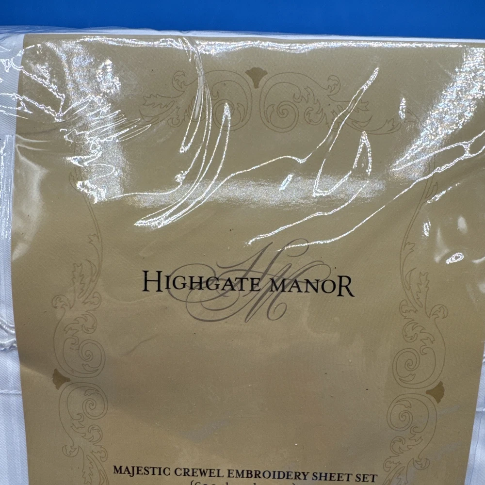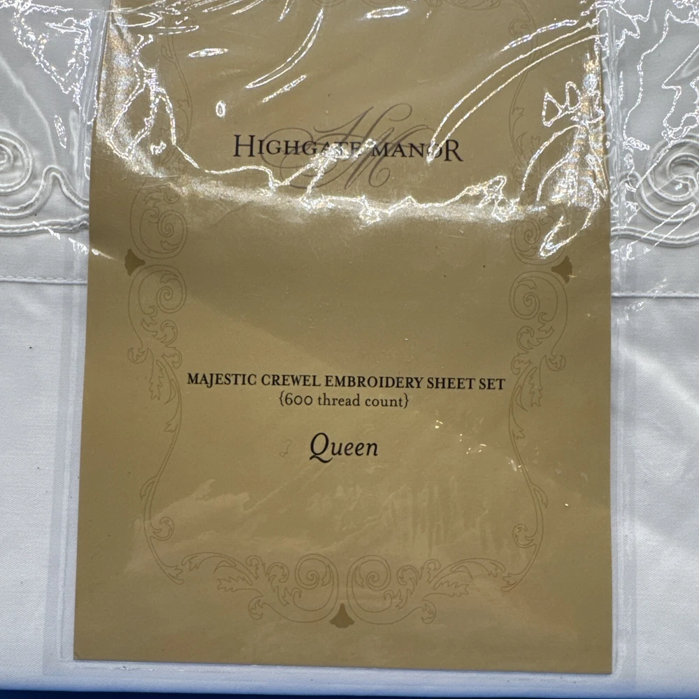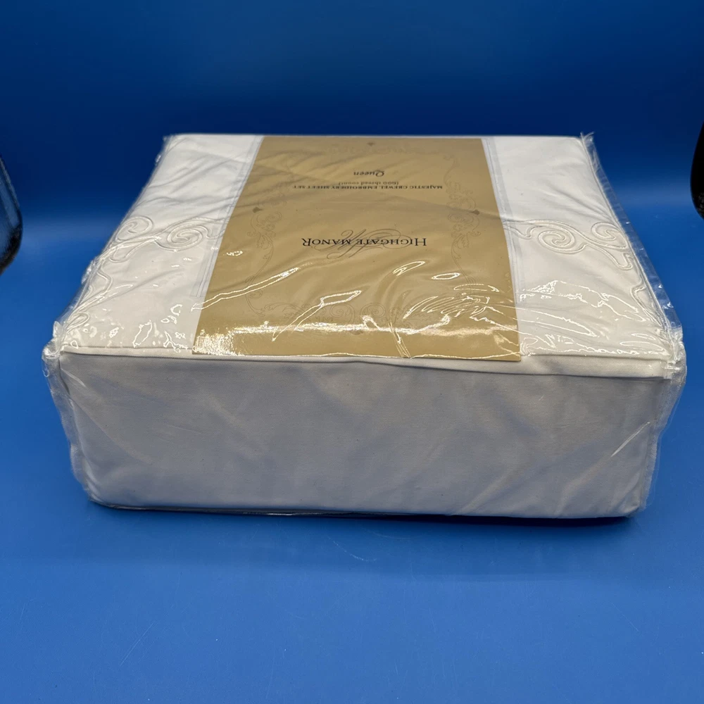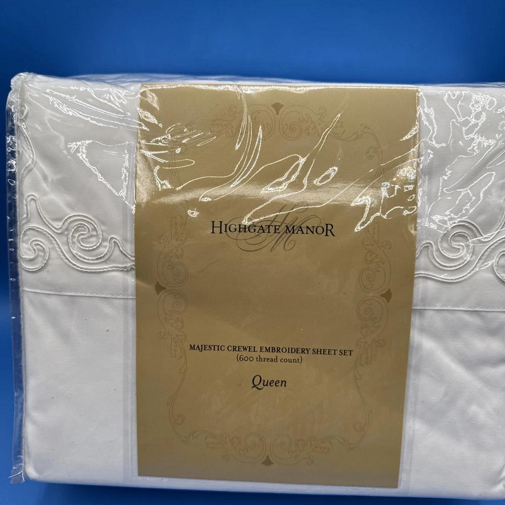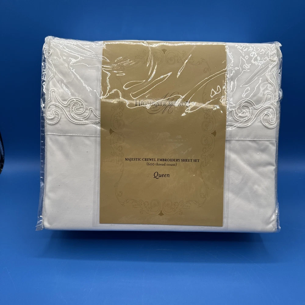 This is a luxurious Highgate Manor Queen Sheet Set in Ivory, featuring a solid color design with majestic crewel embroidery. Made from a blend of 60% Cotton and 40% Polyester, this sheet set has a thread count of 600. Perfect for the bedroom, this set is both elegant and comfortable. Made in China. New in original packaging. Never been removed from the packaging. Excellent condition. Machine wash cold, gentle cycle. No bleach. Size queen. Set includes 1 flat sheet, 1 fitted sheet, and 2 pillowcases. Please check the pictures carefully as part of the description. Feel free to ask questions if you need more information before you buy it. Thank you for your interest B-11