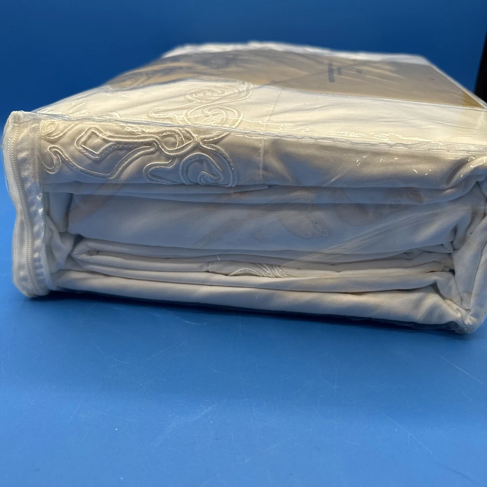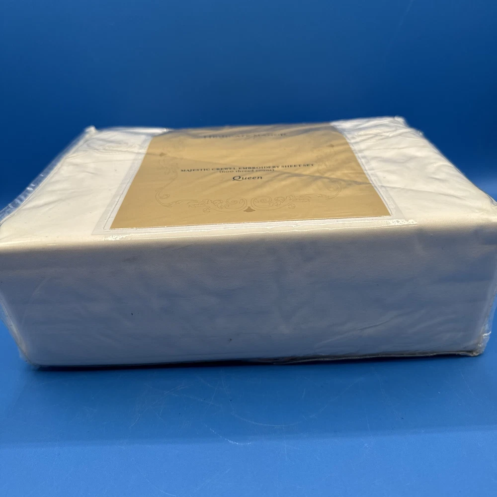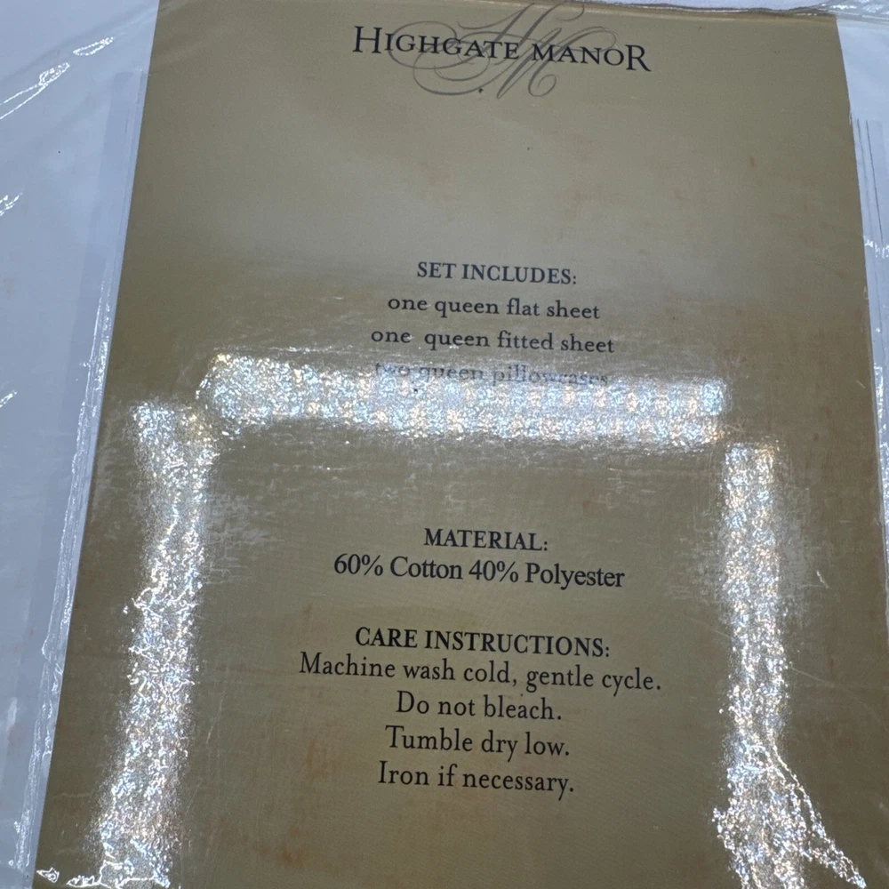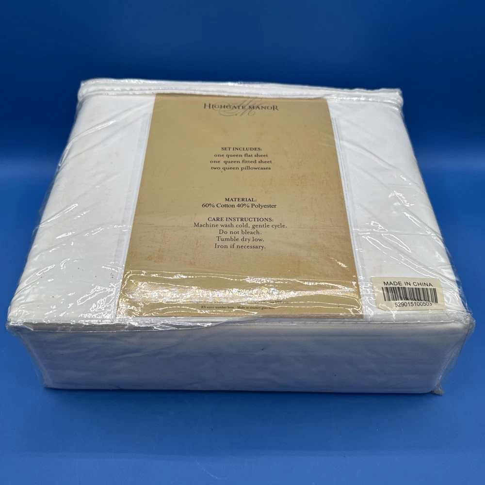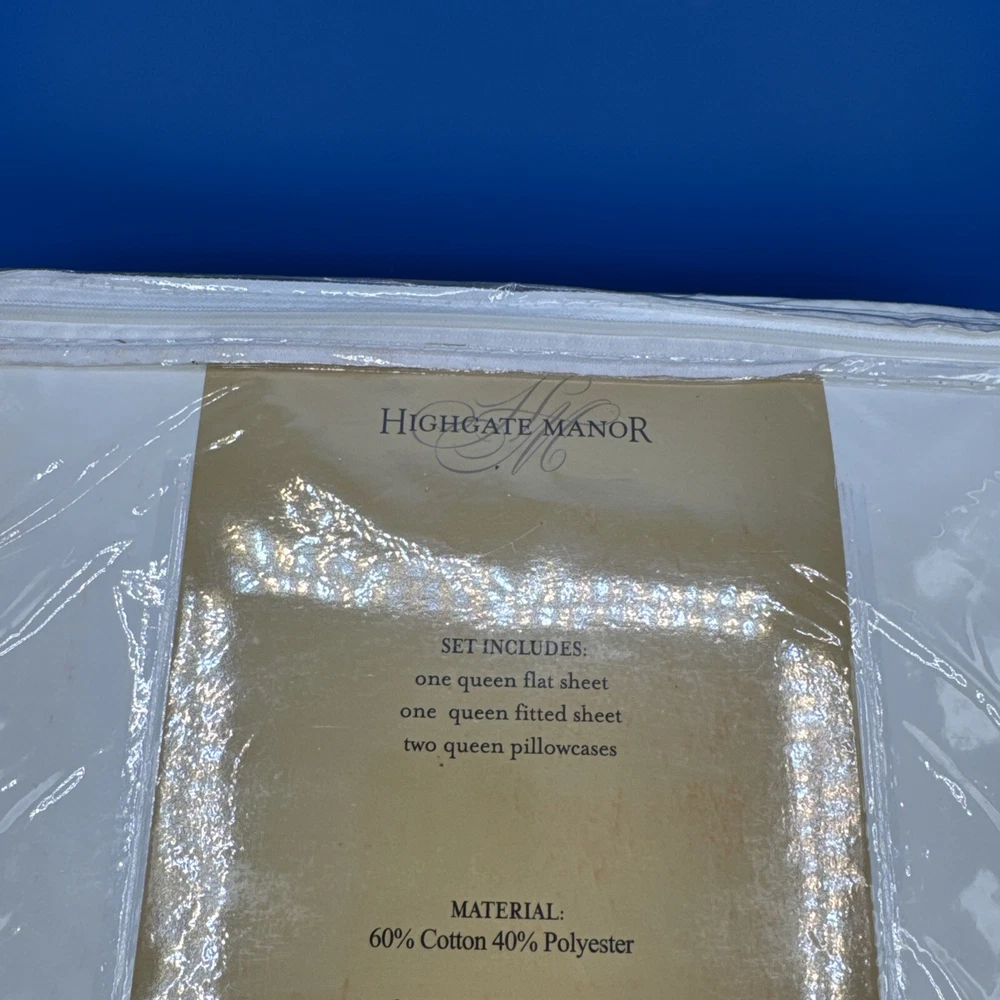 This is a luxurious Highgate Manor Queen Sheet Set in Ivory, featuring a solid color design with majestic crewel embroidery. Made from a blend of 60% Cotton and 40% Polyester, this sheet set has a thread count of 600. Perfect for the bedroom, this set is both elegant and comfortable. Made in China. New in original packaging. Never been removed from the packaging. Excellent condition. Machine wash cold, gentle cycle. No bleach. Size queen. Set includes 1 flat sheet, 1 fitted sheet, and 2 pillowcases. Please check the pictures carefully as part of the description. Feel free to ask questions if you need more information before you buy it. Thank you for your interest B-11