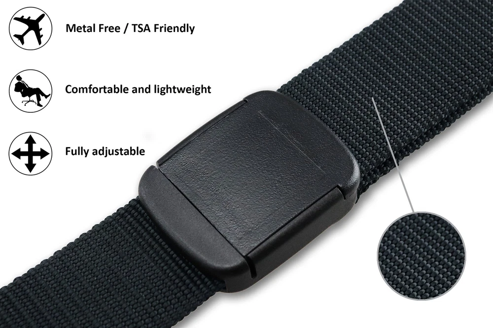 The Hiker Belt is perfect for any outdoor adventure. With it's military grade nylon blend webbing and strong cam locking polycarbonate buckle, it proves to be lightweight and yet holds tight. Travel friendly as it's completely metal free, nickel free and non allergenic. The waterproof design also makes it perfect for hiking, camping, fishing, or just casual wear. Adult size will fit up to pant size 42 and measures 47 inches total. Width is 1.25 inches. Custom fit to size by cutting and singeing the end. [Ultimate Outdoor Companion] Designed with a durable 1.25" wide water-resistant canvas web strap, making it the ideal accessory for hiking, fishing, camping, cycling, and any outdoor adventure. Built to withstand the elements and ensure a comfortable fit all day long. [Perfect Fit ] A customizable fit with our trim-to-fit sizing. The strap fits up to a 42" waist and can easily be trimmed down to your desired length, ensuring a secure fit. [Versatile & Stylish] This belt's sleek and practical design can be worn with hiking pants, fishing gear, or casual outfits for a stylish yet functional look. [Effortless Travel] Featuring a polycarbonate plastic cam buckle, the Hiker Belt is completely metal-free. Breeze through airport security checkpoints without the hassle. Nickel-free and non-allergenic, it's ideal for those with metal sensitivities. [Great Gift ] - Whether you're shopping for an avid hiker, a frequent traveler, or someone who simply loves the great outdoors, the Hiker Belt makes an excellent gift. Its combination of practicality and style will be appreciated by anyone on your list for Father's Day, Mother's Day, Birthdays and more. [Made in the USA from Global Materials] Made from high-quality materials, the Hiker Belt is lightweight yet incredibly strong