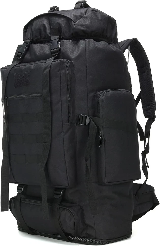 【Hiking Backpack Structure】: The 70L camping backpack main compartment is drawstring closed, hiking backpack roomy enough for you storage hiking gear, shoes and luggage, 1 laptop compartment, 1 front zipper pocket and 2 side pocket for separate and orderly storage. 【stable & Improvement】: We continuing to upgrad this climbing backpack, including fabric, accessories, comfort and and durability. 900D oxford fabric that water resistant, tearable and anti-scratch, stable than same hiking backpack, help for your perfect trip. 【Molle Backpack Men】: Military backpack external molle system designed to be used attach other hiking gear or tactical pack. As assault pack backpack, military tactical backpack, backpacking backpack, climbing backpack and camping hiking backpack for outdoor enthusiasts. 【Comfortable & Breathable】: Backpacker backpack with widened mesh breathable sponge padding shoulder straps help relieve the stress from your shoulder. Thickened sponge back support for best ventilation and easing burden. (NO INTERNAL FRAME). 【Size & Lightweight】: Dimension 34*15.75*10inch, this mountaineering backpack weighs only 2.86lb for easy carrying, and adding no burden to your travel. Perfect size for camping backpack, hiking backpack, trekking backpack, traveling backpack, hunting backpack, climbing backpack. Product description Tactical Hiking Backpack for Men One of the body or soul must be on the road, give yourself a journey that just says to go. You don’t need a destination, you just need to go, forget everything, and move on. As long as you are on the road, there is no place you can’t reach, find a place to relax for your mind and soul, you will find that the world is so beautiful. The world is so big, there are always scenery worth seeing, live up to the world and live up to yourself. Life will give you sunshine only if you give yourself sunshine. 70L Large Capacity Camping Backpack 70L Backpacking Backpack 70L internal capacity, different compartments and pockets suit different requirements, to keep your stuff separate and organized, enough room for 3 or 4 days trips. External Expansion Design The outdoor backpack with with multi-directional compression straps and lengthened for tie up tents, sleeping bags, etc., expand the load capacity of the backpack. Molle System Camping backpack has multiple webbing and mounting systems, you can attach pockets, water bottle, accessory kits and others to effectively increase the space, not only the internal capacity. Style Military Style Backpack Capacity 70L Occasion Hiking, Camping, Hunting, Fishing, Trekking, Traveling, Climbing and other outdoor activity. Size 70L: 27.5*15.75*8INCH / 100L: 34*15.75*10INCH Weight 2.86LB