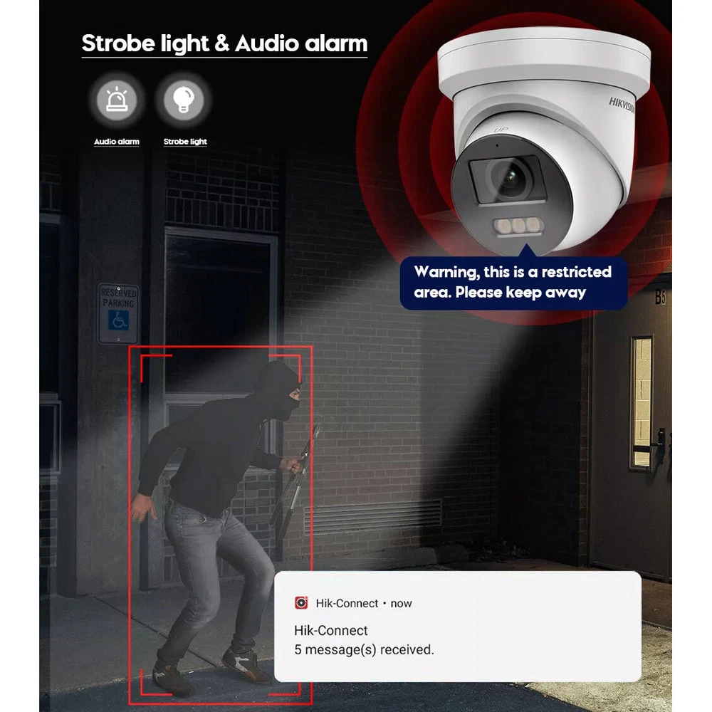 SAFE & SECURE SHOPPING 100% SATISFACTION GUARANTEED FAST SHIPPING Store Categories Store Categories Other IP Camera NVR You may also like Hikvision DS-2DE2A404IW-DE3/W(C0)(S6)(C) 4MP 4xZoom WiFi Mic PTZ IP Camera USA 152.0 USD Free shipping Hikvision DS-2CD2387G2P-LSU/SL 8MP ColorVu Panoramic IP Camera 2-Way Audio Black 209.0 USD Free shipping NEW Dahua PFB205W-E Wall Mount Bracket for IPC-HDW2841T-S IPC-HDW2441T-S Camera 89.0 USD Free shipping Dahua SD2A500HB-GN-AW-PV-S2 5MP Smart Dual Light WiFi PT Outdoor Security Camera 130.0 USD Free shipping Dahua OEM IPC-HDBW2831R-ZAS-S2 4K 8MP 5X ZOOM IR IP Camera Starlight MIC Dome 138.0 USD Free shipping Dahua IPC-HFW2441T-ZS 4MP Starlight 5x Zoom WizSense IP Bullet Camera PoE SMD+ 38.0 USD Free shipping Hikvision 4K 8MP ColorVu AcuSense 8MP DS-2CD2387G2-LSU/SL IP Camera 2 way audio Product Description ★Tips > APP Available: Hik-connect, Guard viewer, IVS-4200 > Search Tool:SADP (search device and change IP address) > This camera is 100% Hikvision Original, support firmware upgrade. > All the items are with 3 years warranty, if there is any problem after purchased, please contact us for help. Features: DS-2CD2387G2-LSU/SL 8 MP ColorVu Strobe Light and Audible Warning Fixed Turret Network Camera ▹High quality imaging with 8 MP resolution ▹Efficient H.265+ compression technology ▹Clear imaging against strong backlight due to 130 dB WDR technology ▹Focus on human and vehicle targets classification based on deep learning ▹24/7 colorful imaging ✅Active strobe light and audio alarm to warn intruders off ✅Provide real-time security via built-in two-way audio ▹ Audio and alarm interface available ▹Water and dust resistant (IP67) Camera Image Sensor 1/1.2″ Progressive Scan CMOS Max. Resolution 3840 × 2160 Min. Illumination Color:0.0005 Lux @ (F1.0, AGC ON),0 Lux with white light Shutter Speed 1/3 s to 1/100,000 s Day & Night 24/7 Color imaging Angle Adjustment Pan: 0° to 360°, tilt: 0° to 75°, rotate: 0° to 360° Lens Lens Type Fixed focal lens, 2.8 and 4 mm optional Focal Length & FOV 2.8 mm, horizontal FOV 102°, vertical FOV 52°, diagonal FOV 124° 4 mm, horizontal FOV 88°, vertical FOV 47°, diagonal FOV 104° Lens Mount M mount Iris Type Fixed Aperture F1.0 Depth Of Field 2.8 mm: 4.5 m to ∞ 4 mm: 7 m to ∞ DORI DORI 2.8 mm: D: 96 m, O: 38 m, R: 19 m, I: 9 m 4 mm: D: 102 m, O: 40 m, R: 20 m, I: 10 m Illuminator Supplement Light Type White Light Supplement Light Range Up to 30 m Smart Supplement Light Yes Video Main Stream 50 Hz: 25 fps (3840 × 2160, 3200 × 1800 , 2688 × 1520, 1920 × 1080, 1280 × 720) 60 Hz: 24 fps (3840 × 2160) 30 fps (3200 × 1800 , 2688 × 1520, 1920 × 1080, 1280 × 720) Sub-Stream 50 Hz: 25 fps (640 × 480, 640 × 360) 60 Hz: 30 fps (640 × 480, 640 × 360) Third Stream 50 Hz: 10 fps (1920 × 1080, 1280 × 720, 640 × 480, 640 × 360) 60 Hz: 10 fps (1920 x 1080, 1280 × 720, 640 × 480, 640 × 360) Video Compression Main stream: H.265/H.264/H.264+/H.265+ Sub-stream: H.265/H.264/MJPEG Third stream: H.265/H.264 Video Bit Rate 32 Kbps to 16 Mbps H.264 Type Baseline Profile/Main Profile/High Profile H.265 Type Main Profile Bit Rate Control CBR/VBR Scalable Video Coding (SVC) H.264 and H.265 encoding Region Of Interest (ROI) 1 fixed region for main stream and sub-stream Audio Environment Noise Filtering -U: Yes Audio Sampling Rate -U: 8 kHz/16 kHz/32 kHz/44.1 kHz/48 kHz Audio Compression -U: G.711ulaw/G.711alaw/G.722.1/G.726/MP2L2/PCM/MP3/AAC Audio Bit Rate -U: 64 Kbps (G.711ulaw/G.711alaw)/16 Kbps (G.722.1)/16 Kbps (G.726)/32 to 192 Kbps (MP2L2)/8 to 320 Kbps (MP3)/16 to 64 Kbps (AAC) Network Simultaneous Live View Up to 6 channels API Open Network Video Interface (Profile S, Profile G, Profile T), ISAPI, SDK , ISUP Protocols TCP/IP, ICMP, HTTP, HTTPS, FTP, DHCP, DNS, DDNS, RTP, RTSP, NTP, UPnP, SMTP, IGMP, 802.1X, QoS, IPv4, IPv6, UDP, Bonjour, SSL/TLS, PPPoE, SNMP, WebSocket, WebSockets User/Host Up to 32 users. 3 user levels: administrator, operator and user Security Password protection, complicated password, HTTPS encryption, IP address filter, Security Audit Log, basic and digest authentication for HTTP/HTTPS, TLS 1.1/1.2, WSSE and digest authentication for Open Network Video Interface Network Storage NAS (NFS, SMB/CIFS), auto network replenishment (ANR) Client iVMS-4200, Hik-Connect, Hik-Central Web Browser Plug-in required live view: IE 10, IE 11 Plug-in free live view : Chrome 57.0+, Firefox 52.0+ Local service: Chrome 57.0+, Firefox 52.0+ Image Wide Dynamic Range (WDR) 130 dB SNR ≥ 52 dB Privacy Mask 8 programmable polygon privacy masks, mask color or mosaic configurable Day/Night Switch Day, Night, Auto, Schedule Image Enhancement BLC, HLC, 3D DNR Image Parameters Switch Yes Image Settings Rotate mode, saturation, brightness, contrast, sharpness, gain, white balance adjustable by client software or web browser Interface Ethernet Interface 1 RJ45 10 M/100 M self-adaptive Ethernet port On-Board Storage Built-in memory card slot, support microSD/microSDHC/microSDXC/TF card, up to 256 GB Built-In Microphone Yes Built-In Speaker 1.5 W, 10 cm: 95 dB Audio 1 input (line in), max. input amplitude: 3.3 Vpp, input impedance:4.7 KΩ, interface type: non-equilibrium 1 output (line out), max.output amplitude: 3.3 Vpp, output impedance: 100 Ω, interface type: non-equilibrium Alarm 1 input, 1 output (max. 24 VDC, 1 A) Reset Key Yes Event Basic Event Motion detection (support alarm triggering by specified target types (human and vehicle)), video tampering alarm, exception (network disconnected, IP address conflict, illegal login, HDD full, HDD error) Smart Event Line crossing detection, intrusion detection, region entrance detection, region exiting detection (support alarm triggering by specified target types (human and vehicle)), scene change detection Linkage Upload to NAS/memory card/FTP, notify surveillance center, trigger record, trigger capture, send email Deep Learning Function Face Capture