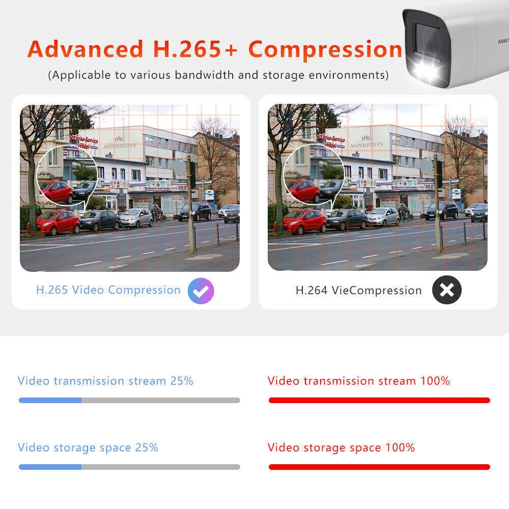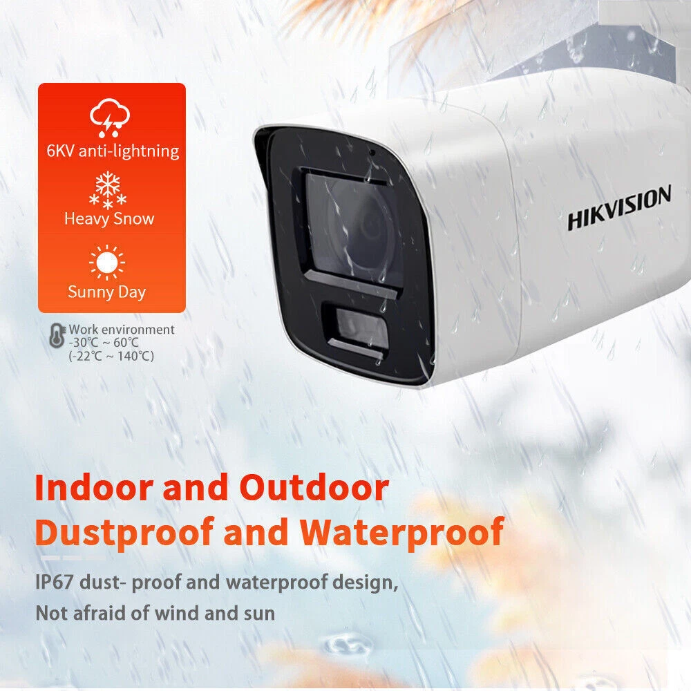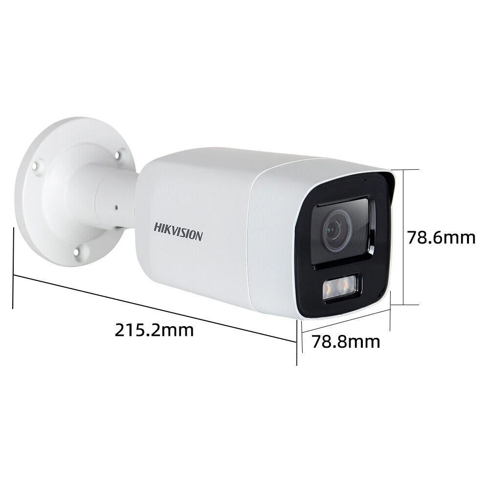 Product Description NEW hikvision DS-2CD2087G2-LU 8MP ColorVu AcuSense Bullet PoE MIC IP67 IP Camera 4 K ColorVu Fixed Bullet Network Camera High quality imaging with 8 MP resolution Efficient H.265+ compression technology Clear imaging against strong back light due to 130 dB WDR technology Focus on human and vehicle classification based on deep learning 24/7 colorful imaging Built-in microphone for real-time audio security (-U) Lens Lens Type Fixed focal lens, 2.8, 4, and 6 mm optional Focal Length & FOV 2.8 mm: horizontal FOV102°, vertical FOV 52°, diagonal FOV 124° 4 mm: horizontal FOV 88°, vertical FOV 47°, diagonal FOV 104° 6 mm: horizontal FOV 54°, vertical FOV 30°, diagonal FOV 62° Iris Type Fixed Aperture F1.0 Depth Of Field 2.8 mm: 4.5 m to ∞ 4 mm: 7 m to ∞ 6 mm: 13 m to ∞ DORI DORI 2.8 mm, D: 96 m, O: 38 m, R: 19 m, I: 10 m 4 mm, D: 102 m, O: 41 m, R: 21 m, I: 11 m 6 mm, D: 167 m, O: 66 m, R: 33 m, I: 16 m Illuminator Supplement Light Type White light Supplement Light Range 40 m Smart Supplement Light Yes Video Main Stream 50 Hz: 25 fps (3840 × 2160, 3200 × 1800 , 2688 × 1520, 1920 × 1080, 1280 × 720) 60 Hz: 24 fps (3840 × 2160) 30 fps (3200 x 1800 , 2688 × 1520, 1920 × 1080, 1280 × 720) Sub-Stream 50 Hz: 25 fps (640 × 480, 640 × 360) 60 Hz: 30 fps (640 × 480, 640 × 360) Third Stream 50 Hz: 10 fps (1920 x 1080 , 1280 × 720, 640 × 480, 640 × 360) 60 Hz: 10 fps (1920 x 1080 , 1280 × 720, 640 × 480, 640 × 360) Video Compression Main stream: H.265/H.264/H.264+/H.265+ Sub-stream: H.265/H.264/MJPEG Third stream: H.265/H.264 Video Bit Rate 32 Kbps to 16 Mbps H.264 Type Baseline Profile/Main Profile/High Profile H.265 Type Main Profile Bit Rate Control CBR/VBR Scalable Video Coding (SVC) H.264 and H.265 encoding Region Of Interest (ROI) 1 fixed region for main stream and sub-stream Audio Audio Compression -U: G.711ulaw/G.711alaw/G.722.1/G.726/MP2L2/PCM/MP3/AAC Audio Bit Rate -U: 64 Kbps (G.711 ulaw)/64 Kbps(G.711 alaw)/16 Kbps(G.722.1)/16 Kbps(G.726)/32 to 192 Kbps(MP2L2)/8 to 320 Kbps(MP3)/16 to 64Kbps(AAC) Audio Sampling Rate -U: 8 kHz/16 kHz/32 kHz/44.1 kHz/48 kHz Environment Noise Filtering -U: Yes Network Protocols TCP/IP, ICMP, HTTP, HTTPS, FTP, DHCP, DNS, DDNS, RTP, RTSP, NTP, UPnP, SMTP, IGMP, 802.1X, QoS, IPv4, IPv6, UDP, Bonjour, SSL/TLS, PPPoE, SNMP Simultaneous Live View Up to 6 channels API Open Network Video Interface (Profile S, Profile G, Profile T), ISAPI, SDK User/Host Up to 32 users. 3 user levels: administrator, operator and user Security Password protection, complicated password, HTTPS encryption, IP address filter, Security Audit Log, basic and digest authentication for HTTP/HTTPS, TLS 1.1/1.2, WSSE and digest authentication for Open Network Video Interface Network Storage NAS (NFS, SMB/CIFS), auto network replenishment (ANR) Client iVMS-4200, Hik-Connect, Hik-Central Web Browser Plug-in required live view: IE 10, IE 11 Plug-in free live view : Chrome 57.0+, Firefox 52.0+ Local service: Chrome 57.0+, Firefox 52.0+ Image Image Parameters Switch Yes Image Settings Rotate, mirror, privacy mask, saturation, brightness, contrast, sharpness, gain, white balance adjustable by client software or web browser Day/Night Switch Day, Night, Auto, Schedule Wide Dynamic Range (WDR) 130 dB SNR ≥ 52 dB Image Enhancement BLC, HLC, 3D DNR Interface Ethernet Interface 1 RJ45 10 M/100 M self-adaptive Ethernet port On-Board Storage Built-in memory card slot, support microSD/microSDHC/microSDXC/TF card, up to 256 GB Built-In Microphone -U: Yes Reset Key Yes Event Basic Event Motion detection (human and vehicle targets classification), video tampering alarm, exception (network disconnected, IP address conflict, illegal login, HDD full, HDD error) Smart Event Line crossing, intrusion, region entrance, region exiting (support alarm triggering by specified target types (human and vehicle)) Scene change detection Linkage Upload to FTP/memory card/NAS, notify surveillance center, trigger record, trigger capture, send email Deep Learning Function Face Capture Yes General Power 12 VDC ± 25%, 0.5 A, max. 6 W, Ø5.5 mm coaxial power plug, reverse polarity protection PoE: (802.3af, Class 3, 36 V to 57 V), 0.25 A to 0.15 A, max. 7.5 W Dimension 78.8 × 78.6 × 215.2 mm (3.1" × 3.1" × 8.5") Package Dimension 315 × 137 × 141 mm (12.4" × 5.4" × 5.6") Weight Approx. 850 g (1.9 lb.) With Package Weight Approx. 1270 g (2.8 lb.) Storage Conditions -30 °C to 60 °C (-22 °F to 140 °F). Humidity 95% or less (non-condensing) Startup And Operating Conditions -30 °C to 60 °C (-22 °F to 140 °F). Humidity 95% or less (non-condensing) Language 33 languages English, Russian, Estonian, Bulgarian, Hungarian, Greek, German, Italian, Czech, Slovak, French, Polish, Dutch, Portuguese, Spanish, Romanian, Danish, Swedish, Norwegian, Finnish, Croatian, Slovenian, Serbian, Turkish, Korean, Traditional Chinese, Thai, Vietnamese, Japanese, Latvian, Lithuanian, Portuguese (Brazil), Ukrainian General Function Anti-flicker, heartbeat, password reset via e-mail, pixel counter Approval EMC FCC (47 CFR Part 15, Subpart B); CE-EMC (EN 55032: 2015, EN 61000-3-2:2019, EN 61000-3-3:2013+A1:2019, EN 50130-4: 2011 +A1: 2014); RCM (AS/NZS CISPR 32: 2015); IC (ICES-003: Issue 7) Safety UL (UL 62368-1); CB (IEC 62368-1:2014+A11) CE-LVD (EN 62368-1:2014/A11:2017) Environment CE-RoHS (2011/65/EU); WEEE (2012/19/EU); Reach (Regulation (EC) No 1907/2006) Protection IP67 (IEC 60529-2013) About Us Payment and Shipping: 1. we only accept PayPal payment. 2. We will ship your order within 5 days. Please make sure your shipping address and phone number are correct. Returns 1. If the item arrives with defects or errors, before you start the return process, please contact us via ebay message and we will provide you with a satisfactory solution. Communication is always the best way to solve problems. 2. If you do not receive your item on time, please contact us for further assistance. Feedback and Contact