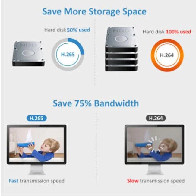 • H.265/H.264 8MP IP/Network IR Turret Dome Camera • Up to 8 megapixel high resolution • Max. 3840*2160(8MP)@20fps(50HZ/60HZ) •Support RTSP&Onvif(17.2 with profile S) • Compatible with many third-party NVRs and CMS • Support multiply Web Browsers: IE/Firefox/Chrome/Safari etc. • P2P Cloud service • Free PC Client Software and Smartphone APP(P2P) • Support Alarm Snapshot to Email and FTP • Day/Night, AWB/MWB,BLC, 3D-DNR,Shutter, IR-CUT D-WDR,Mirror, Image Flip etc. Functions • Built-in Mic • 12V DC (PoE) • 2.8mm fixed lens • IR range: up to 25m • Water-proof: IP66 • Metal Shell 8MP Ultra-clear Image Built-in 8MP ultra-clear high-resolution lens, with a high-sensitivity image sensor, this camera can capture more details of the image and bring you a better visual experience. Audio Recording and Noise Filter This POE security dome IP camera builts-in microphone with environmental noise filter function, which can record clear voices and provide vivid videos with sound. H.265 Video Compression, Save Much Storage Space and Money With the H.265 video compression technology, more memory space will be saved than the H.264 in storing the same videos. At the same time,this powerful function delivers much smoother video recordings and saves the cost ofbuying an extra HDD. Motion Detection & Get Instant Alerts Within the monitoring range, the system will automatically detect intruders, and push the alarm information in time, to remind you to take action to protect your property. PoE——Play and Plug with Less Effort This PoE IP camera only needs to be connected to a network cable to achieve the purpose of data transmission and power supply The installation is easy and simple. At the same time, this camera comes with Hikvision private protocol, so it can be play and plug with Hikvision NVR. Waterproof Metal Case, Widely Used Indoor & Outdoor The all-metal shell makes the camera have good waterproof, cold and heat resistance performance. Thus, you can install it to various indoor and outdoor places according to your needs. Camera's Working Temperature: -30°C ~ 60°C (-22℉ ~ 140 ℉) Night Vision Distance up to 25m With 18PCs LED lights and improved infrared radiation technology, this 5MP POE IP camera supports a long-distance night vision range of 20-30m, capturing clearer images and videos, which is very suitable for lanes, corridors, etc. Wider Field of View Compared with a camera with a 4mm lens and only a 98° diagonal viewing angle, this camera has a 2.8mm lens with a 130° diagonal viewing angle, allowing you to easily see more corners of the house. Remote View & Multiple Devices Support Even though far separate the thousand miles, you can know everything about monitoring area through “Danale”app on mobile phone, tablet or PC. 24/7 According, Providing Professional Protection It can work with all NVRs that support onvif protocol, such as Anpviz, Hikvision and Dahua ect., providing 24/7 continuous recording and professional protection for you. How to Connect About Us Payment and Shipping: 1. we only accept PayPal payment. 2. We will ship your order within 5 days. Please make sure your shipping address and phone number are correct. Returns 1. If the item arrives with defects or errors, before you start the return process, please contact us via ebay message and we will provide you with a satisfactory solution. Communication is always the best way to solve problems. 2. If you do not receive your item on time, please contact us for further assistance. Feedback and Contact Us 1. we always try to provide every customer with the best service and the best quality products, but sometimes there may be accidents, if you are not satisfied with our goods or services, please feel free to leave a message to contact us, we believe we can solve all the problems for you. Please do not feel free to leave negative feedback. 2.If you are satisfied with our products, we also hope you can give us a five-star positive feedback. We will be grateful for that. About tariffs 1. Import duties, taxes and charges are not included in the item price or shipping cost, these charges are collected by the customs of your country. Buyers are responsible for paying import duties and taxes themselves, as stipulated by eBay. 2. Please check with your country's customs office before purchasing to determine these additional customs fees.