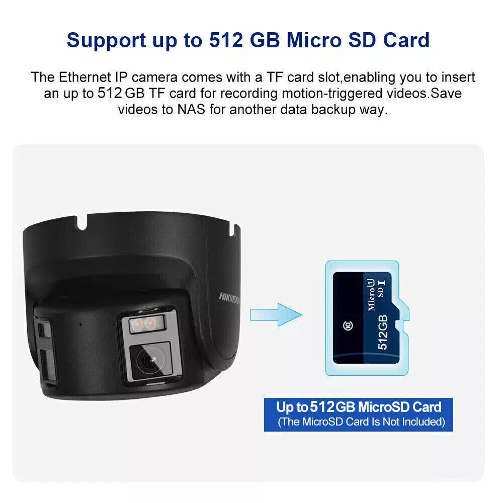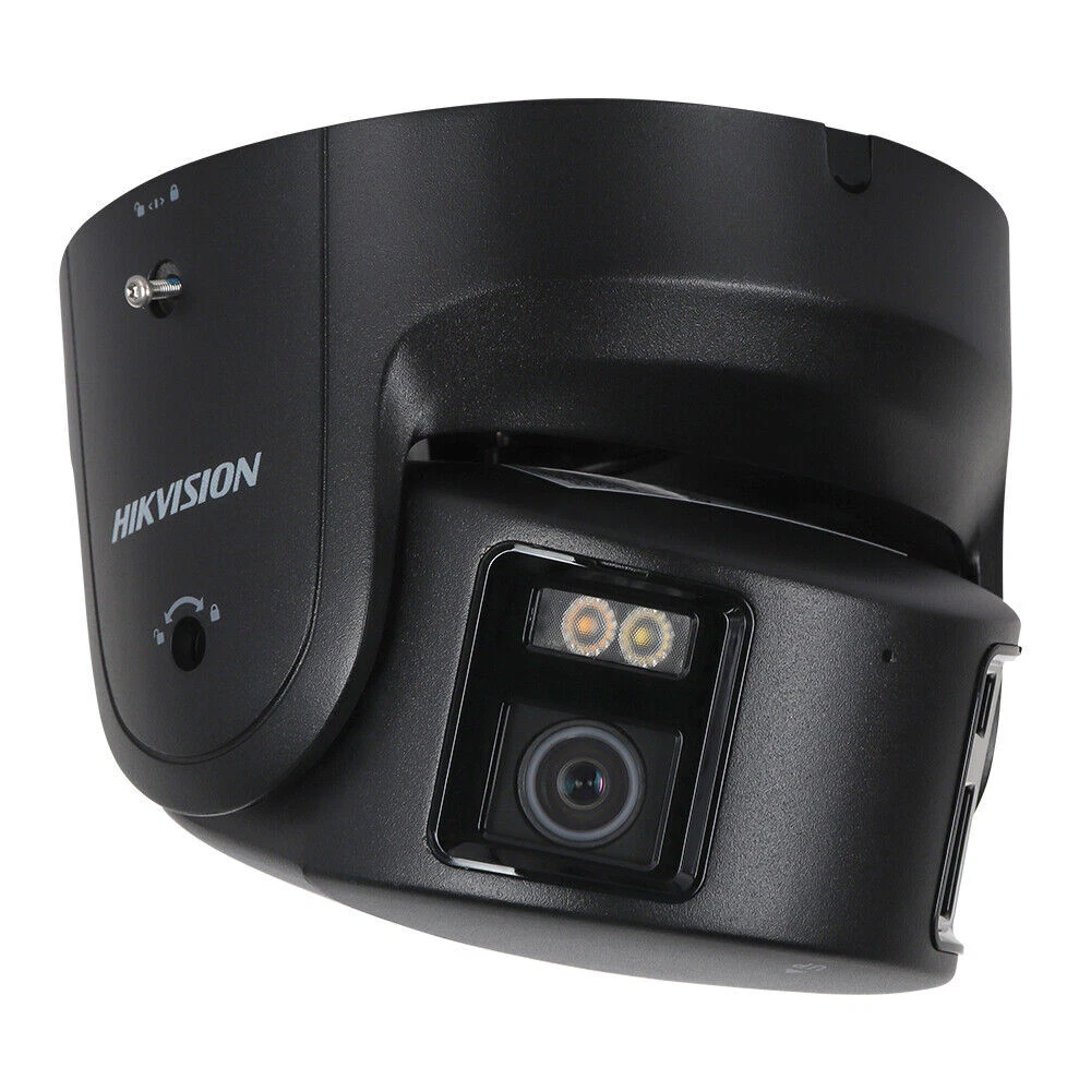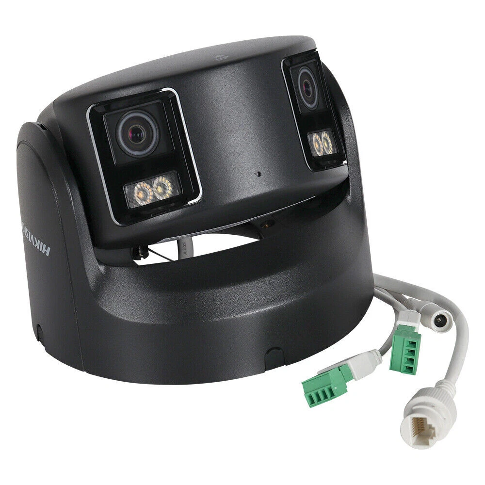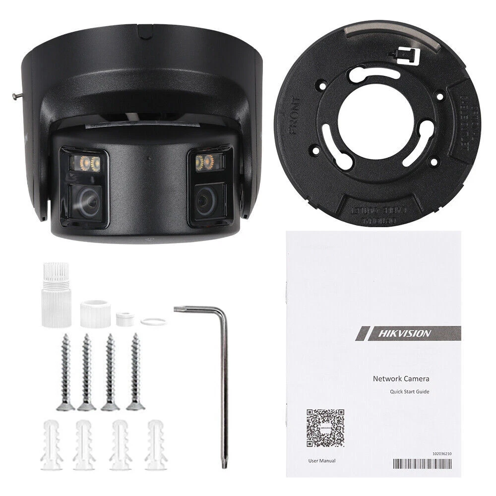 Product Description Features: High quality imaging with 8 MP resolution One image that presents all the scenes covered by the camera 24/7 colorful imaging Efficient H.265+ compression technology Clear imaging against strong back light due to 130 dB WDR technology Focus on human and vehicle classification based on deep learning Active strobe light and audio alarm to warn intruders off Water and dust resistant (IP67) Specifications: Camera Image Sensor 2 × 1/1.8" Progressive Scan CMOS Max. Resolution 5120 × 1440 Min. Illumination Color: 0.0005 Lux @ (F1.0, AGC ON),0 Lux with light Shutter Time 1/3 s to 1/100,000 s Angle Adjustment Pan: -30° to 30°,tilt: -75° to 75° Lens Lens Type Fixed focal lens, Dual lens: 4 mm Focal Length & FOV 4 mm, horizontal FOV: 180°, vertical FOV: 44° Lens Mount M16 Iris Type Fixed Aperture F1.0 Depth Of Field 3.6 m to ∞ DORI DORI 4 mm, D: 77 m, O: 30 m, R: 15 m, I: 7 m Illuminator Supplement Light Type White Light Supplement Light Range Up to 30 m Smart Supplement Light Yes Video Main Stream When WDR is On: 50 Hz: 12.5 fps (5120 × 1440) 60 Hz: 15 fps (5120 × 1440) When WDR is Off: 50 Hz: 20 fps (5120 × 1440) 60 Hz: 20 fps (5120 × 1440) Sub-Stream When WDR is On: 50 Hz: 12.5 fps (1920 × 536, 960 × 272) 60 Hz: 15 fps (1920 × 536, 960 × 272) When WDR is Off: 50 Hz: 20 fps (1920 × 536, 960 × 272) 60 Hz: 20 fps (1920 × 536, 960 × 272) Video Compression Main stream: H.265+/H.265/H.264+/H.264 Sub-stream: H.265/H.264/MJPEG Video Bit Rate 32 Kbps to 16 Mbps H.264 Type Baseline Profile,Main Profile,High Profile H.265 Type Main Profile Bit Rate Control CBR,VBR Scalable Video Coding (SVC) H.264 and H.265 encoding Region Of Interest (ROI) 1 fixed region(s) for main stream Audio Audio Type Mono sound Audio Compression G.711/G.722.1/G.726/MP2L2/PCM/MP3/AAC-LC Audio Bit Rate 64 Kbps (G.711ulaw/G.711alaw)/16 Kbps (G.722.1)/16 Kbps (G.726)/32 to 192 Kbps (MP2L2)/8 to 320 Kbps (MP3)/16 to 64 Kbps (AAC-LC) Audio Sampling Rate 8 kHz/16 kHz/32 kHz/44.1 kHz/48 kHz Environment Noise Filtering Yes Network Protocols TCP/IP, ICMP, HTTP, HTTPS, FTP, DHCP, DNS, DDNS, RTP, RTSP, NTP, UPnP, SMTP, IGMP, 802.1X, QoS, IPv6, UDP, Bonjour, SSL/TLS, PPPoE, SNMP, WebSocket, WebSockets Simultaneous Live View Up to 6 channels API Open Network Video Interface (Profile S, Profile G, Profile T),ISAPI,SDK,ISUP User/Host Up to 32 users 3 user levels: administrator, operator, and user Security Password protection, complicated password, HTTPS encryption, 802.1X authentication (EAP-MD5), watermark, IP address filter, basic and digest authentication for HTTP/HTTPS, WSSE and digest authentication for Open Network Video Interface, RTP/RTSP over HTTPS, control timeout settings, security audit log, TLS 1.2, host authentication (MAC address) Network Storage NAS (NFS, SMB/CIFS),Auto Network Replenishment (ANR),NVR, Together with high-end Hikvision memory card, memory card encryption and health detection are supported. Client iVMS-4200,Hik-Connect,Hik-Central Web Browser Plug-in required live view: IE 10, IE 11 , Plug-in free live view: Chrome 57.0+, Firefox 52.0+, Local service: Chrome 57.0+, Firefox 52.0+ Image Image Parameters Switch Yes Image Settings saturation,brightness,contrast,sharpness,gain,white balance,adjustable by client software or web browser Day/Night Switch Day,Night,Auto,Schedule Wide Dynamic Range (WDR) 130 dB SNR ≥ 52 dB Image Enhancement BLC,HLC,3D DNR Interface Ethernet Interface 1 RJ45 10 M/100 M self-adaptive Ethernet port On-Board Storage Built-in memory card slot, support microSD/microSDHC/microSDXC/TF card, up to 256 GB Built-In Microphone Yes Built-In Speaker Max. power consumption: 1.2 W, max. sound pressure: 10 cm: 95 dB Audio 1 input (line in), terminal block, max. input amplitude: 3.3 Vpp, input impedance: 4.7 KΩ, interface type: non-equilibrium, 1 output (line out), terminal block, max. output amplitude: 3.3 Vpp, output impedance: 100 Ω, interface type: non-equilibrium Alarm 1 input, 1 output (max. 24 VDC, 1 A) Reset Key Yes Event Basic Event Motion detection (support alarm triggering by specified target types (human and vehicle)),alarm input and output,flashing alarm light output, audible alarm output, exception Smart Event Line crossing detection, intrusion detection, region entrance detection, region exiting detection (support alarm triggered by specified target types (human and vehicle)), scene change detection Linkage Upload to FTP/NAS/memory card,notify surveillance center,send email,trigger alarm output,trigger recording,trigger capture,audible warning,white light flashing Deep Learning Function Perimeter Protection Line crossing, intrusion, region entrance, region exiting (support alarm triggering by specified target types (human and vehicle)) General Power 12 VDC ± 25%, 0.79 A, max. 9.5 W,Ø5.5 mm coaxial power plug, PoE: 802.3af, Class 3, 36 V to 57 V, 0.29 A to 0.18 A, max. 10.5 W Material Base: metal, cover: metal Dimension Ø155 mm × 155.3 mm (Ø6.1 × 6.1\")" Package Dimension 230 mm × 230 mm × 230 mm (9" × 9" × 9") Approx. 1110 g (2.4 lb.) With Package Weight Approx. 1900 g (4.2 lb.) Storage Conditions -30 °C to 60 °C (-22 °F to 140 °F). Humidity 95% or less (non-condensing) Startup And Operating Conditions -30 °C to 60 °C (-22 °F to 140 °F). Humidity 95% or less (non-condensing) Language 33 languages: English, Russian, Estonian, Bulgarian, Hungarian, Greek, German, Italian, Czech, Slovak, French, Polish, Dutch, Portuguese, Spanish, Romanian, Danish, Swedish, Norwegian, Finnish, Croatian, Slovenian, Serbian, Turkish, Korean, Traditional Chinese, Thai, Vietnamese, Japanese, Latvian, Lithuanian, Portuguese (Brazil), Ukrainian General Function Anti-flicker, heartbeat, password reset via email, password protection, one-key reset Flashing Light Yes Approval EMC FCC: 47 CFR Part 15, Subpart B, CE-EMC: EN 55032: 2015, EN 61000-3-2:2019, EN 61000-3-3: 2013+A1:2019, EN 50130-4: 2011 +A1: 2014, RCM: AS/NZS CISPR 32: 2015, IC: ICES-003: Issu