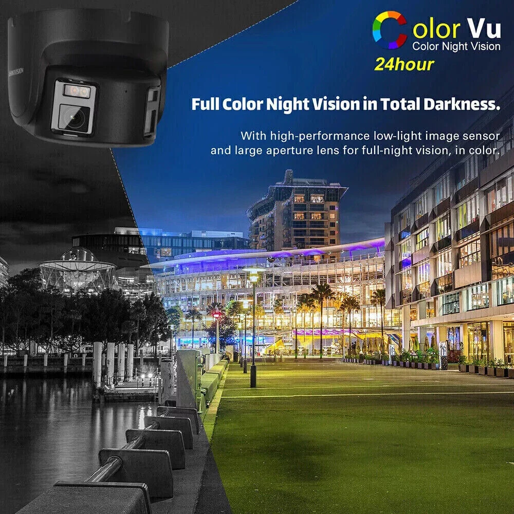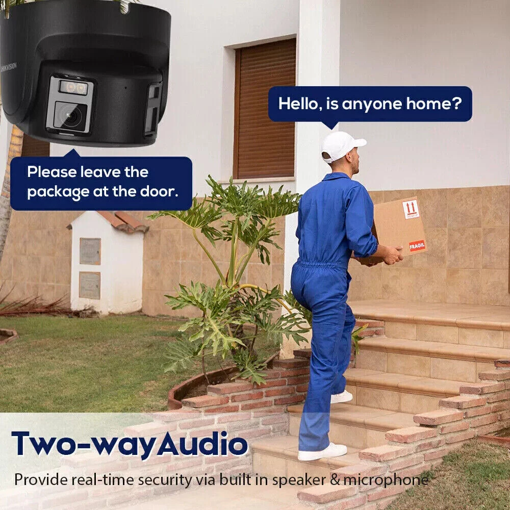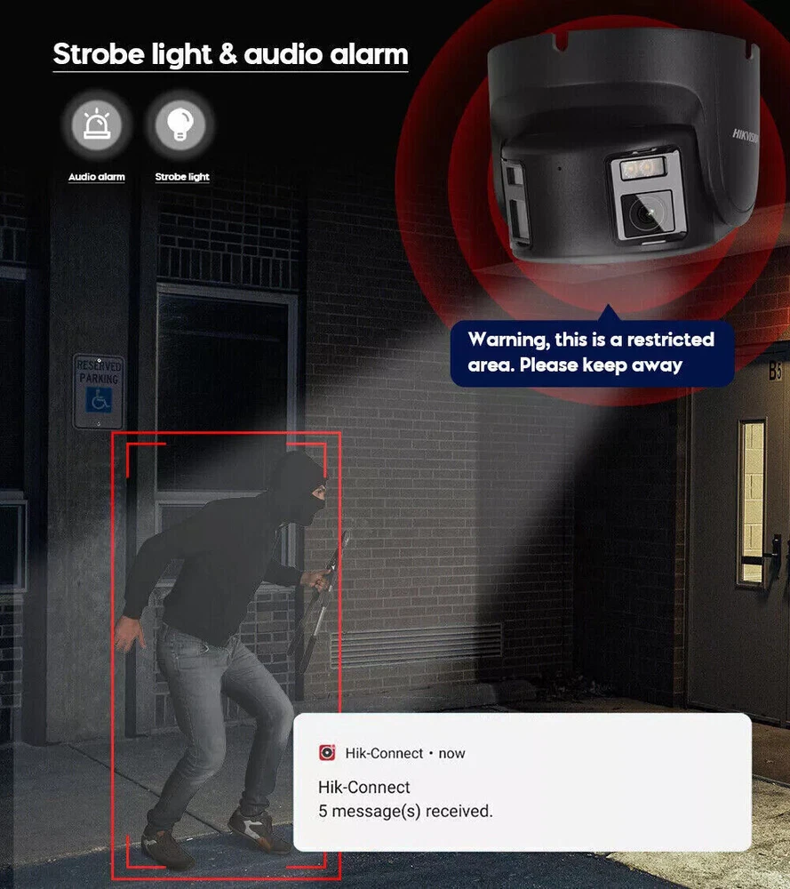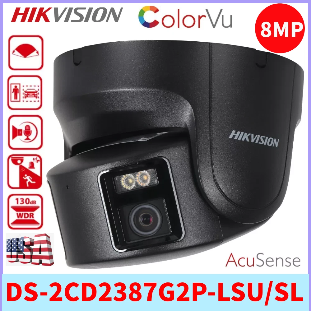 Product Description Features: High quality imaging with 8 MP resolution One image that presents all the scenes covered by the camera 24/7 colorful imaging Efficient H.265+ compression technology Clear imaging against strong back light due to 130 dB WDR technology Focus on human and vehicle classification based on deep learning Active strobe light and audio alarm to warn intruders off Water and dust resistant (IP67) Specifications: Camera Image Sensor 2 × 1/1.8" Progressive Scan CMOS Max. Resolution 5120 × 1440 Min. Illumination Color: 0.0005 Lux @ (F1.0, AGC ON),0 Lux with light Shutter Time 1/3 s to 1/100,000 s Angle Adjustment Pan: -30° to 30°,tilt: -75° to 75° Lens Lens Type Fixed focal lens, Dual lens: 4 mm Focal Length & FOV 4 mm, horizontal FOV: 180°, vertical FOV: 44° Lens Mount M16 Iris Type Fixed Aperture F1.0 Depth Of Field 3.6 m to ∞ DORI DORI 4 mm, D: 77 m, O: 30 m, R: 15 m, I: 7 m Illuminator Supplement Light Type White Light Supplement Light Range Up to 30 m Smart Supplement Light Yes Video Main Stream When WDR is On: 50 Hz: 12.5 fps (5120 × 1440) 60 Hz: 15 fps (5120 × 1440) When WDR is Off: 50 Hz: 20 fps (5120 × 1440) 60 Hz: 20 fps (5120 × 1440) Sub-Stream When WDR is On: 50 Hz: 12.5 fps (1920 × 536, 960 × 272) 60 Hz: 15 fps (1920 × 536, 960 × 272) When WDR is Off: 50 Hz: 20 fps (1920 × 536, 960 × 272) 60 Hz: 20 fps (1920 × 536, 960 × 272) Video Compression Main stream: H.265+/H.265/H.264+/H.264 Sub-stream: H.265/H.264/MJPEG Video Bit Rate 32 Kbps to 16 Mbps H.264 Type Baseline Profile,Main Profile,High Profile H.265 Type Main Profile Bit Rate Control CBR,VBR Scalable Video Coding (SVC) H.264 and H.265 encoding Region Of Interest (ROI) 1 fixed region(s) for main stream Audio Audio Type Mono sound Audio Compression G.711/G.722.1/G.726/MP2L2/PCM/MP3/AAC-LC Audio Bit Rate 64 Kbps (G.711ulaw/G.711alaw)/16 Kbps (G.722.1)/16 Kbps (G.726)/32 to 192 Kbps (MP2L2)/8 to 320 Kbps (MP3)/16 to 64 Kbps (AAC-LC) Audio Sampling Rate 8 kHz/16 kHz/32 kHz/44.1 kHz/48 kHz Environment Noise Filtering Yes Network Protocols TCP/IP, ICMP, HTTP, HTTPS, FTP, DHCP, DNS, DDNS, RTP, RTSP, NTP, UPnP, SMTP, IGMP, 802.1X, QoS, IPv6, UDP, Bonjour, SSL/TLS, PPPoE, SNMP, WebSocket, WebSockets Simultaneous Live View Up to 6 channels API Open Network Video Interface (Profile S, Profile G, Profile T),ISAPI,SDK,ISUP User/Host Up to 32 users 3 user levels: administrator, operator, and user Security Password protection, complicated password, HTTPS encryption, 802.1X authentication (EAP-MD5), watermark, IP address filter, basic and digest authentication for HTTP/HTTPS, WSSE and digest authentication for Open Network Video Interface, RTP/RTSP over HTTPS, control timeout settings, security audit log, TLS 1.2, host authentication (MAC address) Network Storage NAS (NFS, SMB/CIFS),Auto Network Replenishment (ANR),NVR, Together with high-end Hikvision memory card, memory card encryption and health detection are supported. Client iVMS-4200,Hik-Connect,Hik-Central Web Browser Plug-in required live view: IE 10, IE 11 , Plug-in free live view: Chrome 57.0+, Firefox 52.0+, Local service: Chrome 57.0+, Firefox 52.0+ Image Image Parameters Switch Yes Image Settings saturation,brightness,contrast,sharpness,gain,white balance,adjustable by client software or web browser Day/Night Switch Day,Night,Auto,Schedule Wide Dynamic Range (WDR) 130 dB SNR ≥ 52 dB Image Enhancement BLC,HLC,3D DNR Interface Ethernet Interface 1 RJ45 10 M/100 M self-adaptive Ethernet port On-Board Storage Built-in memory card slot, support microSD/microSDHC/microSDXC/TF card, up to 256 GB Built-In Microphone Yes Built-In Speaker Max. power consumption: 1.2 W, max. sound pressure: 10 cm: 95 dB Audio 1 input (line in), terminal block, max. input amplitude: 3.3 Vpp, input impedance: 4.7 KΩ, interface type: non-equilibrium, 1 output (line out), terminal block, max. output amplitude: 3.3 Vpp, output impedance: 100 Ω, interface type: non-equilibrium Alarm 1 input, 1 output (max. 24 VDC, 1 A) Reset Key Yes Event Basic Event Motion detection (support alarm triggering by specified target types (human and vehicle)),alarm input and output,flashing alarm light output, audible alarm output, exception Smart Event Line crossing detection, intrusion detection, region entrance detection, region exiting detection (support alarm triggered by specified target types (human and vehicle)), scene change detection Linkage Upload to FTP/NAS/memory card,notify surveillance center,send email,trigger alarm output,trigger recording,trigger capture,audible warning,white light flashing Deep Learning Function Perimeter Protection Line crossing, intrusion, region entrance, region exiting (support alarm triggering by specified target types (human and vehicle)) General Power 12 VDC ± 25%, 0.79 A, max. 9.5 W,Ø5.5 mm coaxial power plug, PoE: 802.3af, Class 3, 36 V to 57 V, 0.29 A to 0.18 A, max. 10.5 W Material Base: metal, cover: metal Dimension Ø155 mm × 155.3 mm (Ø6.1 × 6.1\")" Package Dimension 230 mm × 230 mm × 230 mm (9" × 9" × 9") Approx. 1110 g (2.4 lb.) With Package Weight Approx. 1900 g (4.2 lb.) Storage Conditions -30 °C to 60 °C (-22 °F to 140 °F). Humidity 95% or less (non-condensing) Startup And Operating Conditions -30 °C to 60 °C (-22 °F to 140 °F). Humidity 95% or less (non-condensing) Language 33 languages: English, Russian, Estonian, Bulgarian, Hungarian, Greek, German, Italian, Czech, Slovak, French, Polish, Dutch, Portuguese, Spanish, Romanian, Danish, Swedish, Norwegian, Finnish, Croatian, Slovenian, Serbian, Turkish, Korean, Traditional Chinese, Thai, Vietnamese, Japanese, Latvian, Lithuanian, Portuguese (Brazil), Ukrainian General Function Anti-flicker, heartbeat, password reset via email, password protection, one-key reset Flashing Light Yes Approval EMC FCC: 47 CFR Part 15, Subpart B, CE-EMC: EN 55032: 2015, EN 61000-3-2:2019, EN 61000-3-3: 2013+A1:2019, EN 50130-4: 2011 +A1: 2014, RCM: AS/NZS CISPR 32: 2015, IC: ICES-003: Issu