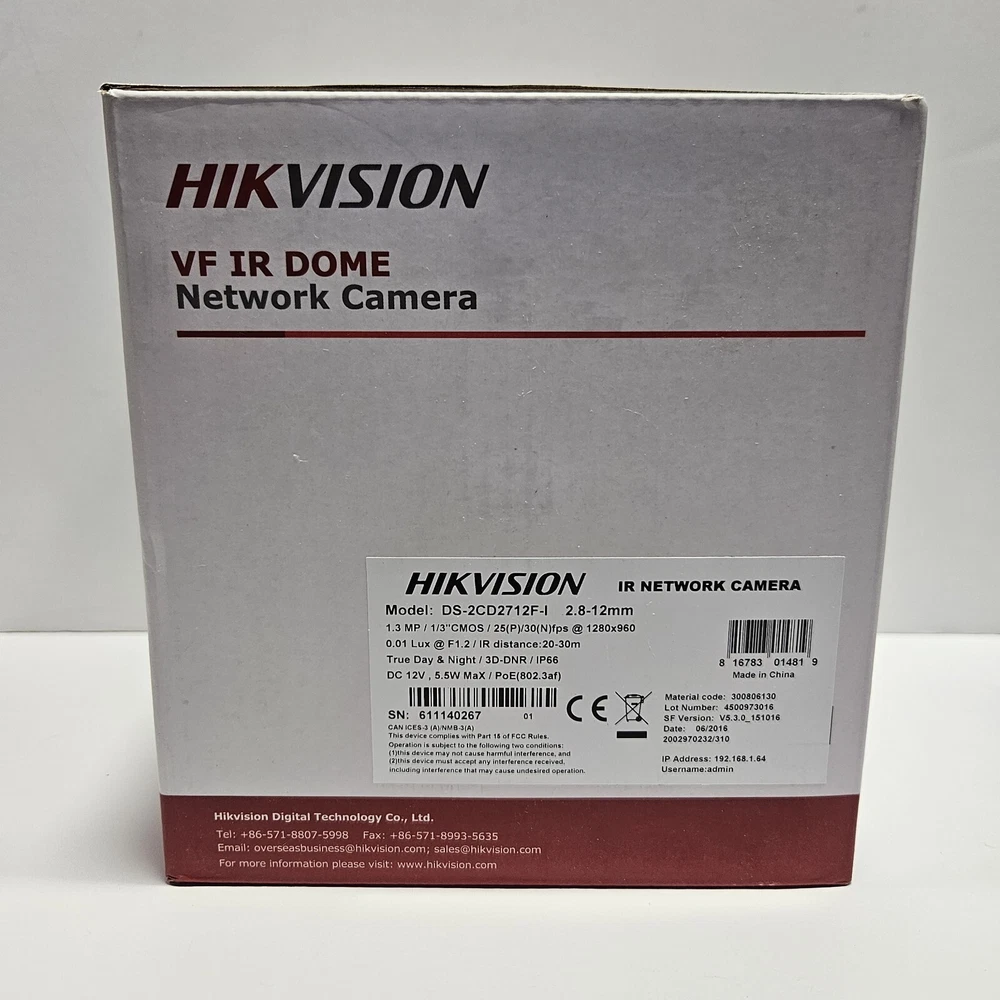 The Hikvision DS-2CD2712F-I is a network dome camera offering a resolution of up to 1.3 megapixels (1280x960) and features a 2.8-12mm varifocal lens. Equipped with IR LEDs, it provides night vision capabilities with a range of up to 20 meters, depending on the environment. Additionally, the camera is housed in a durable IP66-rated (weatherproof) and vandal-resistant casing.