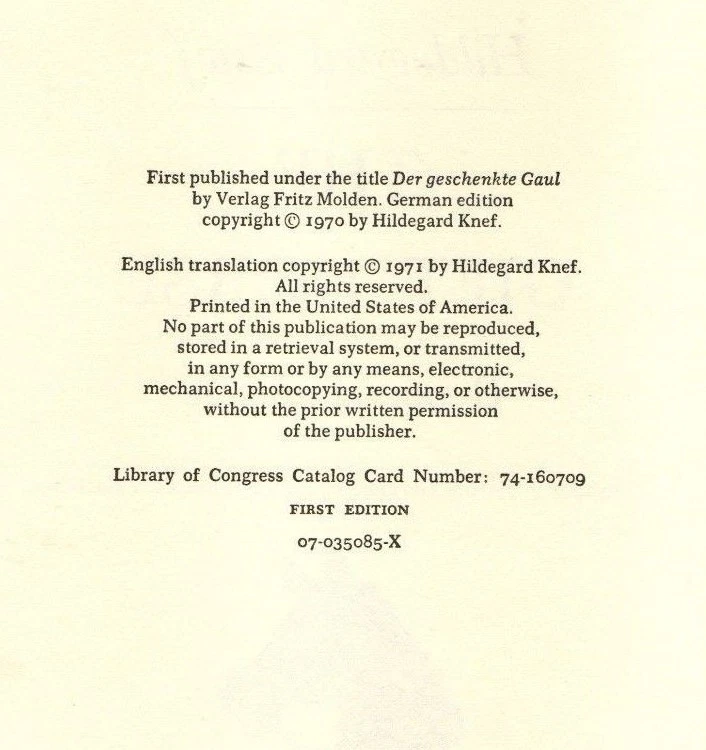 UP FOR sale IS A 1971 MCGRAW-HILL HARD COVER STATED FIRST EDITION ( NO PRINTING NO. LISTED) OF -' THE GIFT HORSE -A REPORT ON LIFE-' WRITTEN AND HAND SIGNED AND DATED BY THE MOST IMPORTANT POST WAR ACTRESS/SINGER HILDEGARD KNEF. PREVIOUS OWNER HAS WRIITEN NAME ON TOP OF FIRST BLANK PAGE- ALL OTHER INSIDE PAGES ARE IN EXCELLENT CLEAN CONDITON.(TOP OF PAGE EXTERIOR IS TANNED FROM AGE AND HAS A FEW SURFACE MARKS THAT DO NOT EFFECT INSIDE) OUTER STRUCTURE HAS LIGHT EDGE/CORNER WEAR. DUST JACKET IS IN GOOD CONDITION WITH A FEW VERY TINY TEARS AROUND EDGES AND ALSO HAS A CREASE ON INSIDE FLAP. HILDEGARD KNEF'S SIGNATURE IS VERY RARE. THANKS FOR LOOKING AND PLEASE CHECK OUT MY AUCTIONS AND STORE ITEMS. All S igned books featured have been purchased at bookstore signings or after the signing, book fairs, estate sales, and other reputable dealers. We do not issue individual certificates of authenticity, but do unconditionally guarantee that all signed books have been hand signed by the stated Author of the book and are not a copy or forgery. Shipping is free for media mail in the US only with a 4 - 8 day delivery time. U.S Flat Rate Priority mail is available at USPS rates with 3 - 5 day delivery time for US only. International shipping is by USPS First Class International mail only. Tracking number included. Items shipped within 24 hours after purchase on business days - Monday through Friday. Refunds given as money back less return postage upon safe return of item. Please contact if there is a problem so we can help. Not accepting best offers at this time.