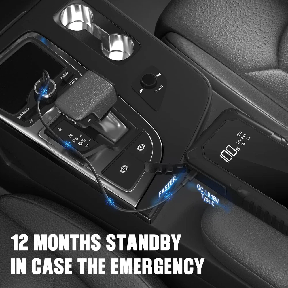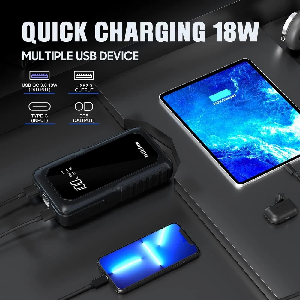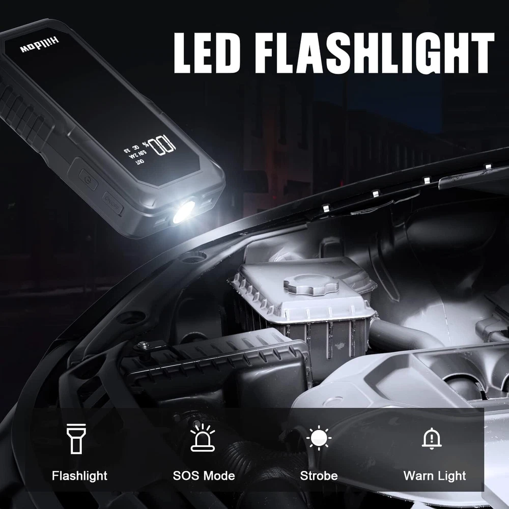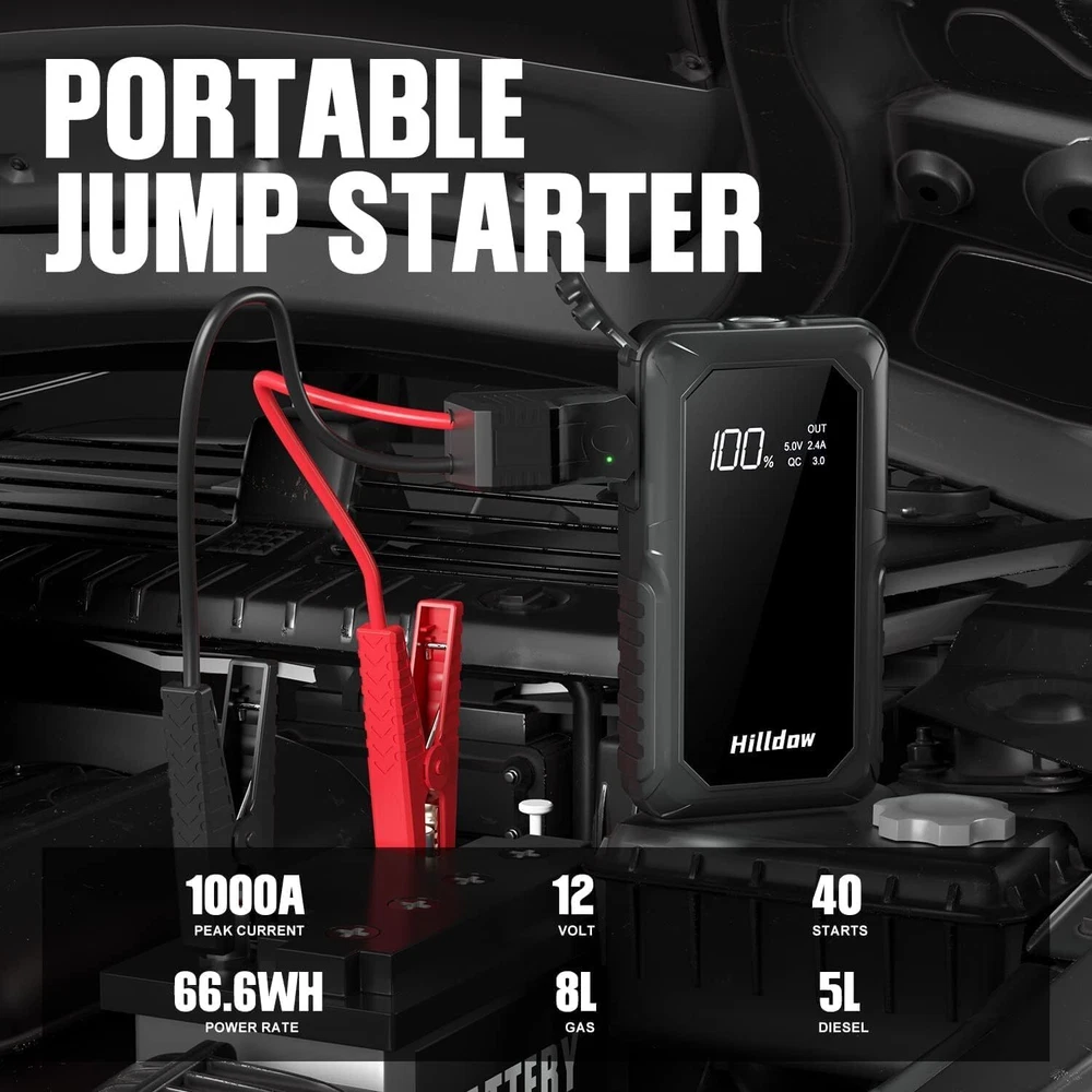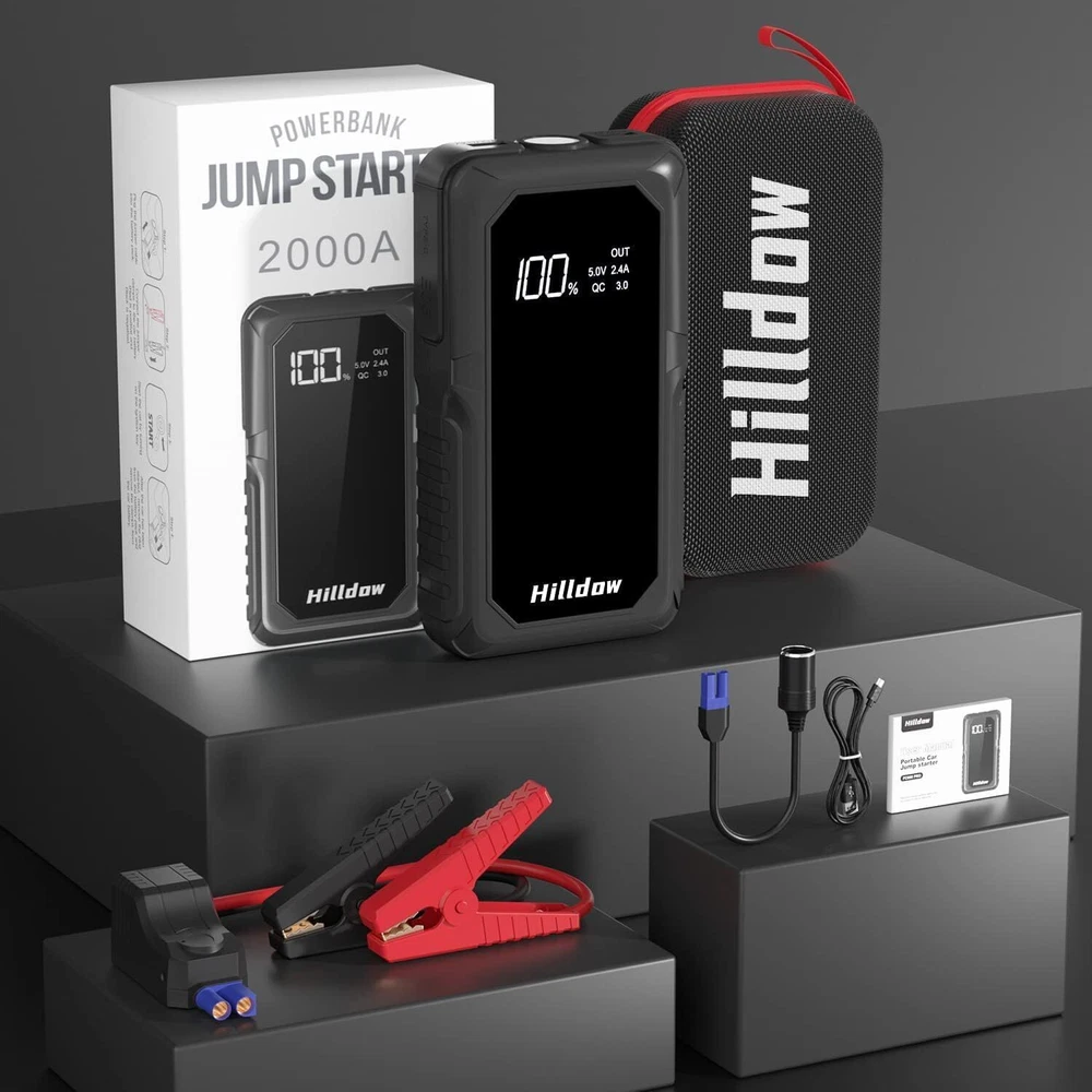 Hilldow Car Jump Starter 2000A Peak 66.6Wh (Up to 8L Gas or 5L FC600PRO Product Details Brand: Hilldow Product Dimensions: 1"D x 1"W x 1"H Item Weight: 0.43 Kilograms Amperage: 2000 Milliamps Peak Output Current: 2000 Amps Specification Met: UL Manufacturer: Shenzhen Yiyan intelligent Development Co., LTD Model: FC600 Pro Item Weight: 15.1 ounces Item model number: FC600 Pro Batteries: 1 Lithium Polymer batteries required. (included) Manufacturer Part Number: FC600 Pro Brand: Hilldow Product Dimensions: 1"D x 1"W x 1"H Item Weight: 0.43 Kilograms Amperage: 2000 Milliamps Peak Output Current: 2000 Amps Battery Cell CompositionVoltage: Lithium Polymer12 Volts Vehicle Service TypeBattery Capacity: All of the above12000 Milliamp Hours ⚡【Jump Starts Types of 12V Vehicle】safely jump starts a dead battery in seconds with this 2000A peak portable car jump starter - rated for gasoline engines up to 8 liters and diesel engines up ⚡【Safety Comes First】with UL standard certification and 10 advanced safety protection technologies (reverse polarity, reverse connection, over-current, overload, over-voltage, over-charge, over-discharge, short circuit), Hilldow jump starter ensures multiple protections. ⚡【Integrated 100-Lumen LED Flashlight】the jump starter battery pack utilizes bright LED flashlight with 4 modes (Strobe/Stable/SOS/Warning) under different circumstances. A car jumper comes in handy, will help you find ways in an emergency during trips. ⚡【LED-Screen Battery Power Indicator】our car battery can show the power balance at percentage on the LED screen - always know whether it's in need of being charged, giving you enough security when you're ready before a short trip or long journey. ⚡【Extreme Temperature Practicability】excellent performance on the resistance to extreme high and low circumstances - starts dead batteries at the temperature range of -4°F to 140° F. ⚡【5 in 1 Intelligent Jumper Clamp】Hilldow car jump starter Jumper Clamp has two detection functions, two protection functions and the booster function, which is able to detect the low voltage of the jump starter and damaged vehicle battery; to warn and protect the reverse polarity connection and reverse polarity; In addition, the boost function can greatly increase the peak current and start a dead battery. ⚡【More than an Instant Jump Starter】it’s also a high capacity battery powerbank for charging devices like your laptop, phone etc. With USB output (5V/2.4A) and QC 3.0 USB output (5V/3A, 9V/2A, 12V/1.5A) for powering any 12V USB devices.