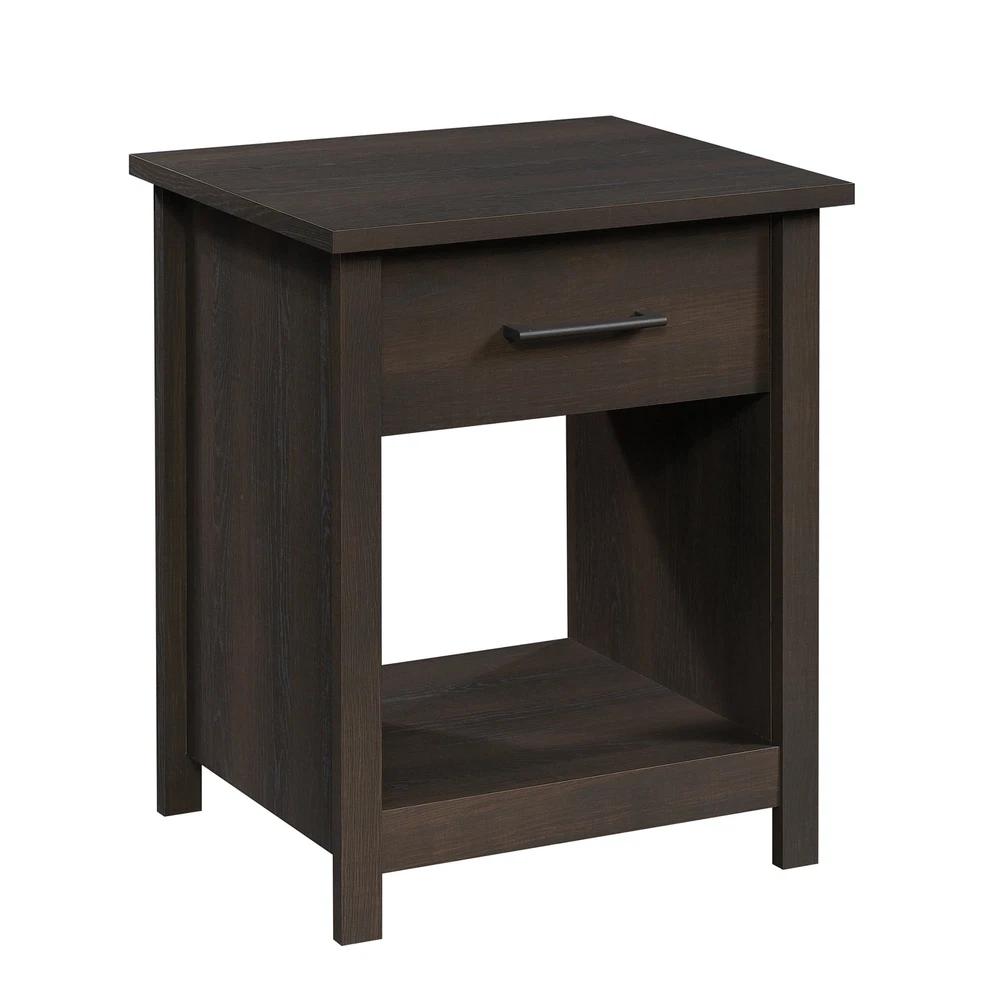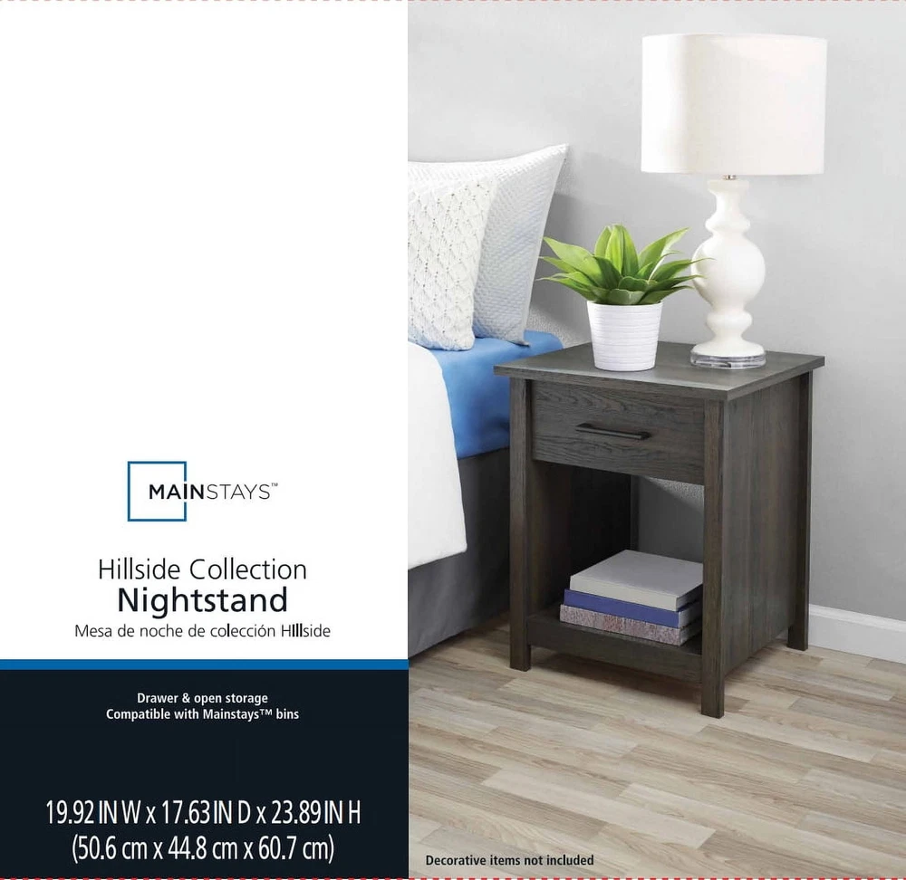 Give your bedroom a fresh look when you add the charming and functional design of this 1-drawer nightstand from the Hillside collection. This bedside table with storage offers a spacious top surface to set items like your alarm clock, table lamp, coasters, and smartphone. This nightstand with open storage includes a spacious drawer that provides easy access to remotes, your favorite book, and reading glasses. This nightstand with drawer is also compatible with bins to turn the open storage component into additional hidden storage. Even without a fabric bin, this nightstand with open storage can stash small pillows, stacks of books, or any decorative item you wish to put on display. A bedroom nightstand doesn't have to be hard to find. Finished in Espresso, combining style and function is what makes the Hillside single drawer nightstand a stand-out from others. Assembled Dimensions: 19.88" L x 17.64" W x 23.9" H Drawer and open storage Espresso finish Assembly Required Model #: 431314 Box Dimensions: 27.28" L x 20.55" W x 4.80" H For additional questions or any issues, please contact the manufacturer at 1-800-523-3987 Be sure to check out the Hillside collection for more great items!