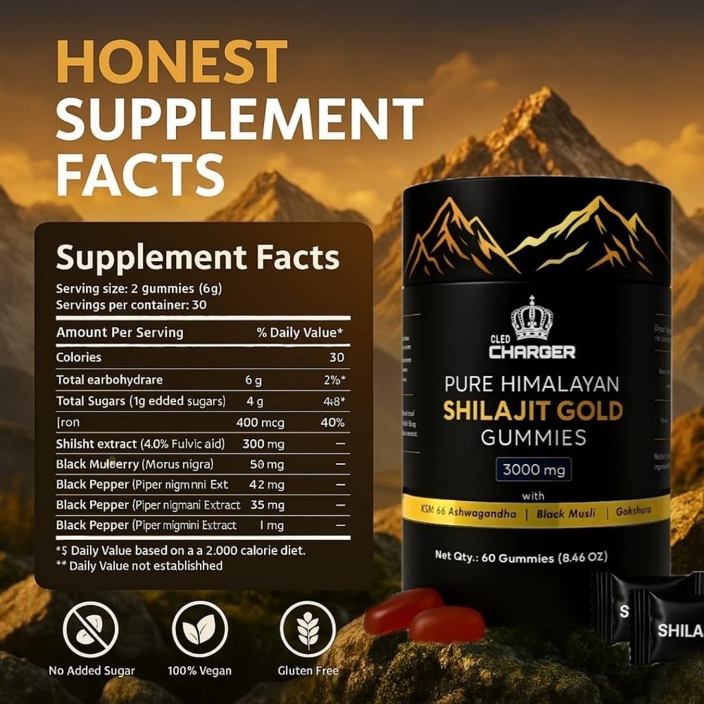 Organic Pure Himalayan Shilajit Gummies Gold, with Ksm 66 Ashwagandha, Gokshura 100% Natural | No Added Sugar Non-GMO | Fulvic Acid & 85+ Trace Minerals for Men, Women | 60 Gummies [SOURCED FROM THE HIMALAYAS] Harvested from the untouched Himalayan peaks at 18,000 ft, these gummies contain premium, gold-grade Shilajit resin. Developed using data-backed formulation, this high-purity supplement is your daily dose of trusted, powerful energy. 🧪 [LAB TESTED & QUALITY ASSURED] Each batch is lab-tested for heavy metals, fillers, and additives to ensure safety and purity. Made without added sugar, corn starch, glucose syrup, artificial colors, or gums, these gummies are 100% vegan, natural, and non-GMO. ❌【No Sugar, Clean Ingredients】 Formulated without added sugar, artificial colors, or preservatives. These vegan-friendly gummies are non-GMO, gluten-free, and made for clean daily supplementation. ⚡ [NATURE’S ENERGY BOOST] Packed with fulvic acid, humic compounds, and over 85+ trace minerals, these gummies naturally support energy, endurance, and overall vitality. No chemicals, no contaminants — just clean, plant-based performance support. 🧳Portable & Travel-Friendly: Each gummy comes individually wrapped, with 60 gummies in every pack—ideal for active routines, travel, and everyday wellness. Whether you're at the office, hitting the gym, or out and about, these convenient gummies offer a clean, hassle-free way to stay on track with your daily supplement needs—anytime, anywhere. 👫【For Men & Women】 Formulated to boost strength and endurance for all genders, promoting mental clarity, sustained energy, and balanced wellness in daily life Dosage: Take 2 gummies daily.