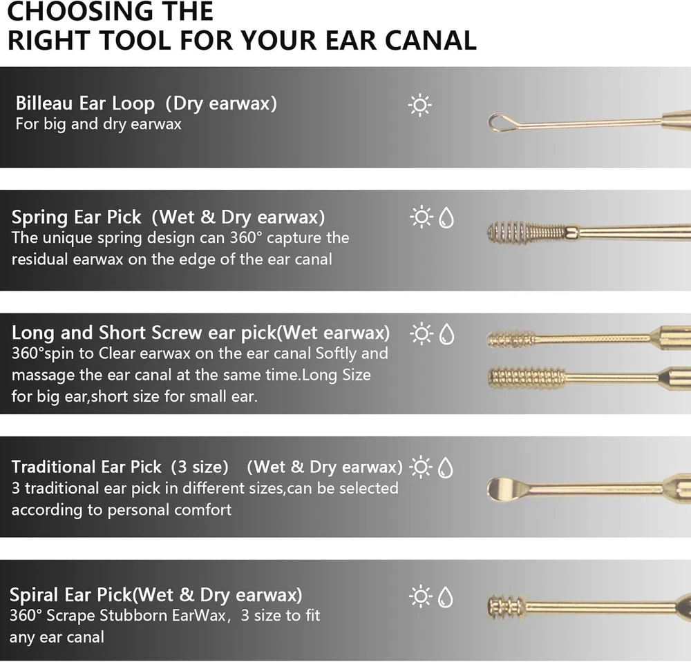 【Still hurting your ears with cotton swabs? 】Research shows cotton swabs are bad for removing earwax,they may further push the wax into the ear.The Hion Professional ear wax removal kit is made of 316L stainless steel,which will not rust,cause ear canal allergies,or infect the ear canal,and is easy to clean and sterilize.The nano-polishing process ensures that the surface of each ear scoop is smooth without sharp edges, preventing scratches and irritations. 【Professional Earwax Removal Tools】 Each ear pick is designed with double-head,and different ear scoops can be used together to remove Dry or Oil earwax perfectly,especially: spring ear picker, screw ear curette,and spiral ear wax remover can remove adhesions in the ear canal 360°The wet earwax on the inner wall massages the ear canal at the same time,and billeau ear loop can easily remove larger Dry earwax. 【Ergonomic Design & Reusable & Washable】Ergonomic handle and groove on the each earpick is designed for anti-slip grip,making the whole process of the ear cleaning safe.And make it easy and efficiently to clean your ears.Each kind of ears cleaner have different size to fit any different ear canal such small ear(kids and women),big ear(men).Come with a cleaning brush to clean the debris after use.and rinse them off thoroughly with soap and water fter use and wipe dry to reuse 【Beautifully Packaged & Ideal Gift】Come with a portable package box,The portable package box.This ear wax removal kit can be very good storage in the package case.So You don't need to worry losing tools when you need them next time.Suitable for daily home use or travel use.It's an ideal gift for your friends, family, colleagues, neighbors,elder etc. 【Purchase with Confidence】We pay great attention to the shopping experience of our customers.We guarantee you'll love this effective ear cleaning kit.please contact us if you're not satisfied with these earwax removal tools.Add ear pick earwax removal kit to your cart now! Product Description 3 Different Sizes of Traditional Ear Curette Choose the right size ear scoop to avoid scratching the ear canal: The Big Size ear curette suit for big ear such as Adult Men Ear Canal The Medium Size ear curette suit for women The Small Size ear curette suit for kid 3 Different Sizes of Spiral Ear Spoons Choose the right size ear scoop to avoid scratching the ear canal: The Long thread ear spoons suit for big ear such as Adult Men Ear Canal The Medium thread ear curette suit for women The Short thread ear curette suit for kid 2 Sizes of Screw Ear Scoops The Long thread ear spoons suit for big ear such as Adult Men Ear Canal The Short thread ear curette suit for kid Ergonomically designed handle Ergonomically designed handle, which is easier to grasp,making the entire ear removal process safer Diamond Convex Anti-Slip Design Make the ear scoop easy to grasp, not easy to slip, making the whole ear removal process safer Reusable & Washable Use the included cleaning brush to easily remove fines from ear scoops. Reusable after cleaning and sterilization, very economical Add to Cart Add to Cart Add to Cart Add to Cart Add to Cart Add to Cart Customer Reviews 4.3 out of 5 stars 2,188 4.3 out of 5 stars 1,059 4.3 out of 5 stars 1,059 4.3 out of 5 stars 1,059 4.3 out of 5 stars 1,059 4.3 out of 5 stars 1,059 Price $3.99 $ 3 . 99 $6.49 $ 6 . 49 $6.49 $ 6 . 49 $6.99 $ 6 . 99 $5.99 $ 5 . 99 $6.99 $ 6 . 99 Color Gold Black Siliver Gold Rose Gold Black Package Premium Plastic Box Waterproof Storage Bags Waterproof Storage Bags Tinplate stainless steel gift box Tinplate stainless steel gift box Tinplate stainless steel gift box Material 316L Stainless Steel 316L Stainless Steel 316L Stainless Steel 316L Stainless Steel 316L Stainless Steel 316L Stainless Steel Version Lite Pro Pro Pro+ Pro+ Pro+