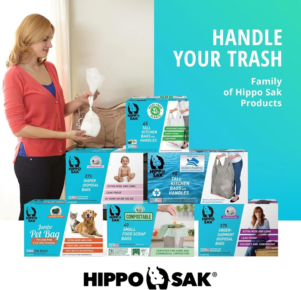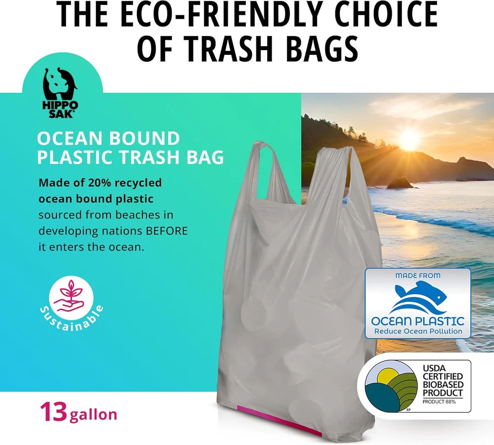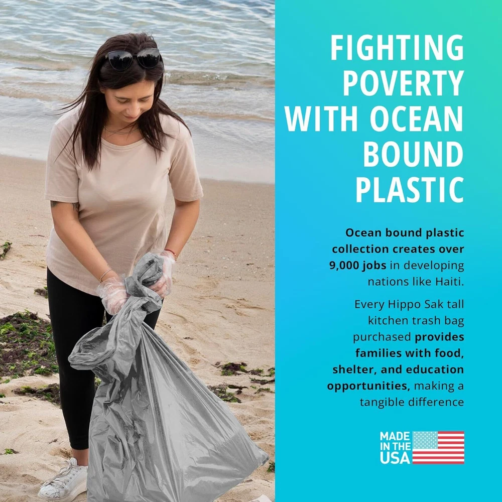 Hippo Sak - Tall Kitchen Garbage Bags with 90 Count (Pack of 1), Silver Product Details Brand: Hippo Sak Capacity: 13 Gallons Unit Count: 90 Count Recommended Uses For Product: Kitchen Waste Material Feature: Recyclable Color: Silver Material: Plastic Item Form: Bag Scent: Unscented Number of Items: 1 Item Weight: 4.51 Pounds Item dimensions L x W x H: 15.5 x 8.5 x 32 inches Net Content Weight: 4.51 Pounds Manufacturer: Hippo Sak Item Weight: 4.51 pounds Product Dimensions: 15.5 x 8.5 x 32 inches Size: 90 Count (Pack of 1) Item Package Quantity: 90 Batteries Included?: No Batteries Required?: No Brand: Hippo Sak Capacity: 13 Gallons Unit Count: 90 Count Recommended Uses For Product: Kitchen Waste Material Feature: Recyclable Color: Silver Material: Plastic Item Form: Bag Scent: Unscented Number of Items: 1 MADE FROM RECYCLED OCEAN BOUND PLASTIC: Our eco friendly garbage bags contain 20% recycled ocean bound plastic sourced from beaches in developing nations BEFORE it enters the ocean, making an eco-friendly choice that reduces plastic pollution and promotes sustainability FIGHTING POVERTY WITH OCEAN BOUND PLASTIC: Ocean bound plastic collection creates over 9,000 jobs in developing nations like Haiti. Every Hippo Sak tall kitchen trash bag purchased provides families with food, shelter, and education opportunities, making a tangible difference ERGONOMIC HANDLES: Lifting and tying our recycled ocean bound trash bags is a breeze. Stop struggling with drawstrings and enjoy easy, convenient handling with Hippo Sak tall kitchen bags with handles that securely grip the trash can for a mess-free experience UNBEATABLE STRENGTH AND DURABILITY: Made in the USA, our recycling ocean bound trash bags are 10 times stronger than the leading brands and puncture resistant. With a thicker design and 4-ply extra-wide handles, Hippo Sak eco friendly trash bags offer superior strength and durability to prevent leaks, tears, and spills KEEP GARBAGE CONTAINED: Our trash bags feature a patented PowerStrip reinforced bottom for extra strength to keep all your garbage where it belongs—in the bag. The innovative technology maintains bag integrity and cleanliness in your kitchen or home