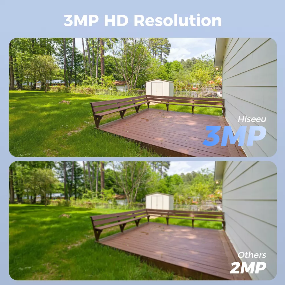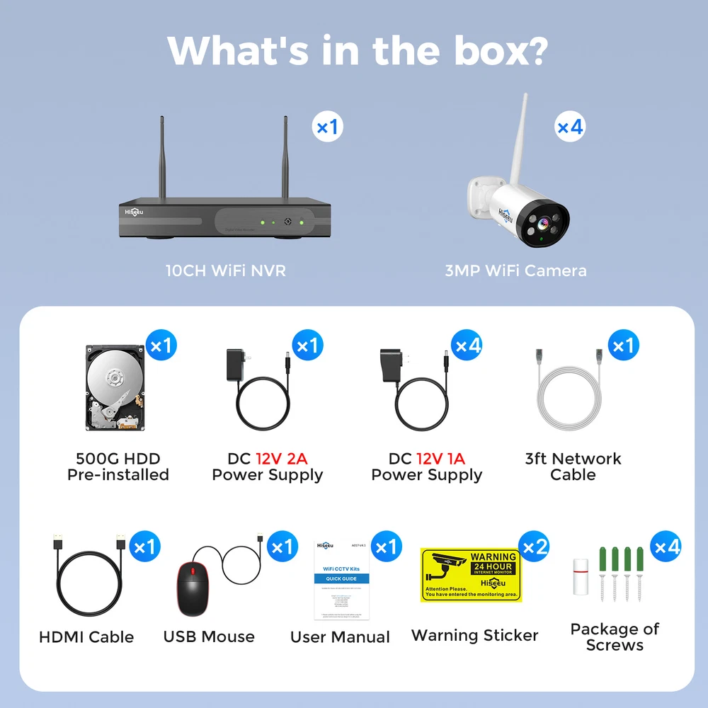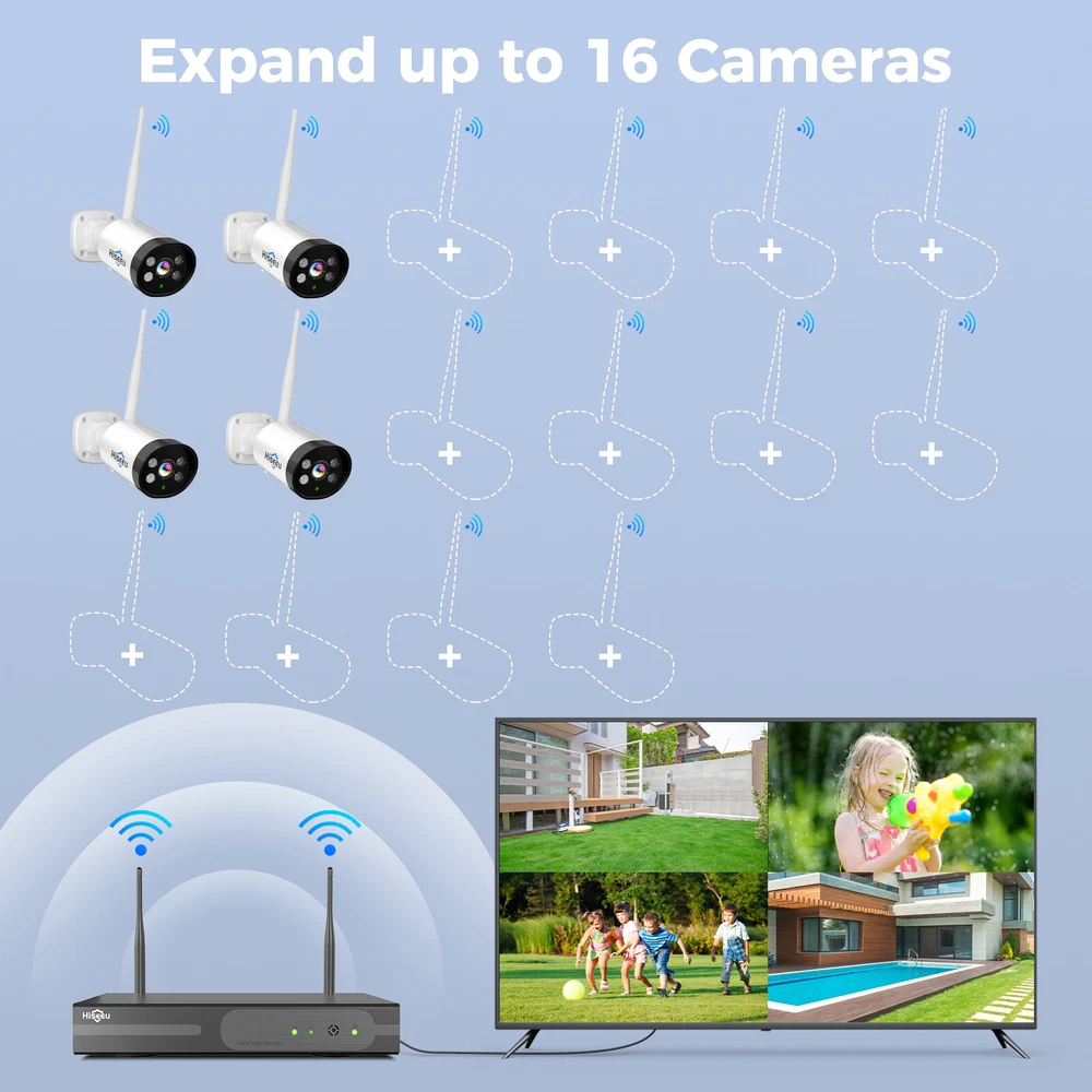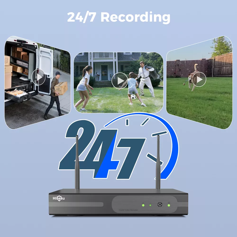 Please Noted: 1.this cctv system need 12V 1A power supply to charge it ! 2.this cctv system has been paired successfully ,if you want to add more than 4pcs cmaeras ,you need to use the cable to pair camera and NVR . 3.this camera is plastic casing. Please Noted: 1.this cctv system need 12V 1A power supply to charge it ! 2.this cctv system has been paired successfully ,if you want to add more than 4pcs cmaeras , you need to use the cable to pair camera and NVR . 3.this camera is plastic casing. 2K 3MP Super HD & 60 ft Night Vision 1/3'' CMOS sensor, digital WDR, ultra-clear 2K 3MP Super HD clarity regardless day or night. 4 powerful infrared&white LEDs deliver up to 60 ft/15 m night vision range. You may identify objects in any lighting condition. Get Notified of Person Detection Armed with advanced AI-based human detection, this cam alerts you to true threats only. Listen and Talk in Real Time-2 Way Audio Use two-way audio to respond to guests or warn off the unwanted from anywhere. Auto Pairing, Easy Connection Power on the cameras and NVR and all is done! No wiring and no complex configuration needed. Pls note ,this cctv system has been paired when pakcage in factory ,if you want to add more than 4pcs cameras to this cctv system ,you need to use the cable to pair camera with NVR. Expand up to 16pcs Cameras This NVR is 16 channel NVR ,it can be add up to 16pcs cameras .Hiseeu cameras protect your family every moment . 24/7 Continuous Recording This wireless system provides 24/7 non-stop recording even without network access. Plug the cameras & the NVR to the nearby outlets & all is done! For remote access & motion alerts, Internet is required. IP66 Waterproof Rating With IP66 weatherproof rating and plastic exterior, this camera is built tough enough to stand a variety of harsh weather conditions.
