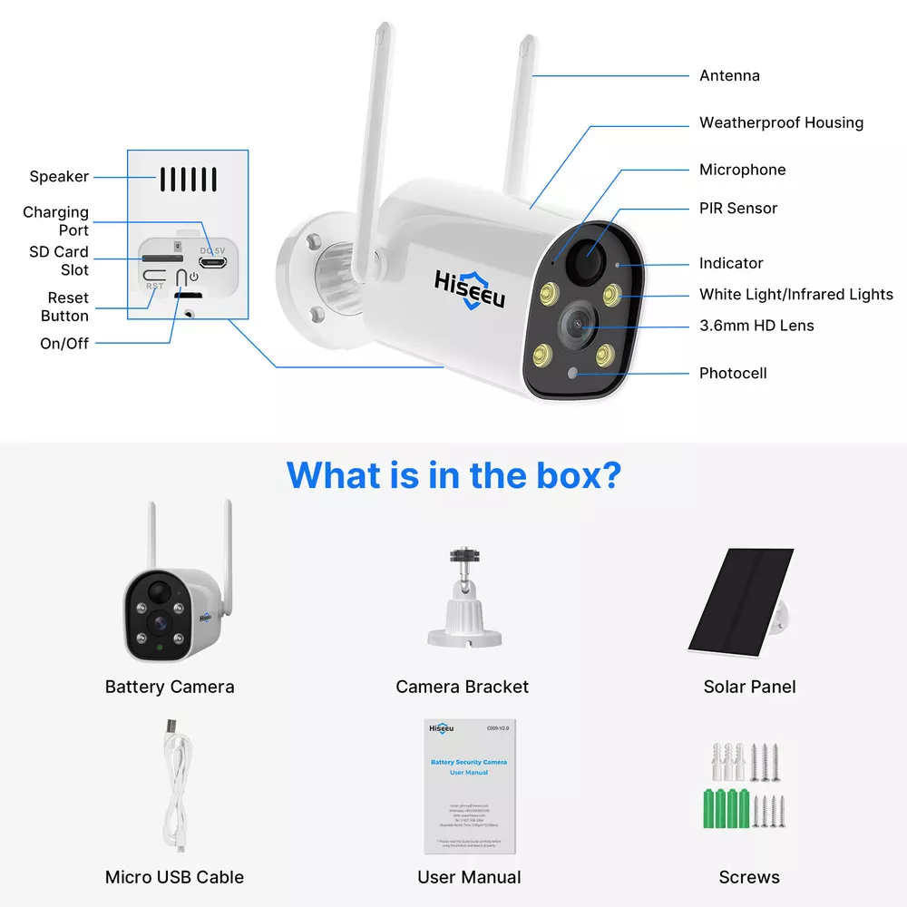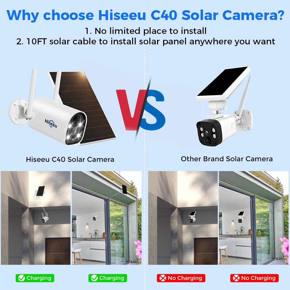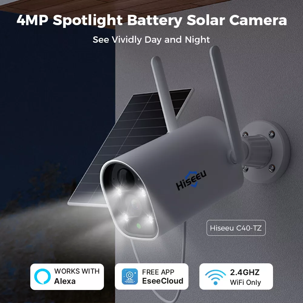 【100% Wire-Free Weatherproof Battery Powered Cameras】Wireless security camera system including 100% Wire-Free smart home battery powered security camera. 2K cameras, no monthly fee recorded in HDD.( Before installation, please connect camera to DC5V adapter for 13 hours to fully charge the battery.) NVR still need work with DC12V power cable. 【PIR Motion Detection & Floodlights】Only warm human body or mammal will be detected by PIR sensor, and it will push alarm to the App. Once the PIR sensor outputs a pulse signal, the camera will be activated and enter the recording state. If it has entered the night and the light around the camera is dim, the light sensor will activate the floodlight. 【Ultra Long Standby Time & Wireless Compact Design】 2 rechargeable batteries 9000mAh with solar panels Hiseeu 3MP Wireless Wifi Spotlight Battery Solar Camera CCTV System Kit Audio Item Features : 【100% Wire-Free Weatherproof Battery Powered Cameras】Wireless security camera system including 100% Wire-Free smart home battery powered security camera. 2K cameras, no monthly fee recorded in HDD.( Before installation, please connect camera to DC5V adapter for 13 hours to fully charge the battery .) NVR still need work with DC12V power cable. 【PIR Motion Detection & Floodlights】Only warm human body or mammal will be detected by PIR sensor, and it will push alarm to the App. Once the PIR sensor outputs a pulse signal, the camera will be activated and enter the recording state. If it has entered the night and the light around the camera is dim, the light sensor will activate the floodlight. 【Ultra Long Standby Time & Wireless Compact Design】 2 rechargeable batteries 9000mAh with solar panels are large enough for supporting a long time camera work few months(when triggered within 10 times/day). Wireless Connection and Invisible small size is easy to install it on outside or indoor for monitoring any unfriendly intruders and animals 【Preinstalled 1TB HDD Storage】System preinstalled with 1TB HDD, the camera will store the motion detection record in real time, not support 24/7 days continuous recording. Connect with network, allow to check those record on phone app "Eseecloud" or Computer software"Eseecloud". 【Two Way Audio & 8 Channel System】This is 8Channel dual WiFi 3MP network video recorder + 3Pcs 2K/3MP(2304 by 1296) IP66 waterproof 2-Way audio battery powered camera system, even on the other side of the globe, you can also hear and talk to people in front of the camera through the "Eseecloud" App.You can also add other model hiseeu cameras to meet your needs to monitor more areas. Cameras and NVR are paired before shipping. 【How to Record】Battery operated system only record in motion detection, not support 24/7 days continuous recording due to camera need save power. Motion detection recording will save more capacity of hard drive. 【How to Connect the System】The system needs connect with the TV monitor or computer monitor to show live stream(resolution need more than 1024*768), doesn't support connect to laptop(because both are video output) Item Specification : Smart Motion Detection -- PIR technology reduce false alarm, accurately sends you meaningful alerts in real time. IP66 Waterproof -- Strict waterproof test accords the international standard. Any weather conditions, keep safe 24/7. Stunning 3MP Resolution -- Hiseeu 3MP camera with 2304*1296 resolution, provide clearly image at anytime, wide angle than 1080P cameras. Clear Two-way Audio -- With the built-in waterproof microphone and speaker, live chat to experience intimate interactions. Work with Alexa -- Pair the camera with Alexa echo show, use a simple voice command to ask Alexa to view live stream. Remote Access Anytime and Anywhere -- Live view anywhere and share with families/friends simultaneously via the free "EseeCloud" App. Package list : Option 1: only 1pcs camera with power supply Option 2 : 3*cameras +NVR (installed 1TB HDD )+power supply Payment Delivery details Terms of sales About us Contact us Payment 1. All payments must be prepaid. 2. We only accept payment via Paypal. Please kindly check if you can pay via PayPal before placing order. Delivery details 1. packages will be sent out within the same day or 1 working days after the payment is received. 2. Orders place on the weekends will be shipped out on next Monday or Tuesday (holidays excluded). 3. Local pickup is not available. 4. We regret that we can not be responsible for any wrong or undeliverable addresses. 5. We'll pay for export custom tax,Buyer should pay for import custom tax if needed. Terms of sales 1. We automatically submit positive feedback to our buyers once the order is finished. 2. If you are satisfied with our product, please leave Positive Feedback , which means a lot to us, thanks in advance. 3. PleaseDo not leave Negative or Neutral Feedback before Contacting us, leave negative feedback can not solve any problem, but we will work with you to resolve those problems. 4. Please feel free to contact us viaEbay Message or E-mail.We generally reply messageswithin one business day, butexcept holidays. About us 1. We guarantee against any defective products. 2. We provide 30 days money back on non-defective, undamaged, unused and resalable products. Restocking fee and other fee may apply upon the condition of returned products. Shipping and handling fees are non-refundable. Product is not eligible for refund after the 14-day refund period is expired. 3. For any returned product, please contact us through ebay message firstly, we will work on resolving your particular case ASAP. Contact us If you have any question please feel free to contact us, we will respond within 1 business day or less, except holidays.