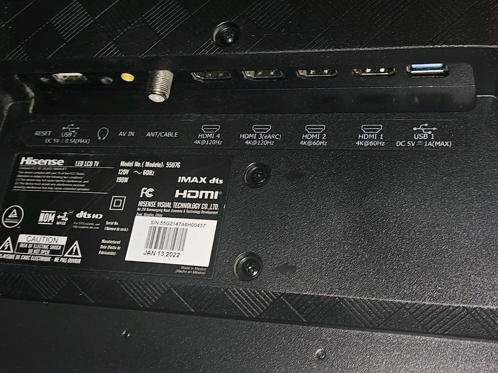The Hisense 55U7G is a 55-inch 4K UHD Smart TV with a Quantum Dot ULED display and a 120Hz native refresh rate. It utilizes Full Array Local Dimming with up to 90 local dimming zones for excellent contrast and deeper blacks. The TV supports multiple HDR formats, including Dolby Vision, HDR10, HDR10+, and HLG, providing a wide color gamut and good HDR performance. It's well-suited for gaming with features like Game Mode Pro, HDMI 2.1 inputs, ALLM, VRR, and FreeSync. The Hisense 55U7G runs on Android TV and offers a range of smart features like built-in Google Assistant and a voice remote. It boasts strong peak brightness for bright rooms and good reflection handling. Overall, the Hisense 55U7G is a well-rounded and good value TV, particularly for gamers. The TV has minor costmetic scratches on the back panel of the TV, but otherwise works as good as new. Will sell for $200 if you can pick it up in Denver, CO.