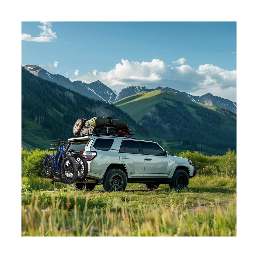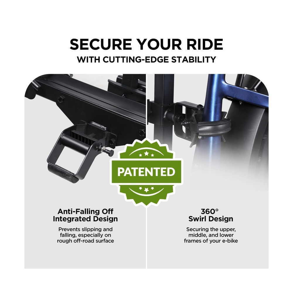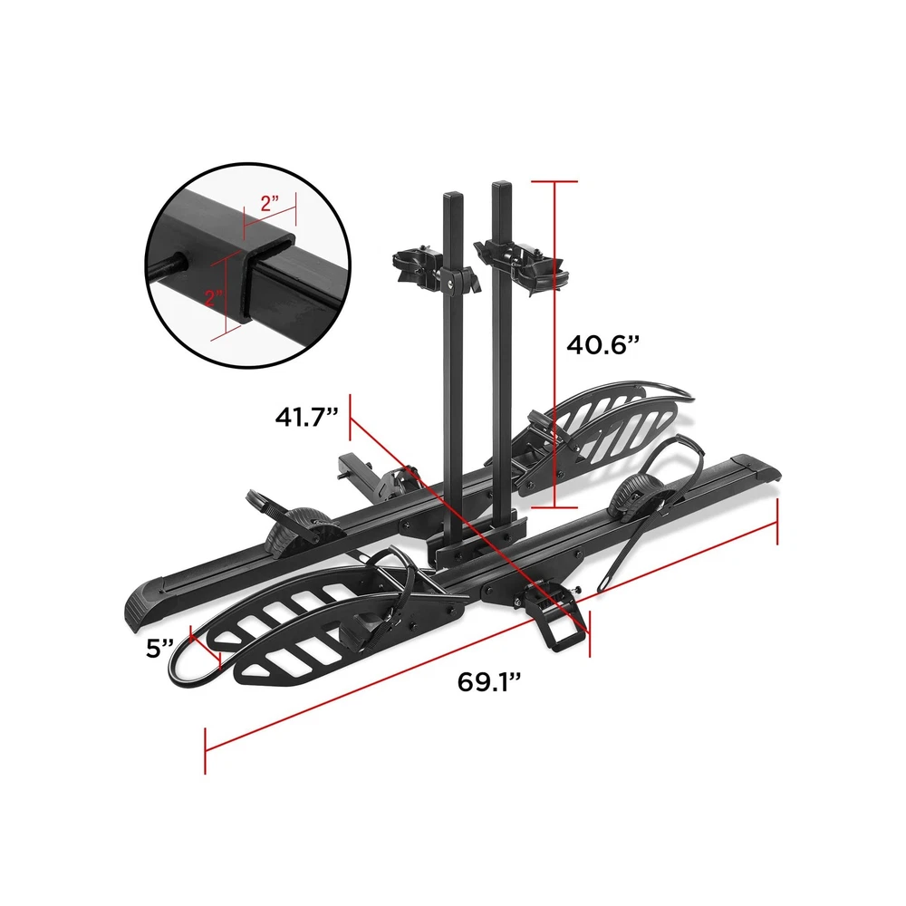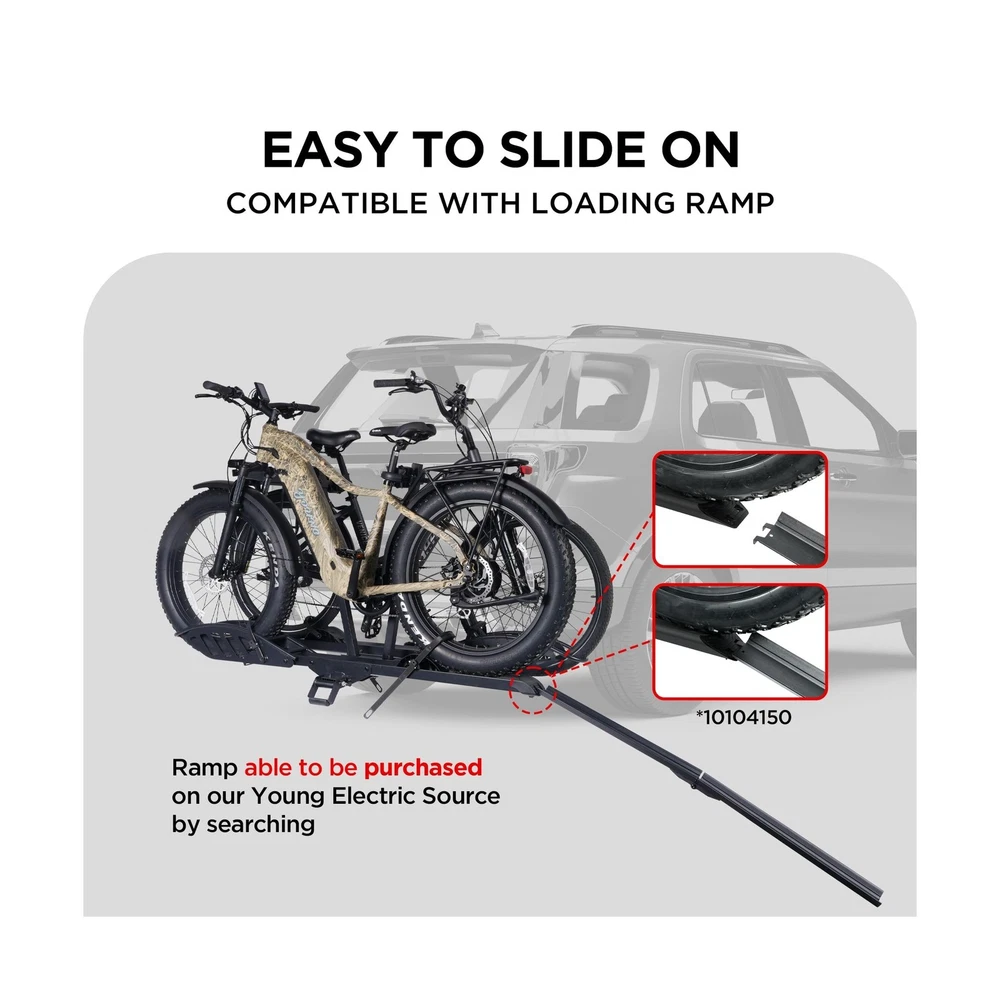 Hitch Mount 2 EBike Rack, 200 lbs Capacity Electric Bike Carrier Foldable Platform Mount, Up to 5-inch Fat Tire Bicycle for 2'' Receiver Cars Trucks SUVs Minivans RV, Trailer Description Features: SAFE AND SECURE ON OFFROAD: Comes with 2-arm fix, Anti-falloff 360 swirl structure, patent secure wheel cradles and anti-wobble structure, that secure your E-bikes in place without swaying and knocking against vehicle. 200 LB TOTAL CAPACITY: Easily transports up to 100 pounds per bike. Universal tire holders and wheel straps are compatible with e-bikes, mountain bikes, road bikes with up to 5 fat tires. USERS FRIENDLY: Convenient handle to lift. Easily folds up out of the way when not in use, Ideal for storage or when parking in a garage. SIMPLE ADATATION: Movable cradles for adapting to different types of bikes of lengths. Perfect fit most standard e-bikes, road bikes, mountain bikes and more, even kids bike. 2 INCH HITCH RECEIVER: ONLY fits vehicles with 2" receivers, the rack is sturdy and does not wobble easily. Most parts come pre-assembled for easy installation. Parts including hitch pins, instruction manual and hardware. Can be used with a ramp (not included in package), need to purchase the ramp separately!! Product Details: Color: Black Brand: Young Electric Item dimensions L x W x H: 41.73 x 69.13 x 40.66 inches Load Capacity: 2E+2 Pounds Mounting Type: U-Bolt Automotive Fit Type: Universal Fit Manufacturer: Young Electric Color: Black Brand: Young Electric Item dimensions L x W x H: 41.73 x 69.13 x 40.66 inches Load Capacity: 2E+2 Pounds Mounting Type: U-Bolt Automotive Fit Type: Universal Fit Manufacturer: Young Electric Model: Bike rack Item Weight: 66.1 pounds Product Dimensions: 41.73 x 69.13 x 40.66 inches Item model number: 10104118-2 Manufacturer Part Number: 10104118-2 Date First Available: May 9, 2025 Delivery We Do Not Ship Outside of the Continental US. Return Policy All items qualify for returns within 30 days of receipt. Buyer is responsible for return shipping on any item that is not damaged. Feedback We take our reputation seriously, we buy and sell online, so we understand the value of trust. If you are unsatisfied with your order, please contact us and we will work with you to resolve it to your satisfaction.