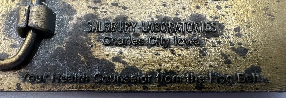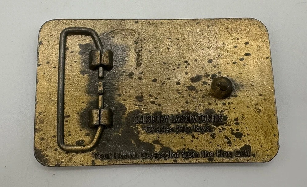 This vintage brass belt buckle features a unique design with the words "Your Health Counselor From The Hog Belt" and a picture of a hog. It is made by Salsbury Laboratories and has an Art Deco style. The color of the buckle is bronze and it is original, not a reproduction. The material used is brass, which adds to its durability and long-lasting quality. The belt buckle is suitable for adults and is a great addition to any vintage accessories collection. Its exact decade of origin is unknown, but it has a timeless appeal that will never go out of style. This item would make a fantastic gift for anyone who appreciates vintage fashion or unique pieces of art.