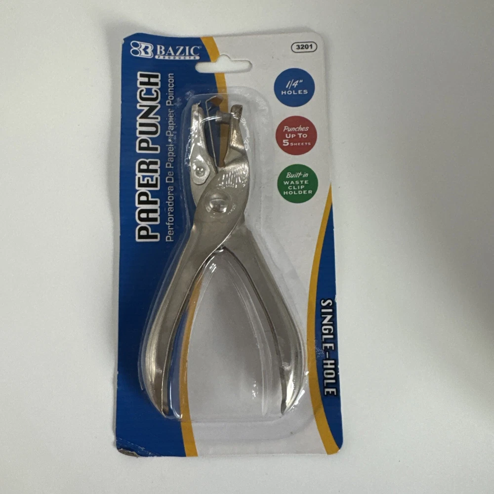 The product is a 1 pack of paper punch by the brand Bazic. It is designed with a theme of tools and is manufactured in the United States. The hole punch is sealed and collects the dots to prevent messes, making it suitable for use in schools, crafts, and offices. This tool is ideal for scrapbooking and paper crafts, providing a convenient solution for creating clean and precise holes in paper materials.