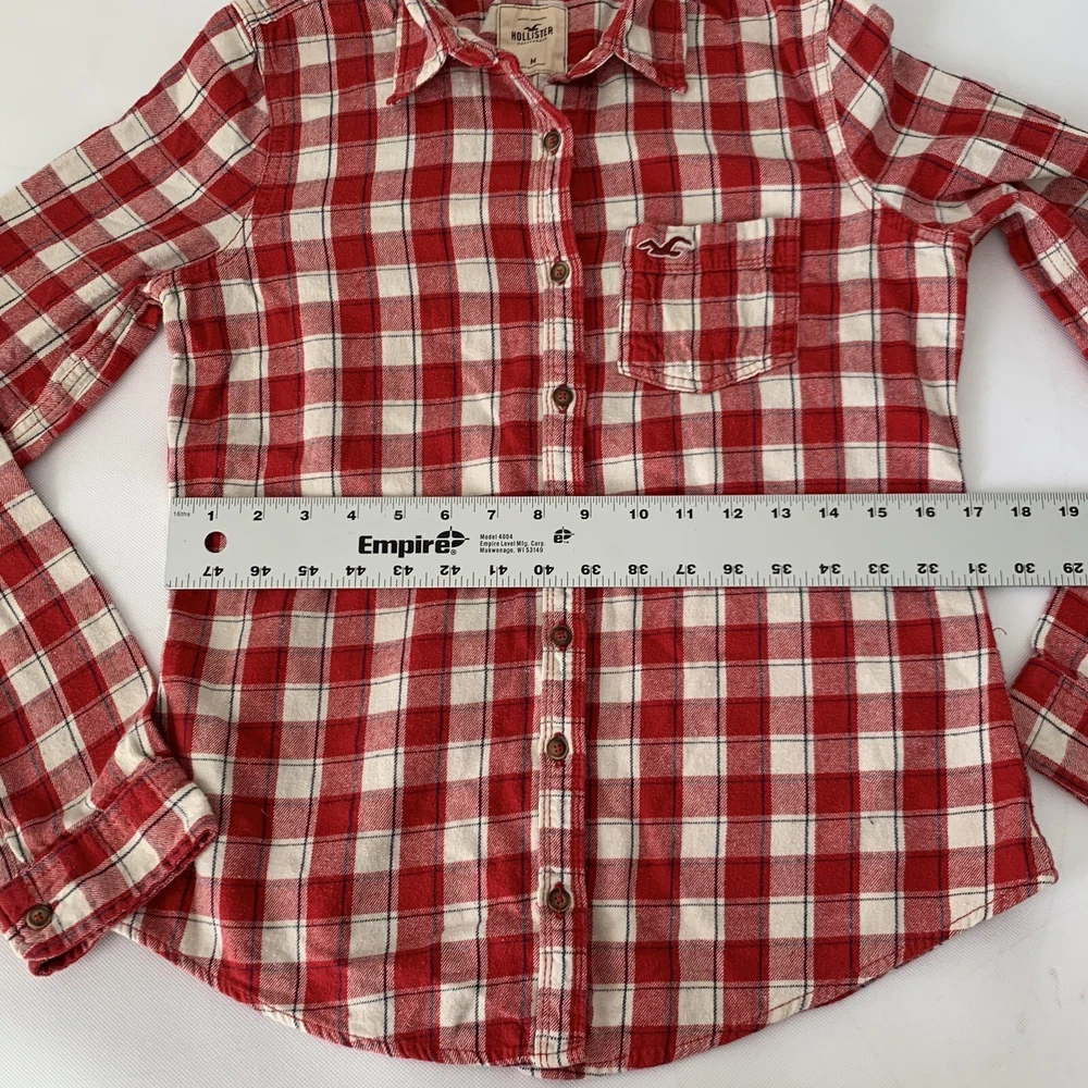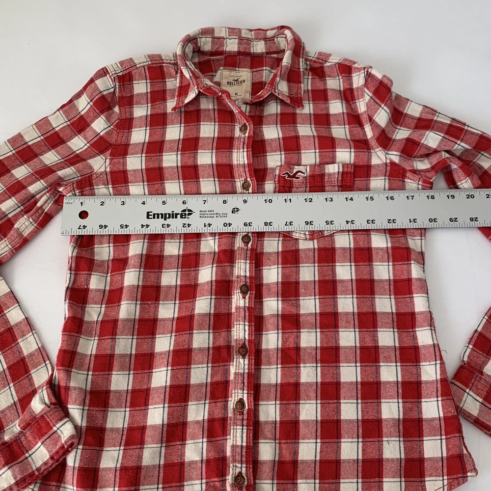 Hollister Flannel Button Down Shirt Womens Medium M Red Cream Plaid Button Down Long Sleeve Measurements: Please see photos above for all measurements for proper fit. We do the best we can with measurements. Compare your personal measurements or existing favorite clothing to the garment's measurements in the photos to make sure this is the garment for you. Great preowned condition. Please expect normal wear, this is a preowned item. View all photos for proper expectation of condition. This items ships within 1-3 business days Offers welcome. Tags: everyday fashion stylish trendy classic spring summer fall winter seasons apparel comfy comfortable easy to wear classy casual favorite country cowgirl cowboy farm leaves autumn