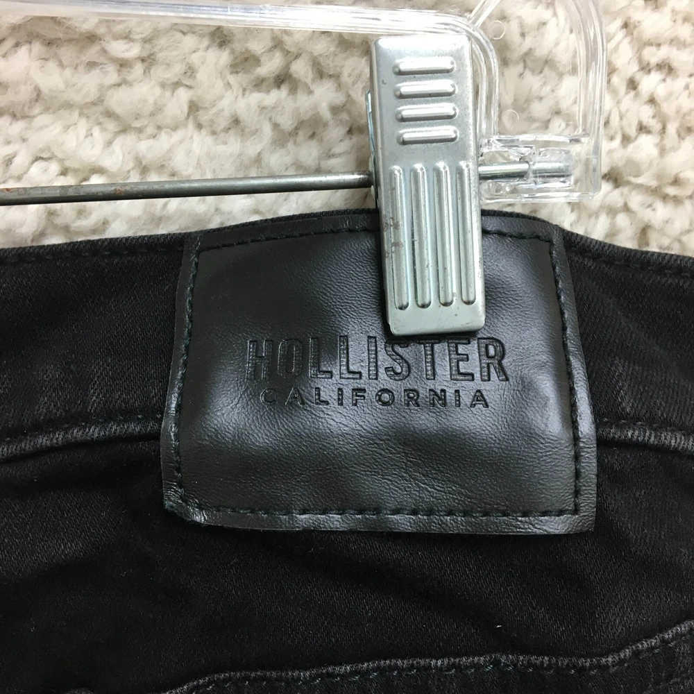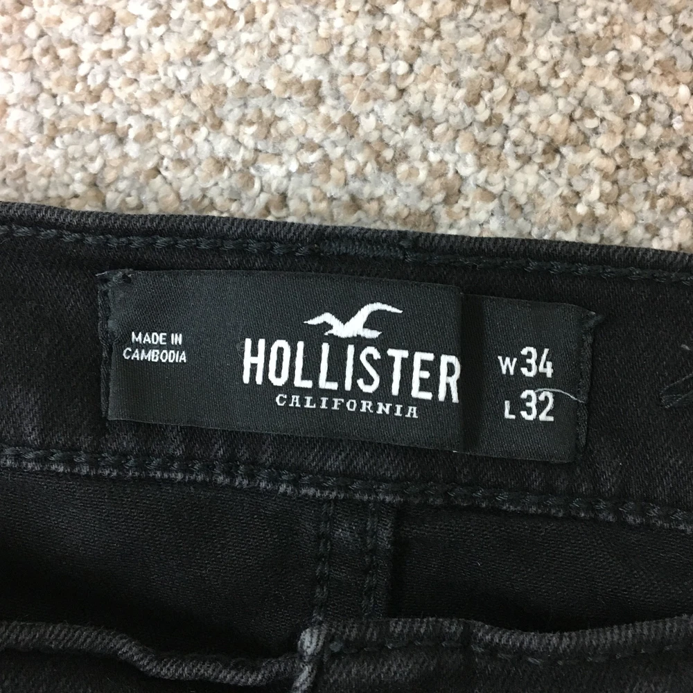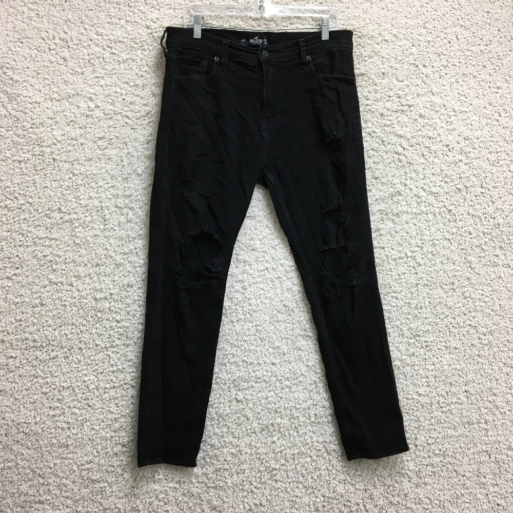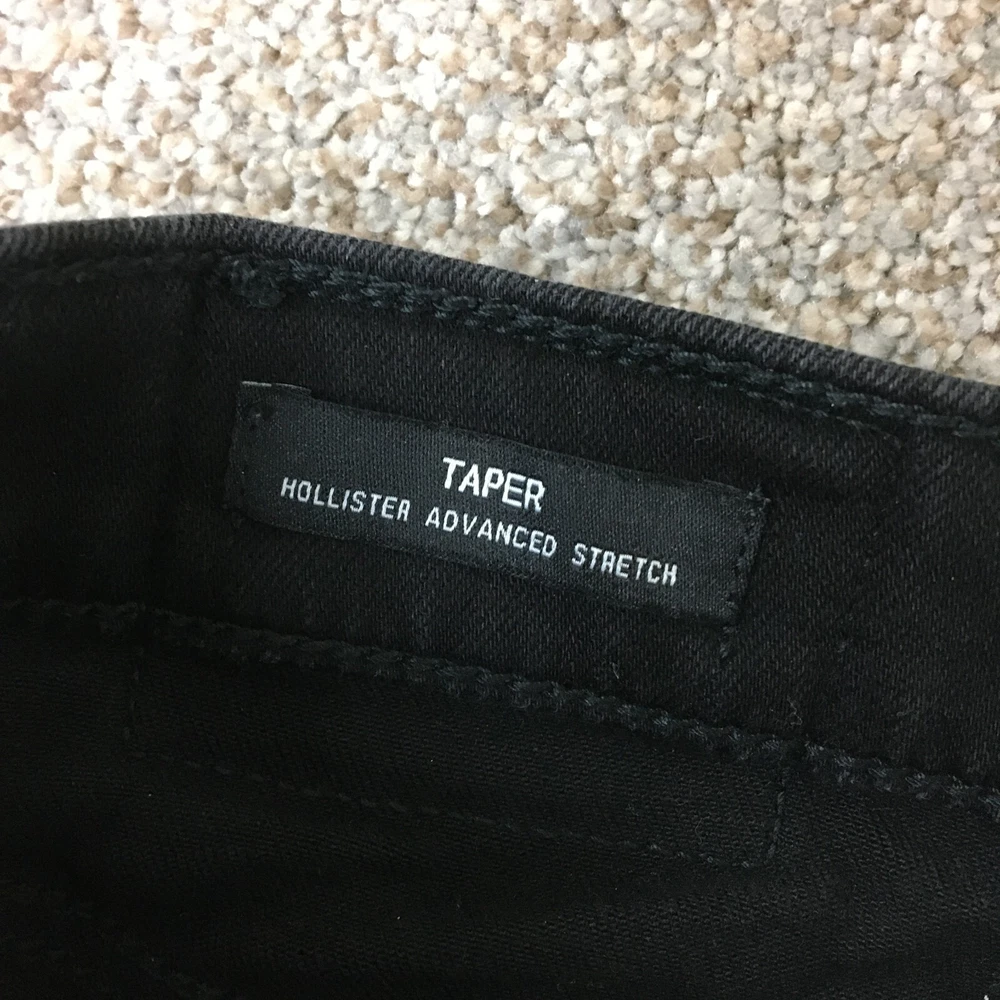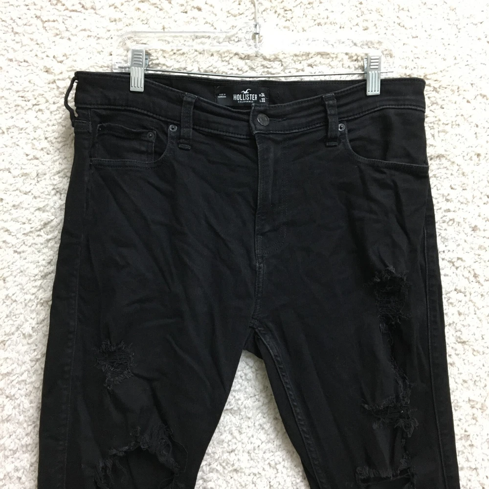 Waist Size: 34 in Features: Breathable, Comfort, Stretch Color: Black Fabric Type: Denim Size Type: Regular Department: Men Closure: Button, Zip Size: 34 Inseam: 30 in UPC: Does Not Apply Pocket Type: 5-Pocket Design Garment Care: Machine Washable Type: Jeans Accents: Button, Logo Fit: Regular gtin13: Does Not Apply Seller Notes: “Good Used Condition. Please, See Pictures for Full Condition and Measurements.” Material: Cotton, Cotton Blend, Polyester Rise: Mid (10-12 in) Country/Region of Manufacture: Cambodia Fabric Wash: Dark Season: Fall, Spring, Summer, Winter Style: Tapered Pattern: Solid Brand: Hollister