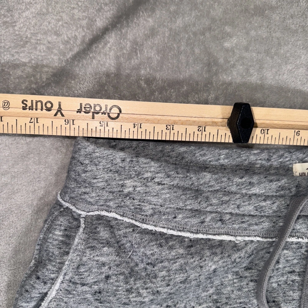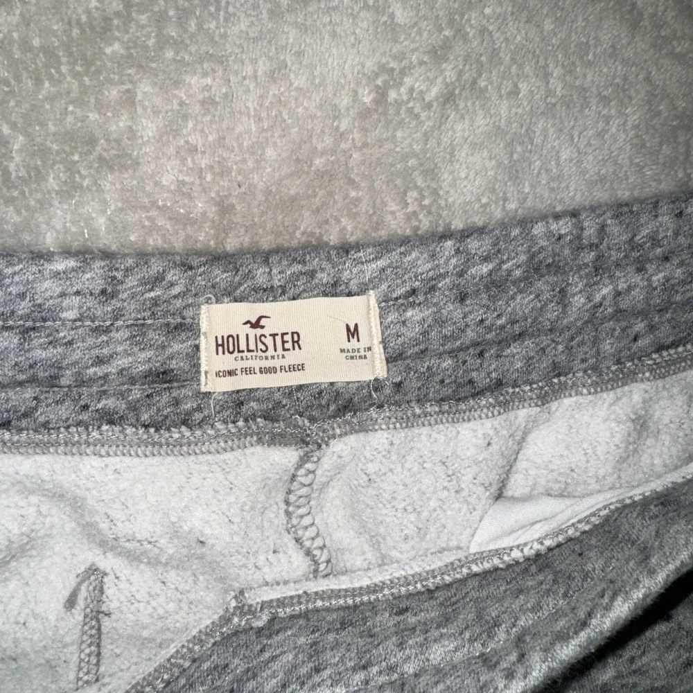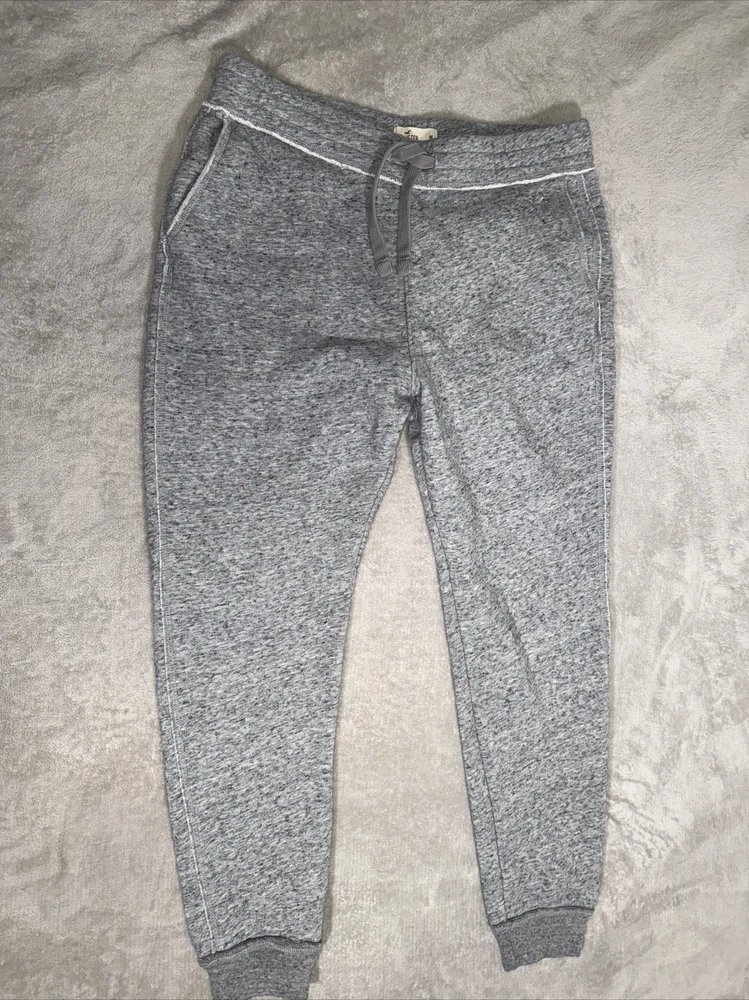 Up for sale is a pair of Hollister Men's Gray Joggers in size Medium. These joggers feature a drawstring closure and a flat front design, with a tapered leg style and a 27-inch inseam. They are made from a comfortable cotton blend fleece fabric, with solid patterning and logo accents. Perfect for a casual occasion, these joggers have pockets for your convenience and are sure to provide an iconic feel-good look. The brand name, Hollister, is known for its quality and regular fit, suitable for any man. Don't miss out on the opportunity to add these stylish pants to your wardrobe.