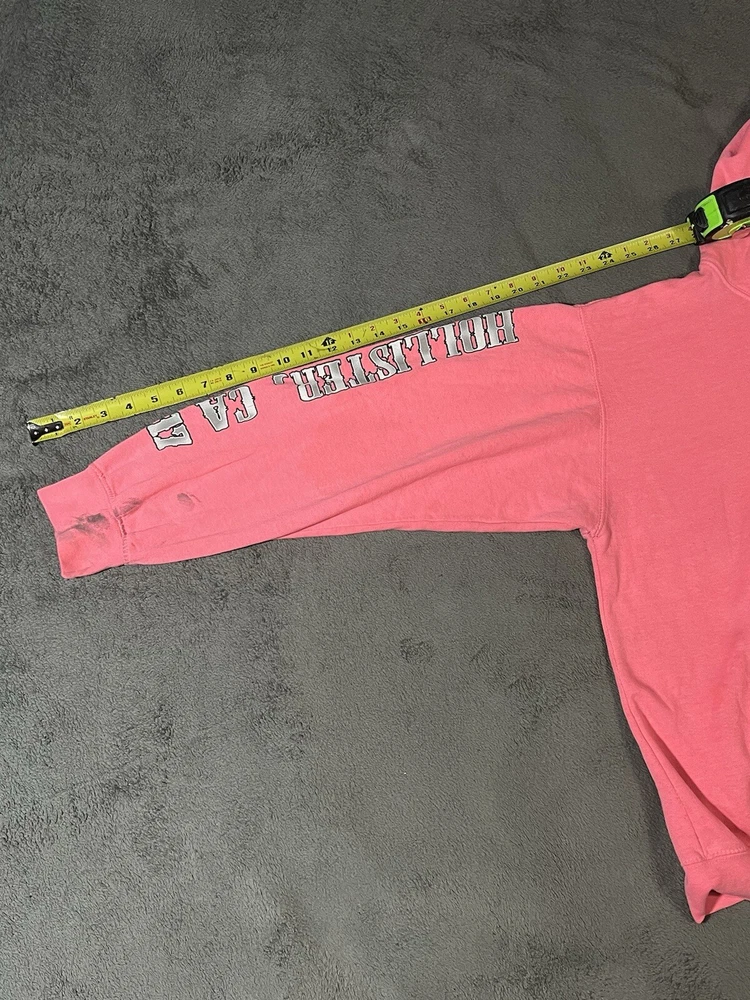 Rev up your style with this Hollister Motorcycle Week 2017 Hoodie. Featuring a pink graphic print with a scull character accent, this unisex hoodie is perfect for biker enthusiasts. The drawstring closure and hooded design add to its functionality, while the polyester and cotton material ensure comfort. The fleece fabric type and logo accents make this hoodie a great addition to your activewear collection. Whether you're hitting the road on your motorcycle or just hanging out with friends, this Esy Surf Co. brand hoodie is sure to turn heads. Available in size M, this pullover hoodie is suitable for both men and women.