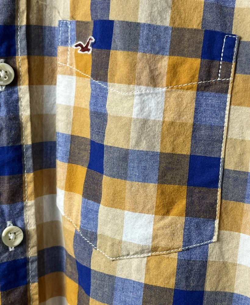 Hollister Shirt Long Sleeve Button Down Collar Blue white Yellow Plaid One Chest Pocket with Logo Men's Size Medium Chest 42, Length 29 Stretch cotton elastine