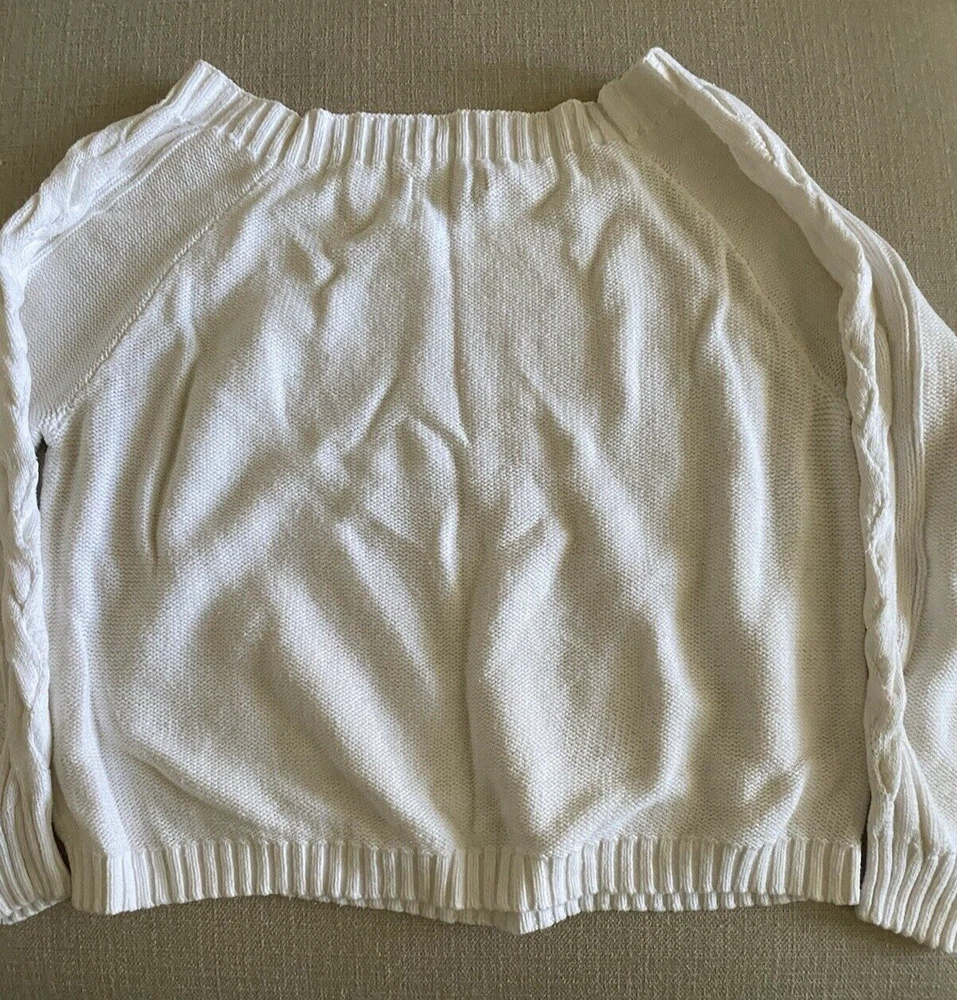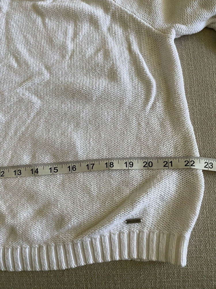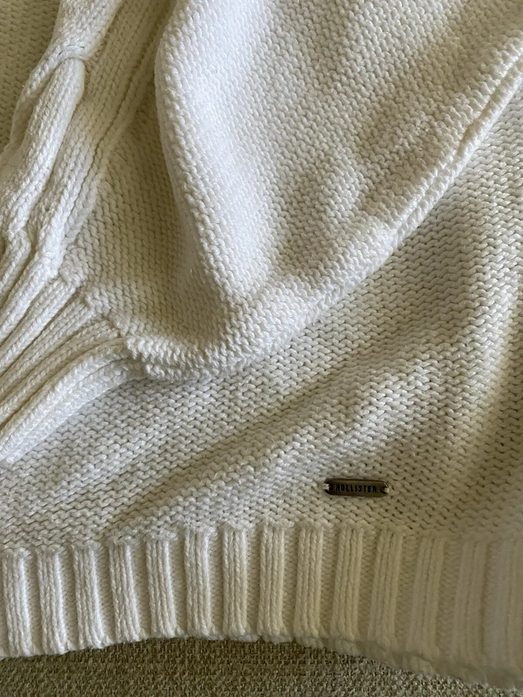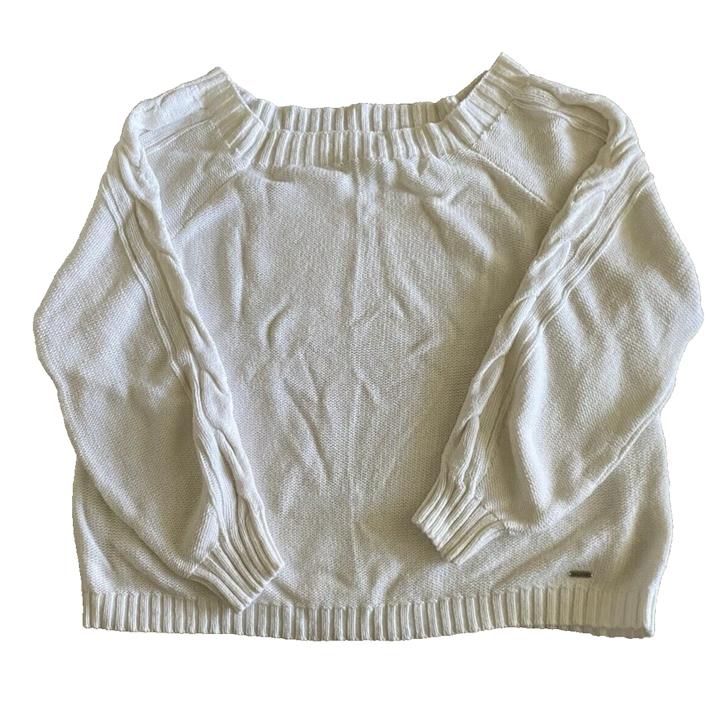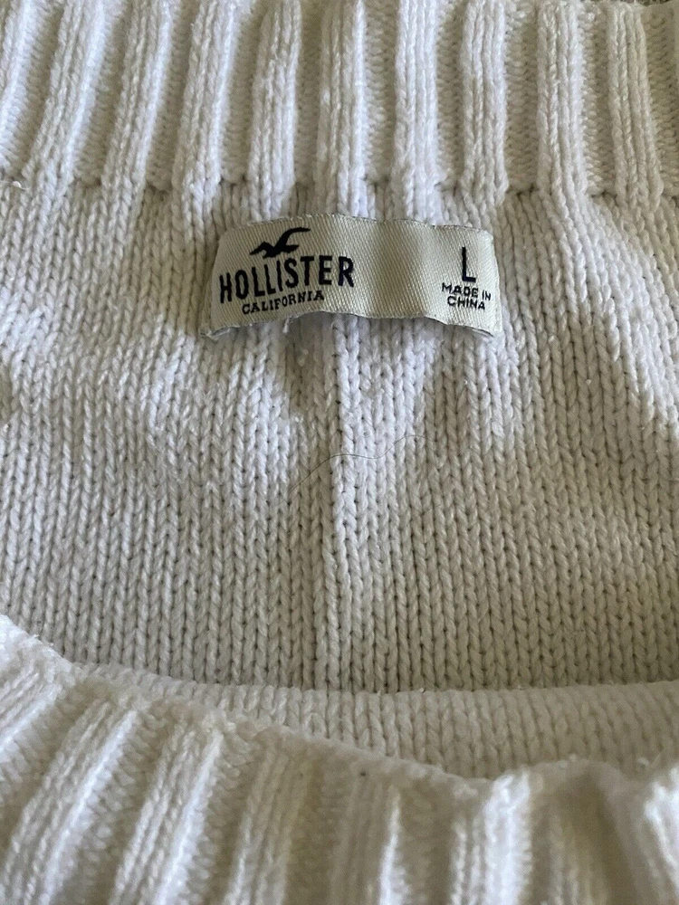 Hollister Sweater Womens Large White Scoop Neck Pullover Tight Knit Sweater Good pre-owned condition. No visible flaws. -60% Cotton/40% Acrylic -Cable Knit Pattern Down Sleeves -Machine Wash Cold -SKU E24-179 Questions? Please ask. Ships next business day. Offers welcome.
