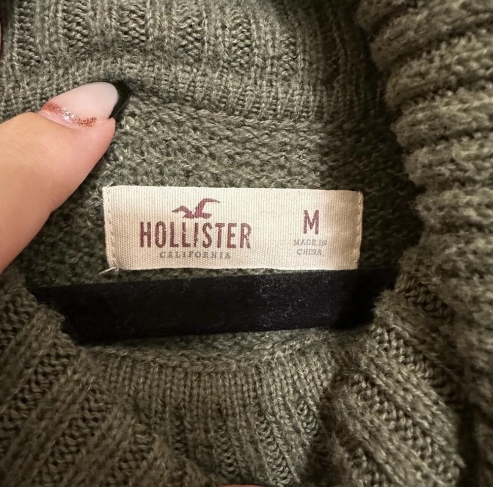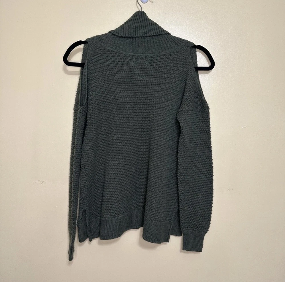 Hollister Womens Med Olive Green Long Sleeve Cold Shoulder Sweater Turtleneck Good pre-owned condition, missing material/care tag. Approximate flat lay measurements: Length-24” Bust-18” Sleeve-24” Elevate your wardrobe with this stylish Hollister sweater. The women's pullover features a solid med olive green color, long sleeves with cold shoulder sleeves, and a turtleneck neckline. The sweater is made from knit fabric that is both open and breathable, making it perfect for fall, winter, and spring seasons.