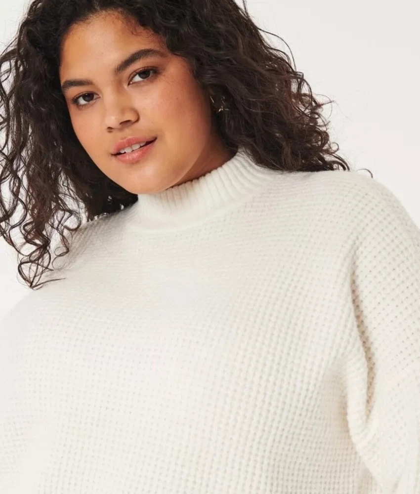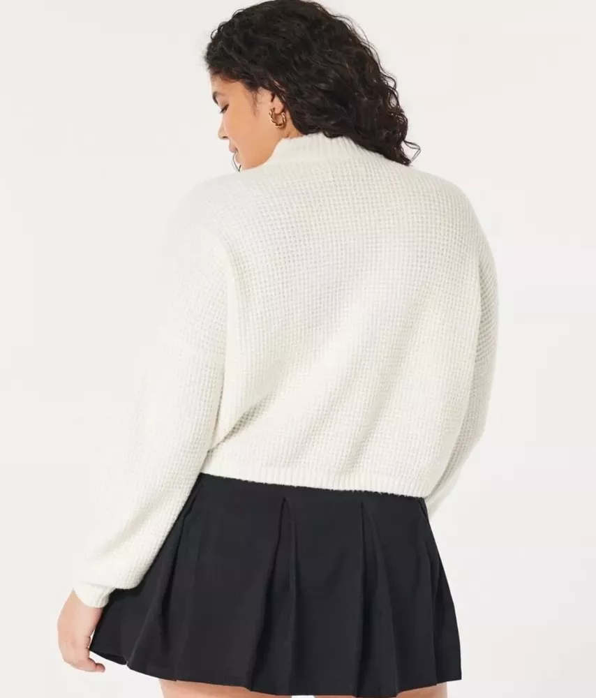 Introducing a stylish and versatile Hollister sweater, perfect for any occasion. Featuring a mock neck and waffle-knit design, this lightweight and breathable sweater is made of a comfortable blend of polyester, elastane, and recycled polyester. The long regular sleeves and collarless design make it suitable for all seasons, whether you're traveling, attending a party, or just running errands. This gray sweater is available in size small and is machine washable for easy care. It's a great addition to any wardrobe, with its solid pattern and casual theme. Made in Cambodia, this sweater is a must-have for any fashion-conscious woman who wants to stay comfortable and stylish. This has only been worn once so it's in great condition. It's made from 73% polyester, 25% recycled polyester, and 2% elastane. The bust measures at 24', sleeve length is 32', length is 19', and width is 48'.