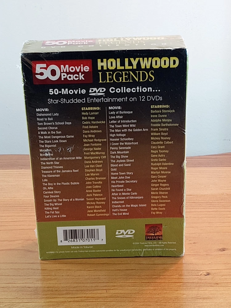 Experience the glamour of Hollywood's legendary stars with this 12-disc box set featuring 50 classic movies. Included in this pack are films featuring Ginger Rogers, Bette Davis, Leslie Nielsen, Steve McQueen, and Jack Palance, among others. This DVD set is perfect for movie lovers who enjoy drama and nostalgia. The Hollywood Legends 50 Movie Pack is a must-have addition to any DVD collection. With a variety of actors and genres, this box set offers something for everyone. Whether you're a fan of Ginger Rogers' comedic timing or Bette Davis' dramatic performances, this collection is sure to impress. Get your hands on this limited edition box set today.