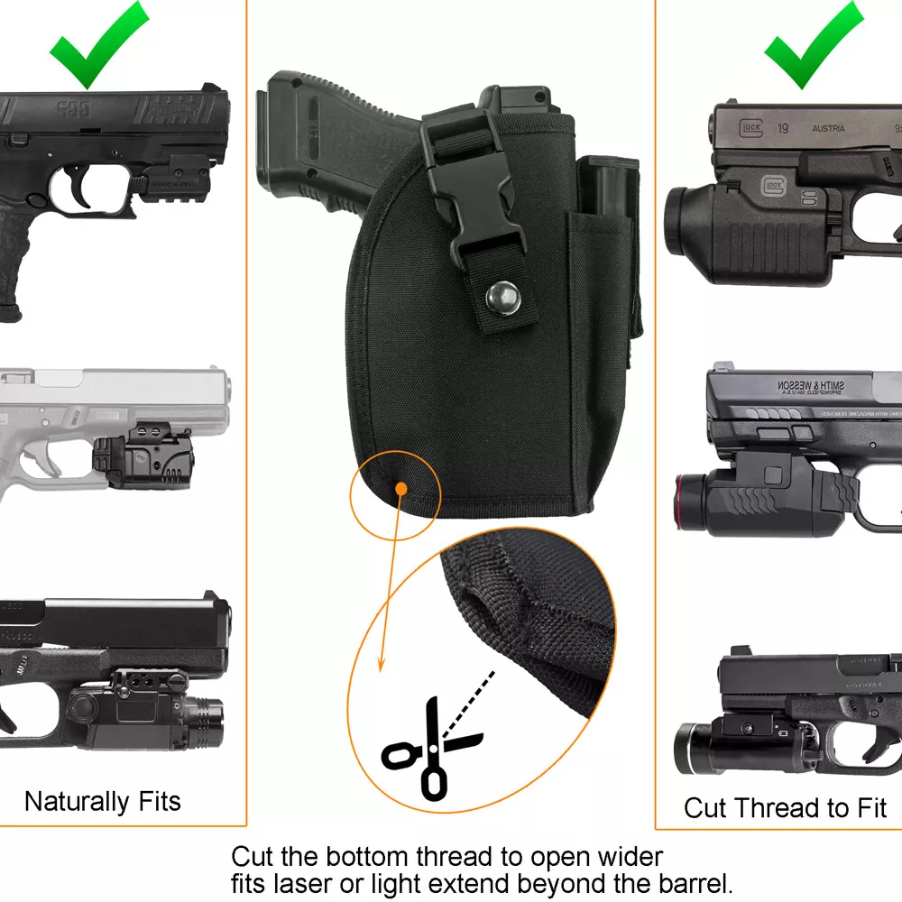 Store Categories Store Categories Bags and Pouch storage bag Tactical Bags Glasses Pouch Wallets Key Bag Molle Pouches Hats Hunting Outdoor Multi Tools Hunting Holster Hunting Pouches Laser and Riflescopes Scope Mounts Hunting Accessories Magazine Pouch Gun Slings & Belts Dog Supplies US STOCK Other Tactical OWB Holster for Gun with Laser or Light Attachment Handgun Belt Holster Product Description Fits handguns with under barrel laser or light attachment: Naturally fits handguns with laser or light NOT extend beyond the barrel, Cut the th re a d to fits laser or light extend beyond the barrel. Fits G17 G21 G22 R uger 9E SR Springfield XDm 4.5" 9mm Canik TP9 SA P89 Smith & Wesson M&P 9mm/.40/.45 Full Size ACP Beretta M9A1 9mm M9 A3 9mm PX4 92 FS H&K VP USP Taurus 9mm FN P99 PPX 1911 and many more pistols. High quality quick release buckle, Snap-On metal button and strong hook & loop straps. Fully adjustable and sturdy hook loop belt keeper for a secure fit to the belt, fit 2 inch heavy duty tactical belt. The extra pouch in the front is very useful for extra mag. Outside the waistband holster. For right hand use. Size: 7”*5.2”*2” (17.5cm*13cm*5cm) Weight: 4.06 oz (115g) Color: Black Package Content: 1 x Belt Holster Shipping Policy Returns Policy About US Shipping Policy Item will be shipped within 1 working days after received payment. USPS : USA 7-15 working days to arrive Air mail : 15-25 working days to arrive (other countries) Express Delivery: 7-10 working days to arrive NOTE: If you need your items urgently, we can ship it out by Express Shipping,but you need to charge extra fees. Returns Policy 1. We fully guarantee our items. All items are in brand new condition unless specified otherwise elsewhere in the description. 2. All returns - defective or otherwise - have to be preauthorized. Please contact us to get an authorization and returning address before sending the item back. All returned items must include original packaging and all accessories. 3. We will pay for the shipping cost of re-sending items to you, while buyers are responsible for the postal cost of returning the items. About US Our office hours are: 9:00 a.m. to 6:00 p.m. (GMT+8), Monday to Friday,And our office is closed on weekends and public holidays. Message replying will sometimes be delayed. If you have any question or needs, please let me know.We will reply to you within 24 hours.
