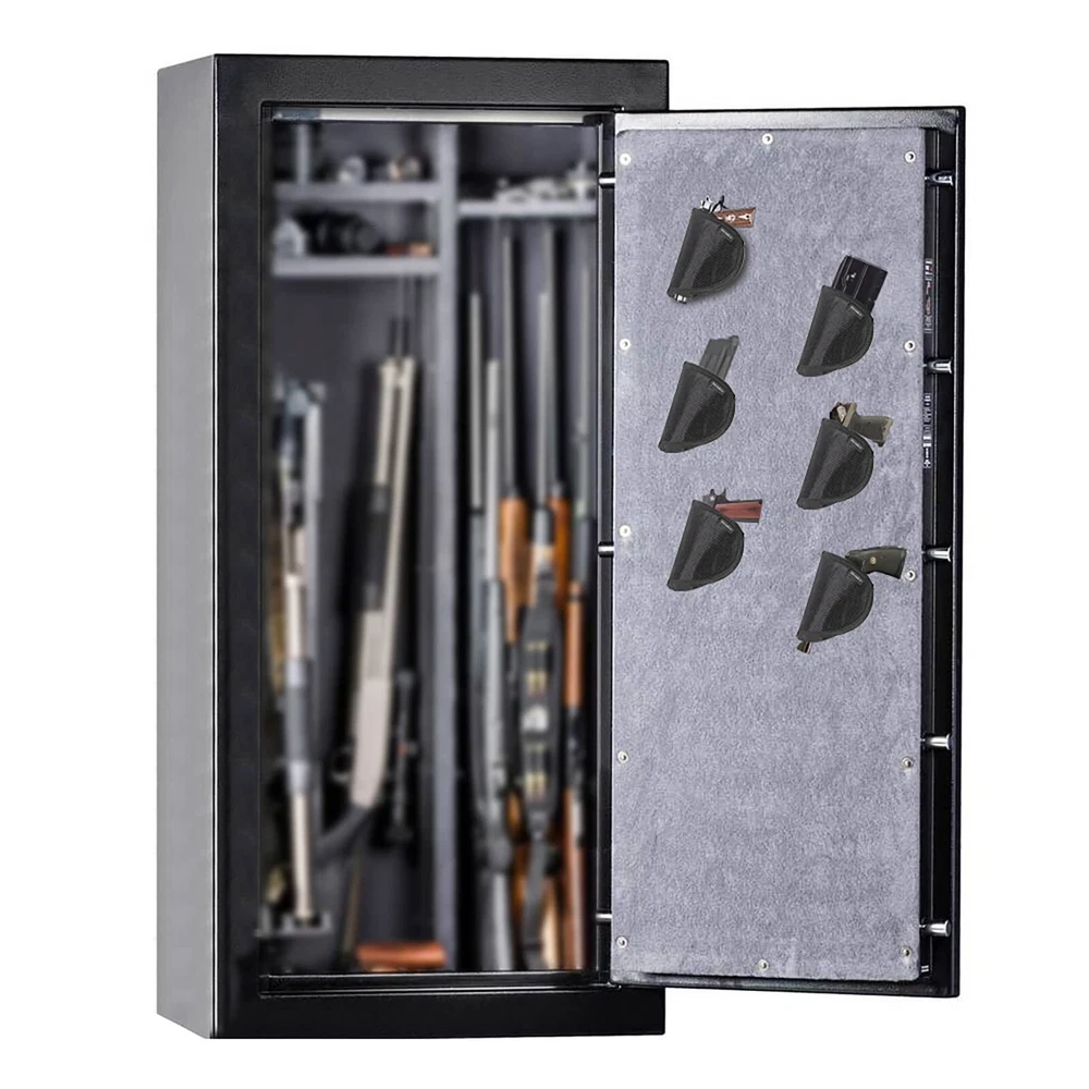 Holster with Adhensive Backing,Safe Accessories Handgun Holster Storage Solution Mount Inside Safes Door DURABLE MATERIAL: The safe holder is made of reinforced Oxford fabric, Strong and lightweight for use forever UNIVERSAL SIZE :6''H*4-3/4''W, Suitable Size to fits any handgun,pistols and revolvers and keep them from being dropped or damaged! TIME SAVING : Put and draw quickly from the safes door back panel ,perfect safe asseccories. WAYS OF INSTALLATION : Adhesive tape with super sticky,Suitable for smooth surfaces Such As steel cabinet, wood board, glass, ceramic tile,marble,etc; Also with the hook and loop tape it can use in safe with Carpet TIPS:Please make sure no moisture, grease or dust on the smooth surface before Sticking.