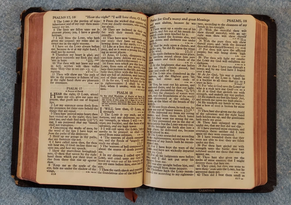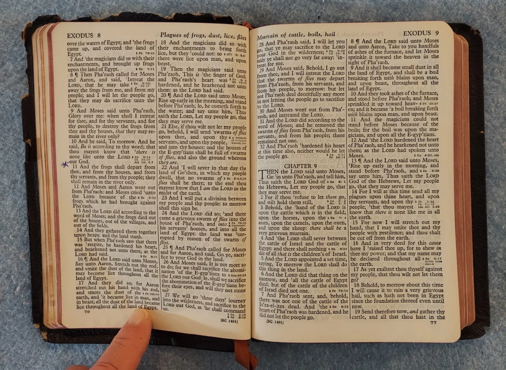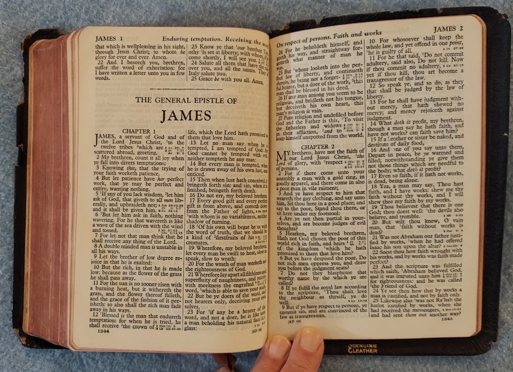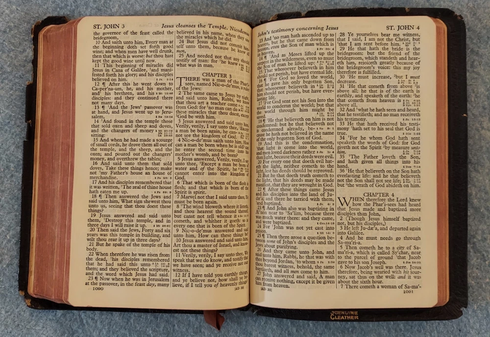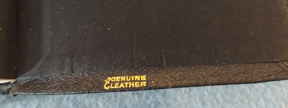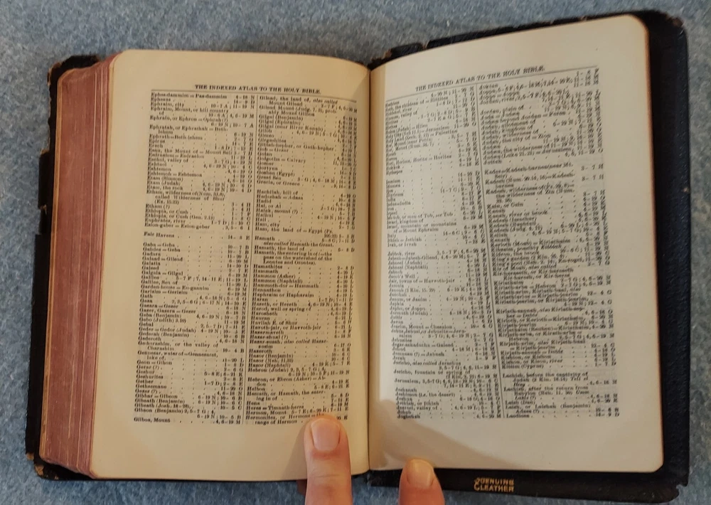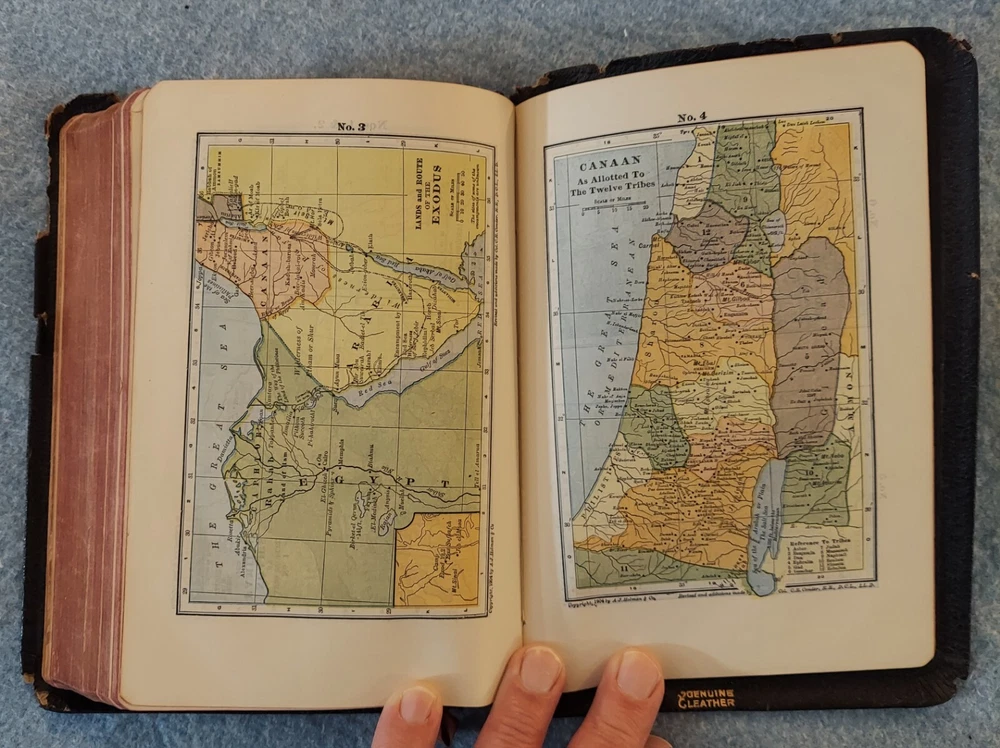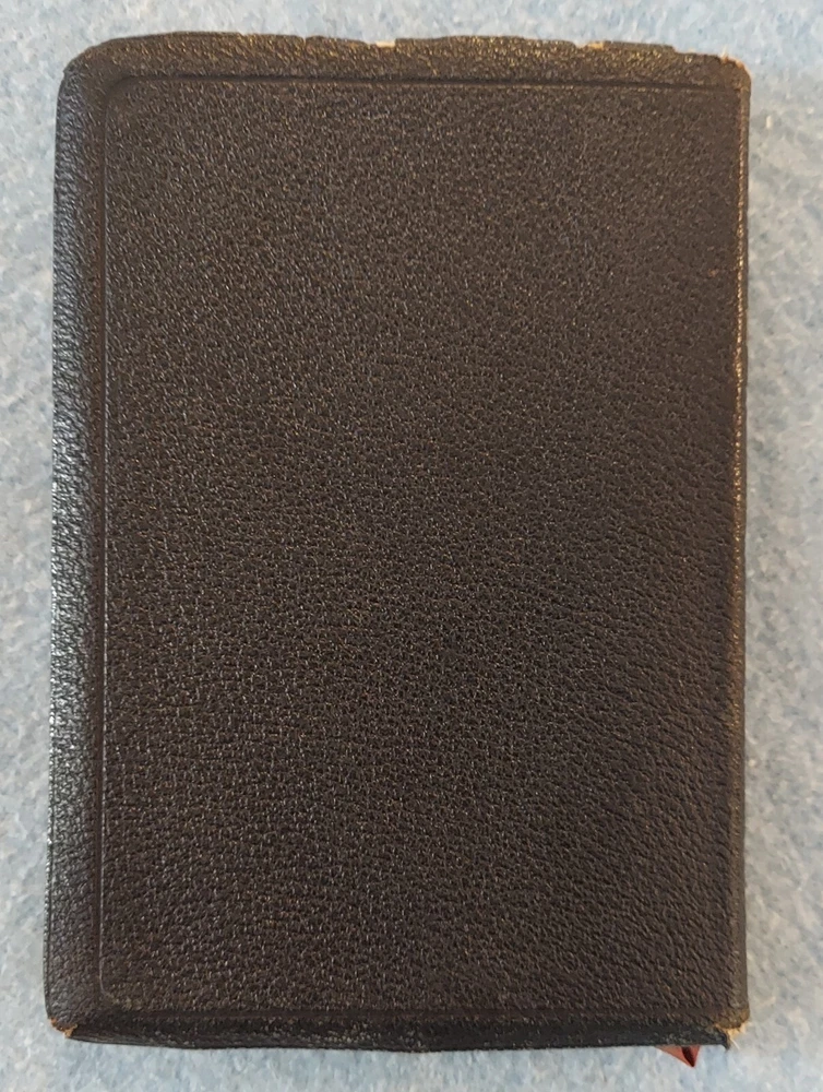 Holy Bible King James Version KJV Genuine Leather Holman Verse Ref Jewel 1942 Simplified Pronouncing THE HOLY BIBLE CONTAINING THE OLD AND NEW TESTAMENTS TRANSLATED OUT OF THE ORIGINAL TONGUES AND WITH THE FORMER TRANSLATIONS DILIGENTLY COMPARED AND REVISED THE TEXT CONFORMABLE TO THAT OF THE EDITION OF 1611 COMMONLY KNOWN AS THE AUTHORIZED OR KING JAMES VERSION HOLMAN COMPANY Verse References JEWEL 16mo Clearface India Paper Copyright 1942 Printed in the U.S.A. Cover: GENUINE LEATHER, black Size: 5 ¾ x 8 ¼ x 1 ¼ inches Pages: Old & New Testaments, 1280; Index to the Atlas to the Bible, 8; Color Atlas to the Bible, 12 See the photo with the coin to judge the size of the print. Features Topical page headings References (in-text cross-references, translation notes) Color Bible Atlas Gold-gilt on page edges This vintage Bible is in good condition, though the edges of the cover are fragile with some broken areas. The name of a previous owner is written and stamped on the second page. Marks are observed on just four pages, small marks in the margins. The binding is good and tight. The cover has just light wear, except around the edges. The overlapping edges are worn and broken off in some areas. There is wear at the top and bottom of the spine. The gold finish on the page edges is a bit worn and scuffed.