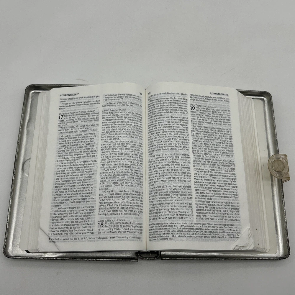 Metal edition of the new living translation. Bible features a metal clamshell cover with a magnetic clasp. The metal cover has an image of a pop top can and the word Thirsty? on the front. The cover has a few dents, numerous scratches, and lots of surface rust. Inside, the Bible has broken binding, and has had an attempted repair with duct tape. Please see pictures. There is some underlining and some pencil marked versus, as well as some notes in the back. Also, several of the pages have folded corners. This Bible appears to have been well used and has been through a lot, but with its durable metal cover, it can probably go through a lot more.