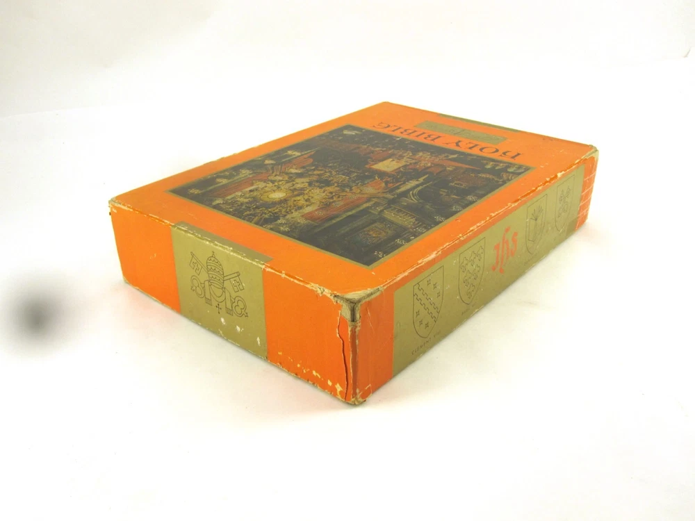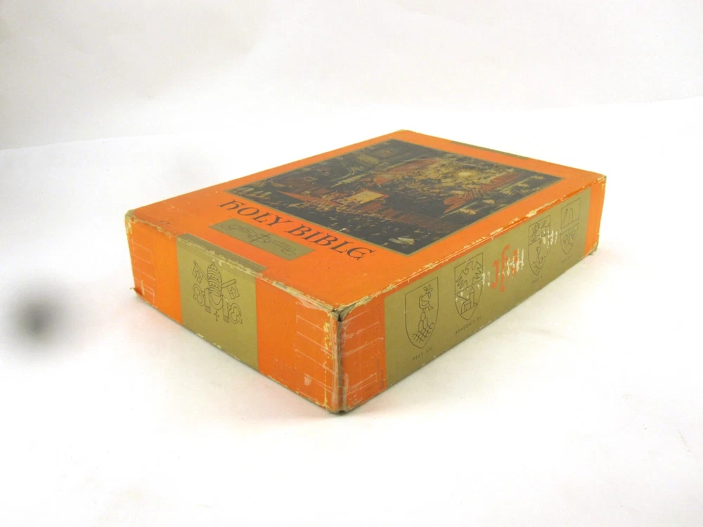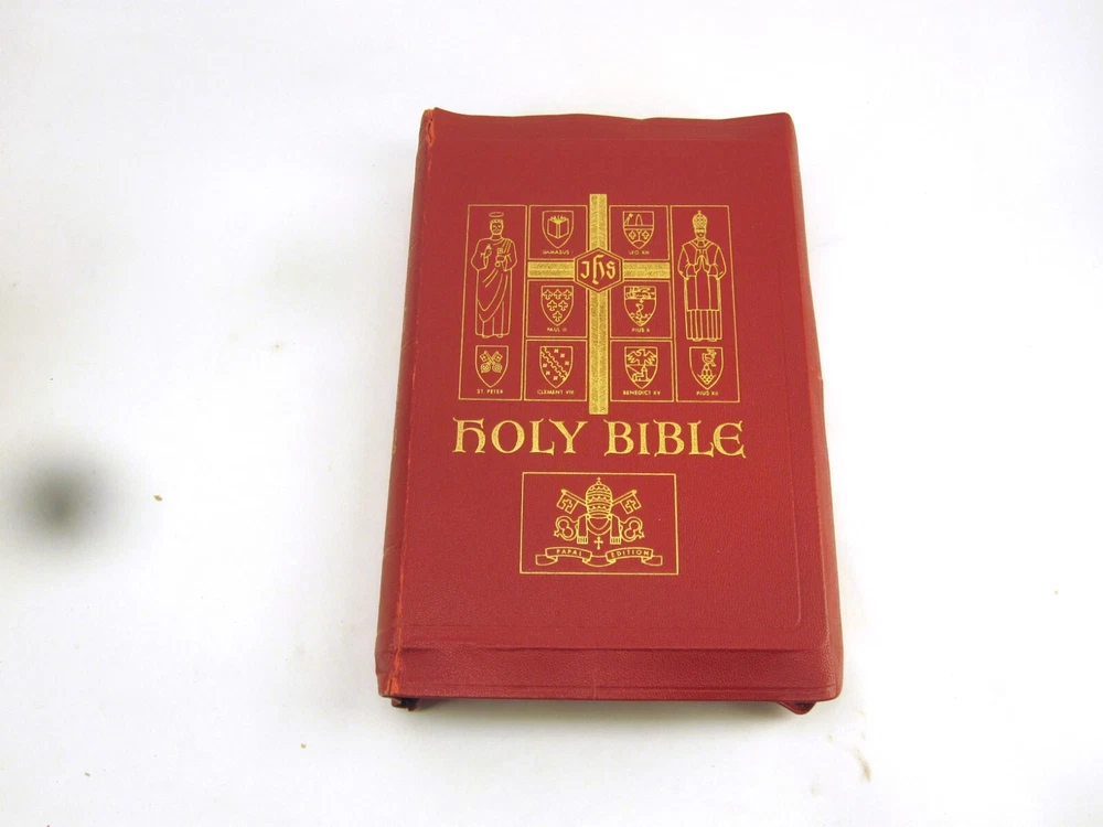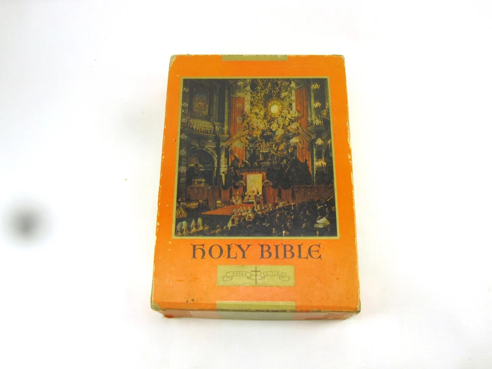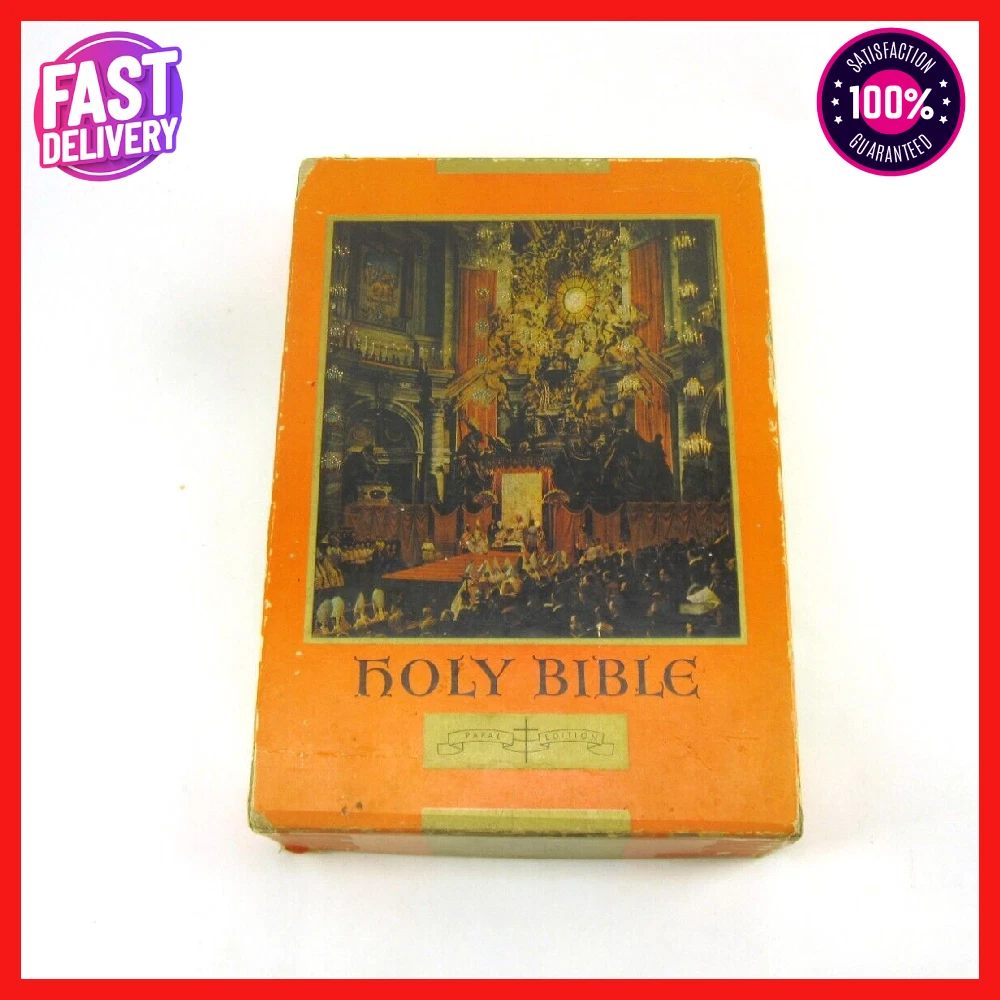 RE-USE-CALGARY Holy Bible Papal Edition 1952 Leather Bound Book With Box, Please See Photos Discover a piece of history with this 1952 Holy Bible, elegantly encased in a timeless red leather cover. This vintage religious collectible comes complete with its original box, adding to its authenticity and charm. Condition: Please take a moment to review the provided photos. While this Bible has stood the test of time, it does bear the marks of its journey. The leather cover shows signs of cracking on the front near the spine, which only adds to its character. Additionally, one of the pages inside has sustained some damage over the years. The original box, too, has seen better days and bears signs of wear and tear. Shipping: We're delighted to offer shipping options within Canada and to our neighbors in the United States. If you're in Canada or the US and don't see a shipping rate, kindly send us a message with your postal or zip code, and we'll swiftly provide you with a shipping quote. Combined Shipping: If you're considering multiple items from our collection, we're pleased to offer combined shipping. Simply let us know which items you're interested in, and we'll carefully pack them together to secure the best possible shipping rate for you. Your satisfaction is our top concern. We are committed to ensuring you receive your item in perfect condition. In the rare event that your item arrives damaged, please contact us, and we will arrange a refund for you. Contact Us: Should you have any inquiries about this remarkable 1952 Holy Bible or any other questions, please don't hesitate to send us a message. We're here to assist and provide you with all the information you need. Uncover Sacred Beauty: 1952 Papal Edition Holy Bible in Luxurious Leather. Limited Stock. Explore Now!