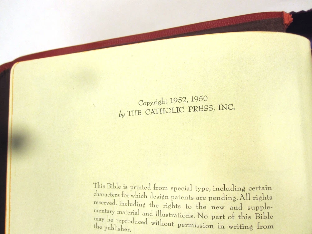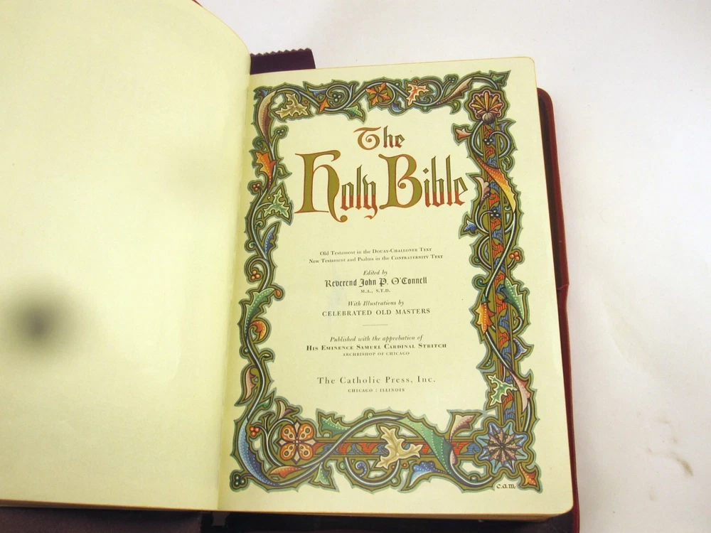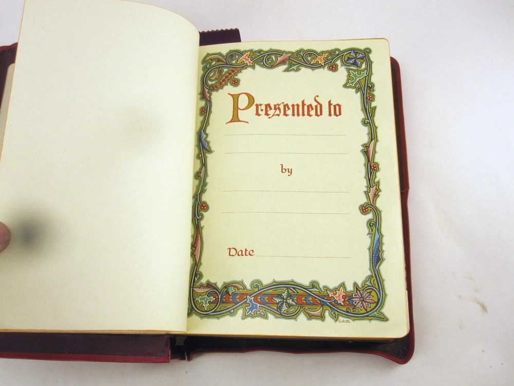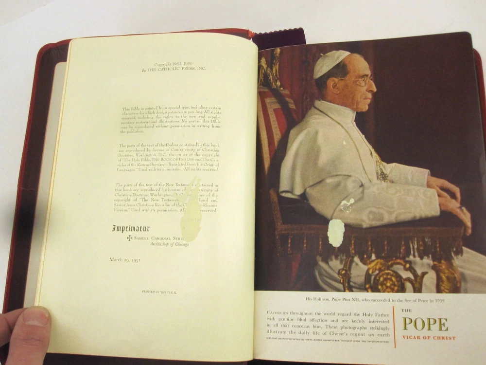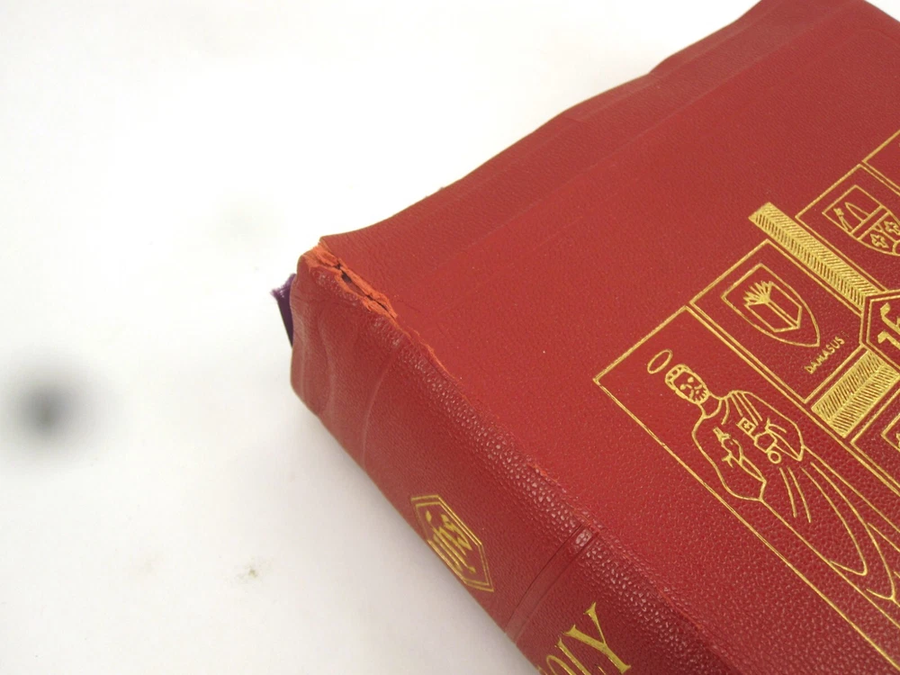 RE-USE-CALGARY Holy Bible Papal Edition 1952 Leather Bound Book With Box, Please See Photos Discover a piece of history with this 1952 Holy Bible, elegantly encased in a timeless red leather cover. This vintage religious collectible comes complete with its original box, adding to its authenticity and charm. Condition: Please take a moment to review the provided photos. While this Bible has stood the test of time, it does bear the marks of its journey. The leather cover shows signs of cracking on the front near the spine, which only adds to its character. Additionally, one of the pages inside has sustained some damage over the years. The original box, too, has seen better days and bears signs of wear and tear. Shipping: We're delighted to offer shipping options within Canada and to our neighbors in the United States. If you're in Canada or the US and don't see a shipping rate, kindly send us a message with your postal or zip code, and we'll swiftly provide you with a shipping quote. Combined Shipping: If you're considering multiple items from our collection, we're pleased to offer combined shipping. Simply let us know which items you're interested in, and we'll carefully pack them together to secure the best possible shipping rate for you. Your satisfaction is our top concern. We are committed to ensuring you receive your item in perfect condition. In the rare event that your item arrives damaged, please contact us, and we will arrange a refund for you. Contact Us: Should you have any inquiries about this remarkable 1952 Holy Bible or any other questions, please don't hesitate to send us a message. We're here to assist and provide you with all the information you need. Uncover Sacred Beauty: 1952 Papal Edition Holy Bible in Luxurious Leather. Limited Stock. Explore Now!