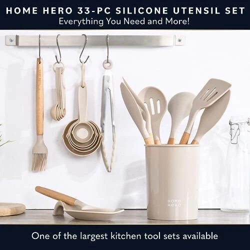 Return Policy Fast Delivery Trusted seller Home Hero 33 Pcs Kitchen Cooking Utensils Set, Non-Stick Silicone Cooking Kitchen Utensils Spatula Set with Holder, Wooden Handle Silicone Kitchen Gadgets Utensil Set (33 Pcs - Khaki) Product Description 33-Pieces Complete Kitchen Utensils Set - Our premium kitchen utensil sets has everything you need to cook the perfect dish: Solid Spoon, Slotted Spoon, Solid Turner, Slotted Turner, Pasta Server, Soup Ladle, Spoon Spatula, Large Spatula, Tongs, Egg Whisk, Measuring Cups and Spoons, Silicone Mat, Basting Brush, 10-pc Metal Hooks, and Utensils Holder Heat and Scratch Resistant - Our BPA-free, food-grade silicone cooking utensils set can withstand temperatures from -22° to 410°F so they don't melt or produce harmful fumes. And, the soft silicone tip will not scratch cookware, protecting non-stick pots and pans. Quality that Lasts - Say goodbye to flimsy kitchen tools that detach after a few uses. Home Hero's silicone spatula cooking utensils set is made with high-quality silicone and beechwood handles for lasting durability. Plus, wooden handles prevent heat transfer and scalding. Hassle-Free Storage - Our silicone utensil set includes a utensil holder with drainage holes and 10 stainless steel hooks, so you can store and dry tools easily. The beechwood handles also feature hanging holes. Enjoy a clutter-free kitchen with these household items! Customer service - Please, if you have any questions or issues regarding Home Hero first home essentials please do not hesitate to send the seller a message through we will respond within 24 hours. Shipping Returns Payment Shipping Shipping is FREE to all addresses other than APO/PO boxes in the lower 48 states. All our stock ships from US-based warehouses. Shipped via USPS or UPS (depending on location and package weight) Unless stated otherwise, all orders will ship within 24-72 hours of your payment being processed. Check our feedback to see the great reviews of FAST shipping we offer. Returns Seller does not accept returns Payment We currently accept payment via eBay managed payments only. Once payment is cleared, we will dispatch your shipment within 1-3 business days. Please refer to the "Shipping" tab for more information regarding shipping speed to your destination.