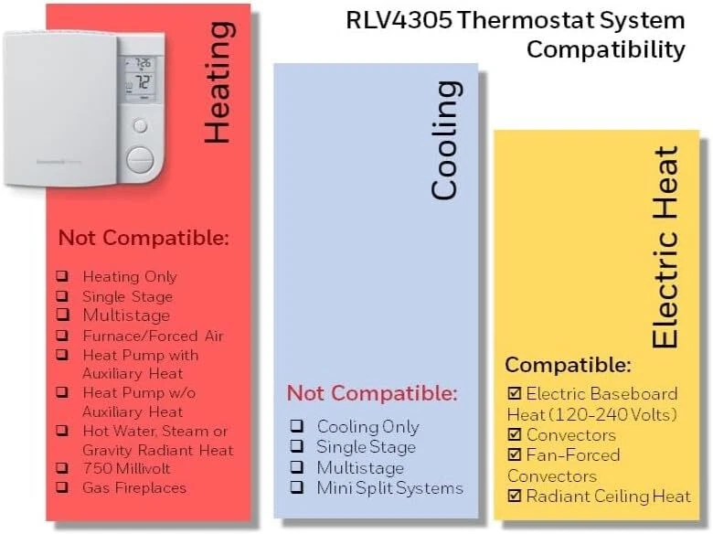 Product Description Home RLV4305A1000 5-2 Day Programmable Thermostat for Electric Baseboard Heaters The most accurate type of thermostat on the market (accuracy of ± 0.27 degreeF with baseboards and convectors). TRIAC switching allows for 100 percent silent operation and unsurpassed temperature control that helps eliminate temperature swings. 5-2 Day Programming allows for separate programs for the weekdays and weekends with 4 program periods per day including wake, leave, arrive and sleep. 2-wire non-polarized connection means fast, hassle-free installation. 1.31 x 4.75 x 4.88 inches About Us We are a reputable seller with many years of experience selling on eBay. Our goal is to provide high-quality products and excellent customer service. Shipping Items will be shipped within 1-3 business days when we received payment. (Orders are not processed on weekends & holidays) Tracking information will be sent once item is shipped. Delivery time depends on destination and other factors Item is shipped to ebay address. Leaving correct address can minimize delay. For international shipping and shipping to Guam, Hawaii and Alaska, Please contact us before placing the order. International buyers please note: Import duties, taxes and charges are not included in the item price or shipping charges. These charges are buyer’s responsibility. We will try our best to reduce the risk of the custom duties. Local pick-up is unavailable at the moment. Contact Us We reply any email messages within 1 business / working days(off-duty at weekend). If you do not get a response from us, then please check your junk or spam mailbox. Our Business hours: Mon-Fri 9:00-18:00, UTC/GMT +8 hours. Please contact us either by clicking "contact seller" in the "purchase history" section or simply click "ask a question" at the bottom of this page. If you are unsatisfied with our item or service, please contact us before leaving any feedback. We are committed to resolve all issues in a friendly and satisfactory manner.