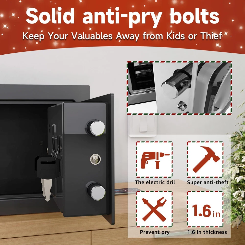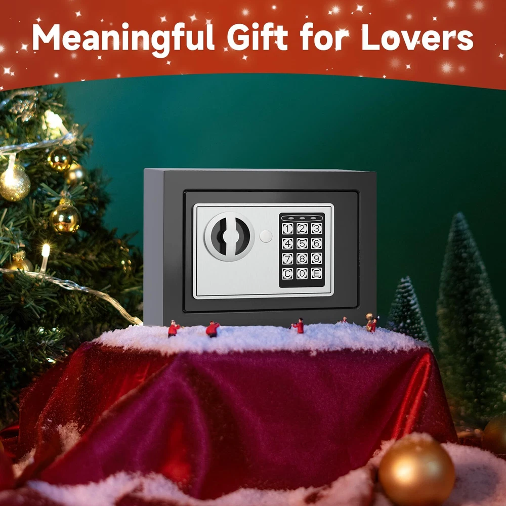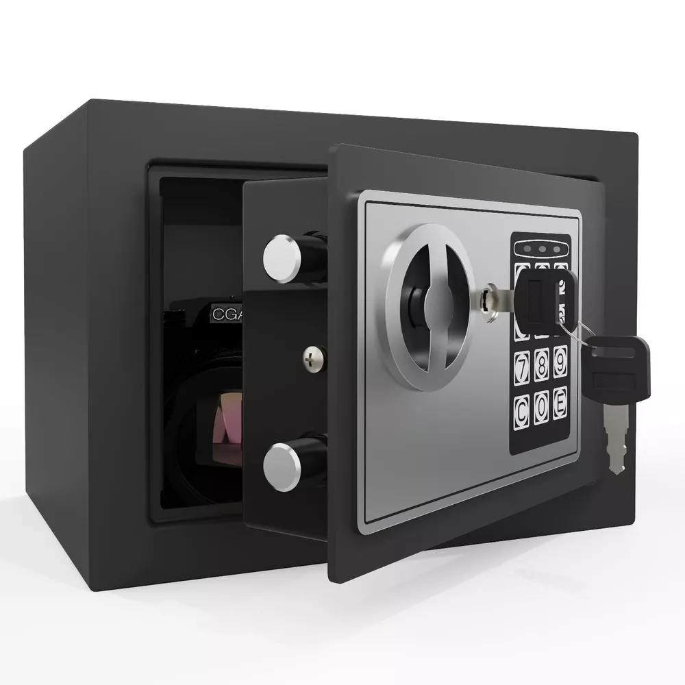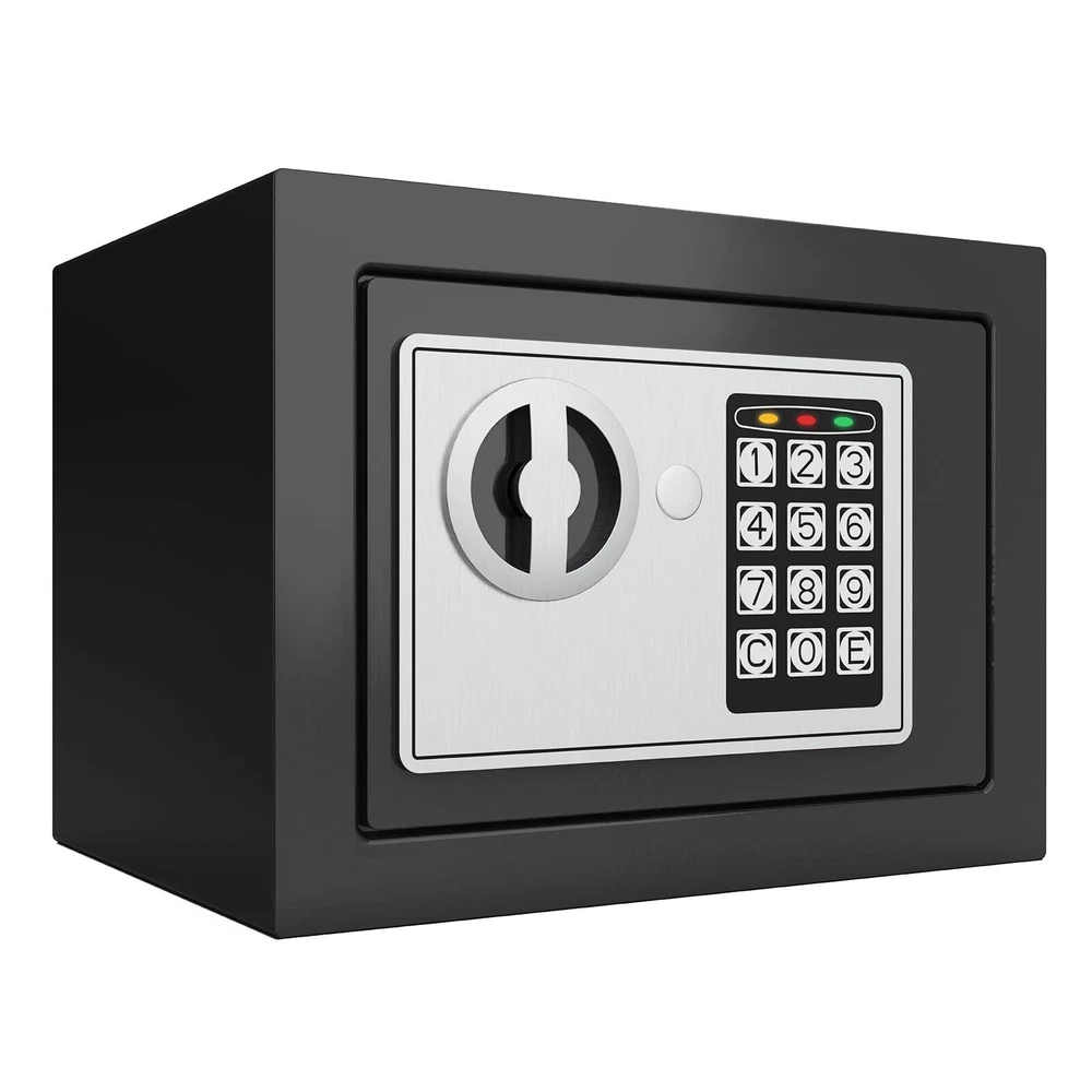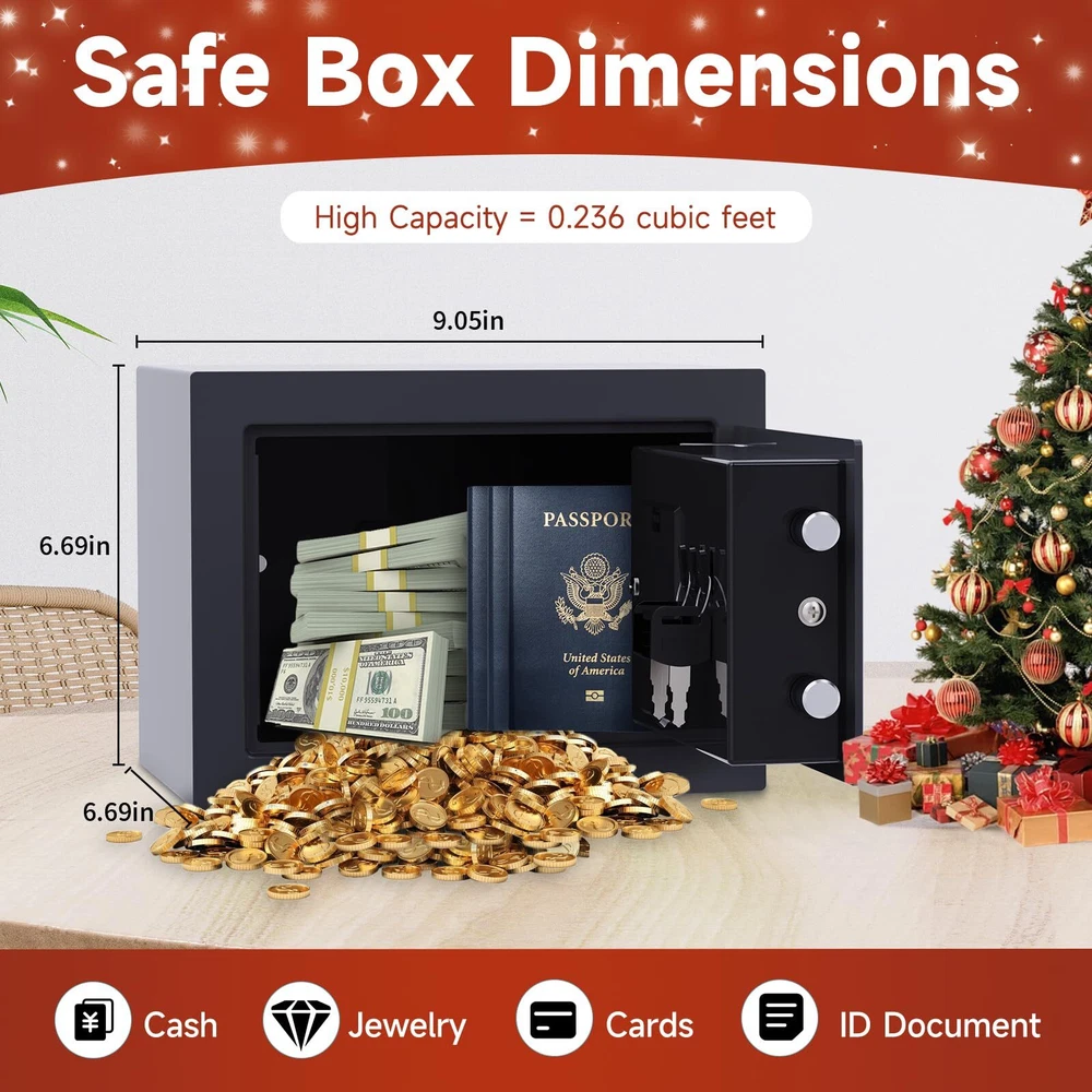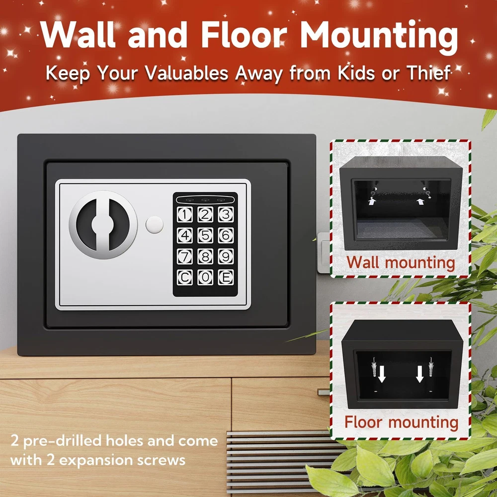 This is a mini safe that is easy to carry or keep at home and hotels. Let this safe protect and secure your valuables. (For example: jewelry, high precious metals, cash, important documents or other valuables). It's great for storing small things, but important to you. Its small size helps you easily hide or mount it on the wall or floor, and it hides nicely in a safe place. Exterior dimensions (H x W x D): 17 x 23 x 17 cm Interior dimensions (H x W x D): 16.84 x 22.86 x 11.93 cm Pre-drilled anchor holes for wall/floor mounting The floor and back come with pre-drilled anchor holes for added , or depending on your prefer to permanently secure the safe. Electronic locking system Equipped with an electronic locking system and mechanical override to ensure that no burglar has access to your precious valuables. ✅ Compact&Versatile ---Safe box with a compact size of 6.7''x9.0''x6.7'' is perfect for placing under a closet, drawer, or table. Compact yet not lacking storage capacity, the 0.23 Cubic Feet's capacity is sufficient to meet your home storage needs, providing a safe place to your cash, jewelry, important documents, and other valuable items. Looking for a thoughtful gift for your loved ones? This safe is an ideal choice ✅ Enhanced Features --- Made of reinforced alloy steel, this small safe box ensures durability and long-lasting protection. The included anti-scratch carpet and pry-resistant concealed hinges prevent any damage to your valuable items. Additionally, the high-strength bolts and corrosion-resistant coating add an extra layer of ✅ Key&Keypad Access --- Experience flexibility and convenience with different ways to open this mini safe. Use the personal password with the knob for everyday access, or utilize the key with the knob for quick entry. Simply insert the key, turn it counterclockwise, and then rotate the knob clockwise to unlock the safe door ✅ Easy Installation Options --- This home safe has pre drilled installation holes on the back and bottom for you, which can meet your needs whether you prefer wall mount or floor mount. It comes complete with all necessary mounting bolts and a comprehensive manual for hassle-free setup ✅ Package&Service --- Each package includes 1 x safe, 2 x keys, 2 x mounting bolts, 1 x anti-scratch carpet, 1 x detailed manual. Additionally, is available 24/7 to assist you. Trust us whenever you need