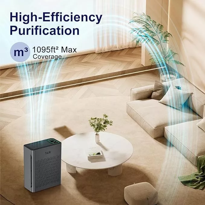Air Purifiers for Home Large Room Up to 1295 Ft² with PM 2.5 Display Air Quality Sensor, Auto Mode, Timer, HEPA Air Purifier for Bedroom Filters Smoke, Pollen, Pet Dander, Allergies, White About this item The air purifier comes with a filter EFFICIENT H13 PURIFICATION: The air purifier has a powerful filtration system that can remove particles as small as 0.3 microns, including dust and pollen. It can cover up to 1295 sq ft / 120.3 m² and refresh the air in a room every hour SMART AIR PURIFIER: This air purifier has a real-time air quality indicator that shifts from green to yellow or red, automatically adjusting the fan speed. Green means good air quality (low speed), yellow indicates moderate (medium speed), and red signals poor air quality (high speed) ULTIMATE SLEEPING EXPERIENCE: You can choose a low fan speed or the automatic mode according to your preference while sleeping. The lights can be turned off, and the machine runs quietly, ensuring that your beautiful dreams are not disturbed TIMER FUNCTION AND CYCLE TIMER FUNCTION: This product features timer settings for 2, 4, 6, and 8 hours. A long press on the timer button activates a recurring timer, enabling the air purifier to start daily at the same time and turn off after the set duration This Tolife Fresh Air Living HEPA Air Purifier is designed for large rooms up to 1295 square feet. It features True HEPA and Pre-Filter filtration technology to capture allergens, dust, and pollen. The Plug-In unit in gray ABS material operates quietly and is suitable for whole room use in various spaces like bedrooms and living rooms. It effectively removes smoke, mold, odors, and other contaminants for cleaner indoor air. On Jan 13, 2025 at 00:49:41 PST, seller added the following information: