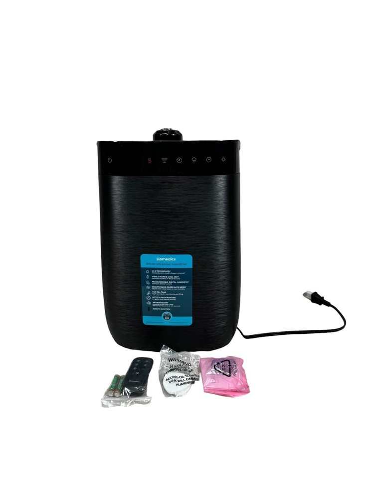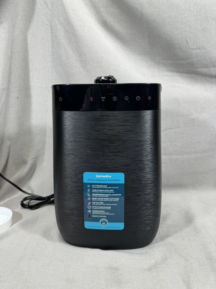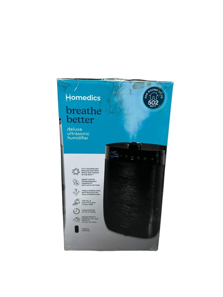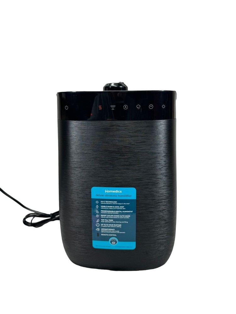 Upgrade your indoor air quality with the Homedics UHE-WMTF342-BK Deluxe Ultrasonic Humidifier. This tower humidifier has a tank capacity of 1.5 gallons and can humidify a whole room for up to 70 hours. The ultrasonic technology ensures quiet operation and the digital display allows easy control of the settings. This Homedics humidifier also features a remote control, automatic shut off, aroma diffuser, humidistat, LED lights, and a tank empty indicator. The black color and sleek design make it a perfect addition to any home décor. Enjoy the benefits of a comfortable environment without mentioning the word 'condition' in the description.