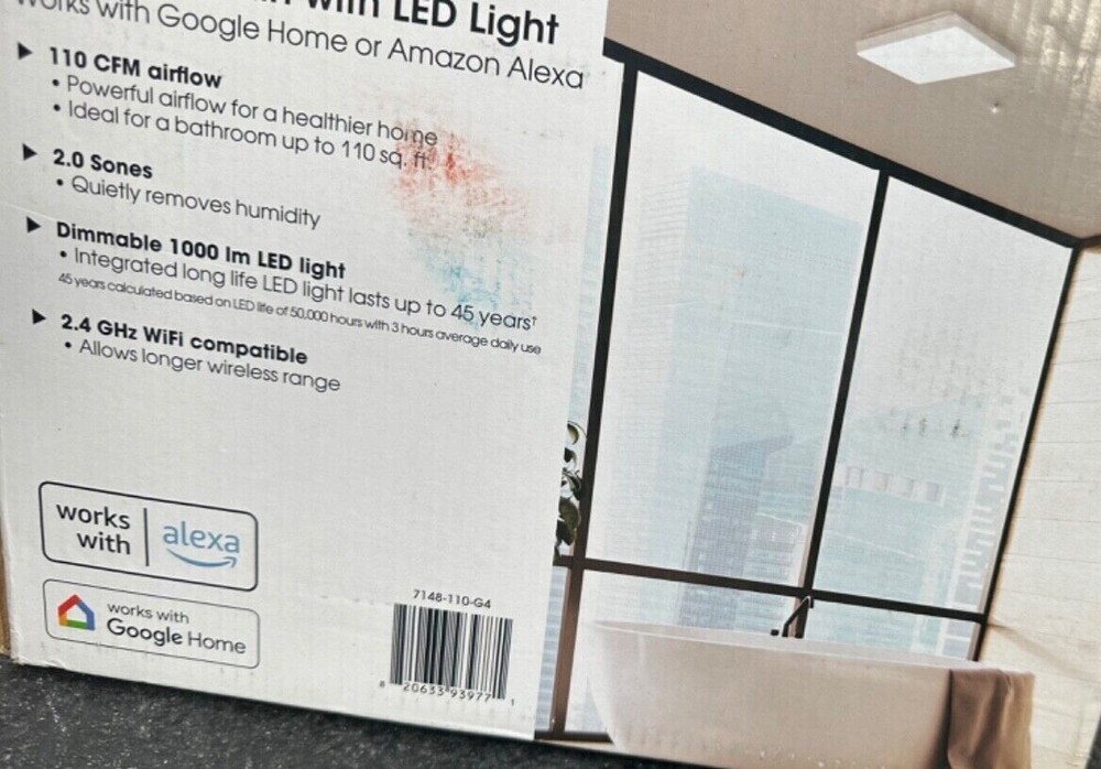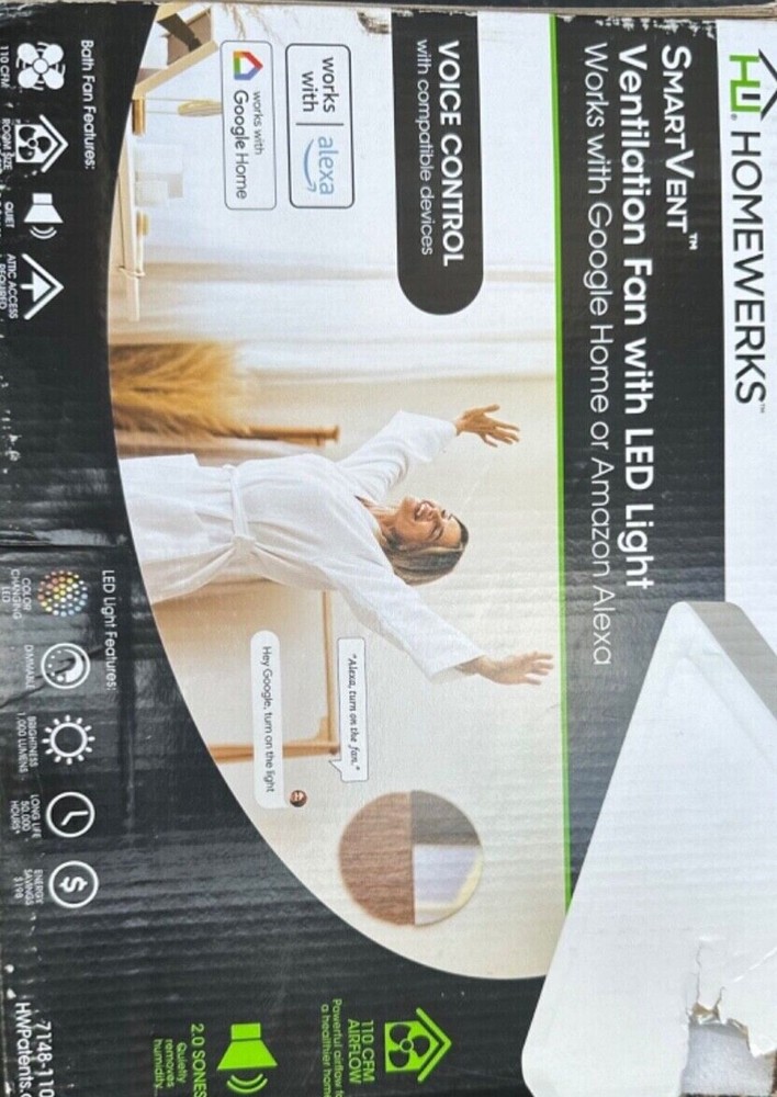 The latest SmartVent ventilation fan from Homewerks is designed to work with both Amazon Alexa and Google Assistant. Using your existing Amazon Echo or Google Home devices, you can control the fan and LED light with voice commands to either an Alexa or Google virtual assistant. In addition, the fan and light settings can be adjusted through the corresponding Alexa or Google apps, with the Homewerks Connect app or a compatible wall switch (not included). This bath fan has a long-lasting dimmable LED light with a 50, 000 hour lifespan. The light can easily be adjusted to the desired brightness. Choose your ideal LED color light setting. This fans offers a soothing 2200K CCT warm white, 3000K soft white, 4000K cool white, and a 5000K daylight setting that is ideal for detailed tasks like shaving or putting on makeup. The 110 CFM fan airflow efficiently operates in medium sizes rooms up to 110 square feet. At 2.0 sones, this ventilation fan quietly removes humidity. This bathroom fan features no-cut housing measuring 7.5” L x 7.25” W and is made of corrosion resistant galvanized steel that is built to withstand moisture and will keep your bath fan operating seamlessly. To bring style and functionality to your smart home, upgrade today to the Homewerks smart ventilation fan with LED. Collection Name IOT LED Fan Fixture Color Family White Ceiling Cutout Length (Inches) 7.5 Ceiling Cutout Width (Inches) 7.25 Duct Size 4-in Fan Box Length (Inches) 7.5 Air Movement (CFM) 110 Bulb Type LED Color Temperature (Kelvins) 5000 App Compatibility Yes Bluetooth Compatibility No Bluetooth Enabled No
