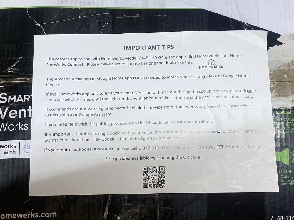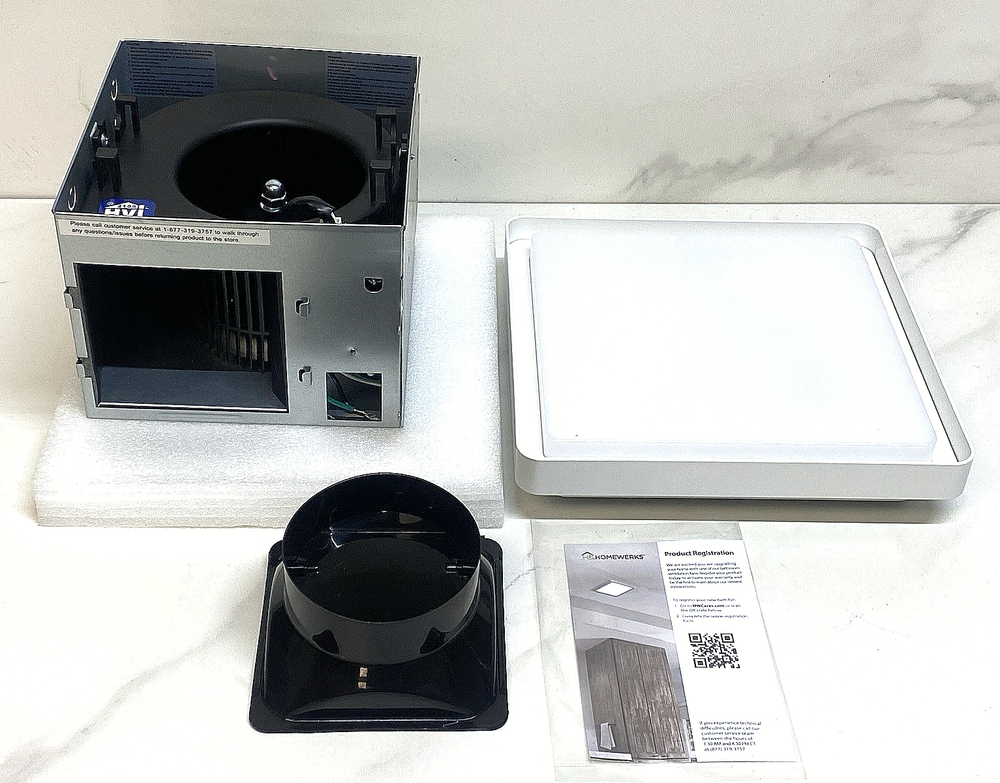 ⸻ ⚠️ Note: 🔌 Missing the small electrical cover. Otherwise in perfect condition. ✅ Tested and works. 📱 App failed to sync for me the first time. I found that if you keep your phone very close to the fan, it'll sync immediately. 💡 It is currently setup with the fan on and light on at 50% warmth. We can change the presets if you'd rather not mess with the app at all. It can be wired as-is with separate hots for the light and fan. The latest SmartVent ventilation fan from Homewerks is designed to work with both Amazon Alexa and Google Assistant. Using your existing Amazon Echo or Google Home devices, you can control the fan and LED light with voice commands to either an Alexa or Google virtual assistant. In addition, the fan and light settings can be adjusted through the corresponding Alexa or Google apps, with the Homewerks Connect app or a compatible wall switch (not included). This bath fan has a long-lasting dimmable LED light with a 50,000 hour lifespan. The light can easily be adjusted to the desired brightness. Choose your ideal LED color light setting. This fans offers a soothing 2200K CCT warm white, 3000K soft white, 4000K cool white, and a 5000K daylight setting that is ideal for detailed tasks like shaving or putting on makeup. The 110 CFM fan airflow efficiently operates in medium sizes rooms up to 110 square feet. At 2.0 sones, this ventilation fan quietly removes humidity. This bathroom fan features no-cut housing measuring 7.5” L x 7.25” W and is made of corrosion resistant galvanized steel that is built to withstand moisture and will keep your bath fan operating seamlessly. A limited 5-year warranty provides peace of mind. To bring style and functionality to your smart home, upgrade today to the Homewerks smart ventilation fan with LED. Compatible with existing Alexa and Google voice assistant units which control the light and fan settings Integrated color changing LED light is dimmable and has a 50,000 hour LED lifespan for long life Four color temperature options: 2200K CCT warm white, 3000K soft white, 4000K cool white and 5000K daylight 110 CFM fan airflow quietly removes humidity 2.0 sones is ideal size for rooms up to 110 sq ft 2.4 GHz WiFi compatibility allows longer wireless range Control the functions via voice commands, the mobile app, or a compatible wall switch (not included) No-cut housing is easier to install Constructed of corrosion resistant galvanized that is built to withstand moisture This is an open box item that has been thoroughly inspected for condition and completeness. It is in like new condition. We are a new, small business. We stand behind every item sold and want you to be completely satisfied. If you encounter any issues with your order, please contact us first and we'll work to resolve them as soon as possible. If a return is necessary, we offer hassle-free returns within 30 days of purchase if the item is damaged or defective. ref 1128G F1