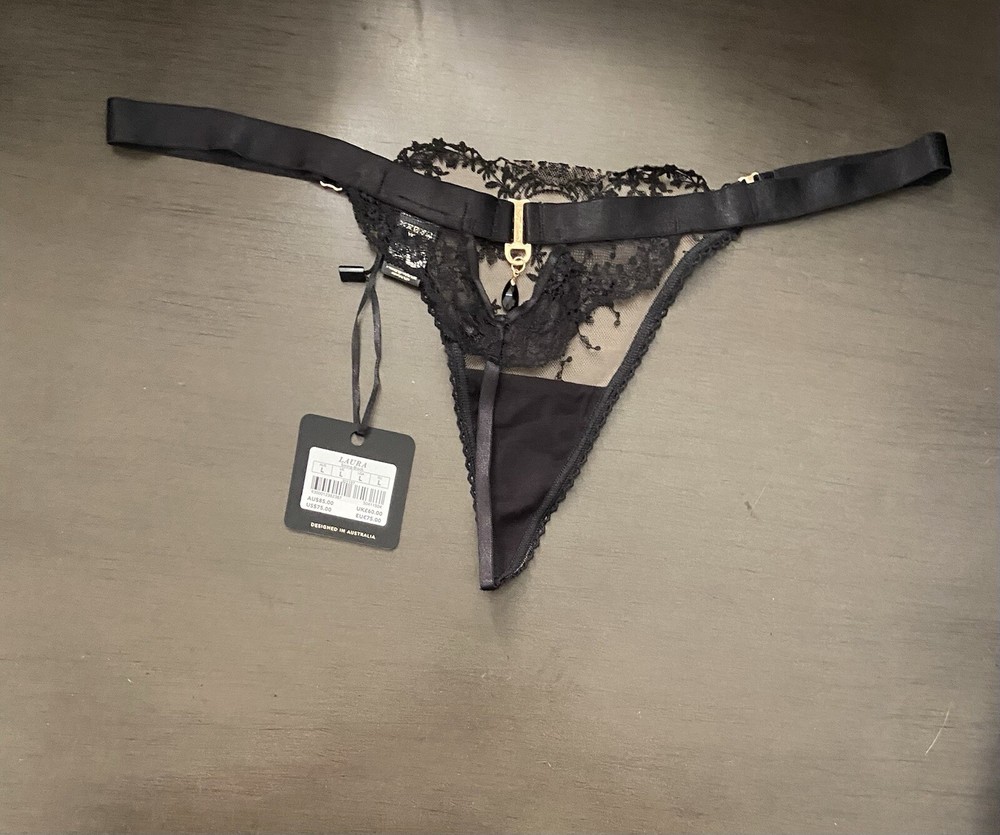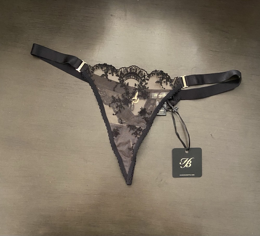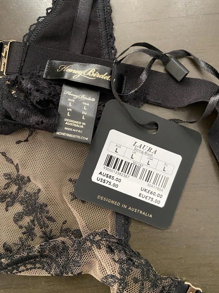 Honey Birdette Laura Black Thong Panty, Size L, New With Tags. Want to feel unstoppable? Show a little skin in our Laura lingerie. Made with Swiss-designed embroidery on sheer crystal tulle, the collection features a contrast of soft black lace and bold elastic trims. Finished with black crystal pendants and signature gold slides, Laura is the definition of elegance and charm. Lacy black thong Wide elastic waistband can be worn high or low Front panel features Swiss-designed embroidery Signature gold slides on both hip sides Back keyhole feature with black crystal pendant String back with soft lace detail Cotton lined gusset