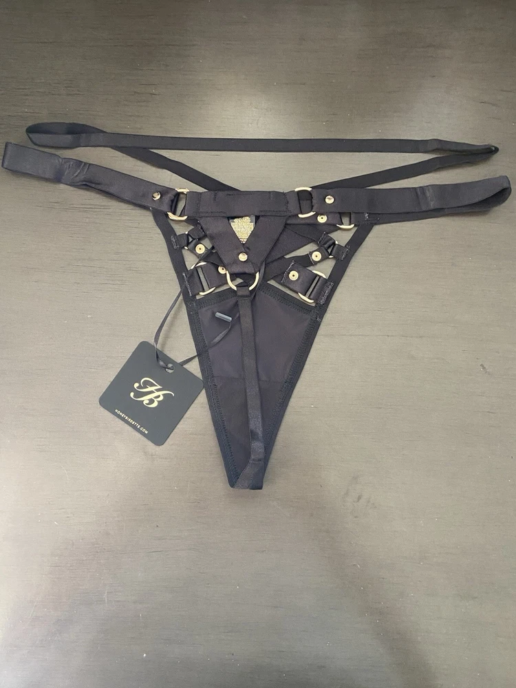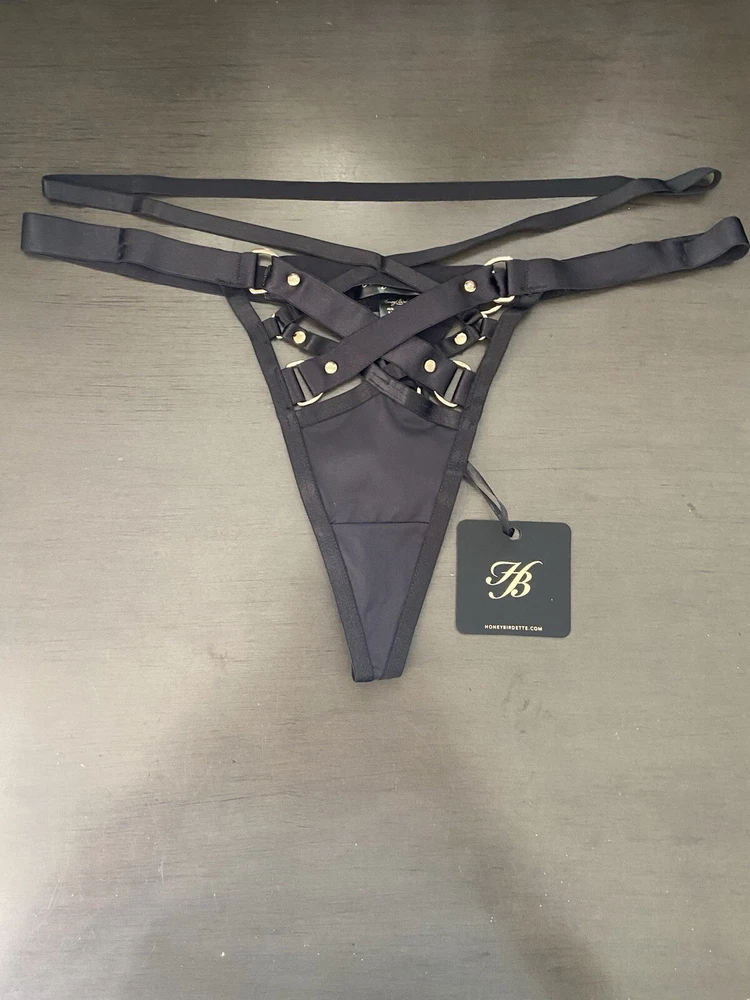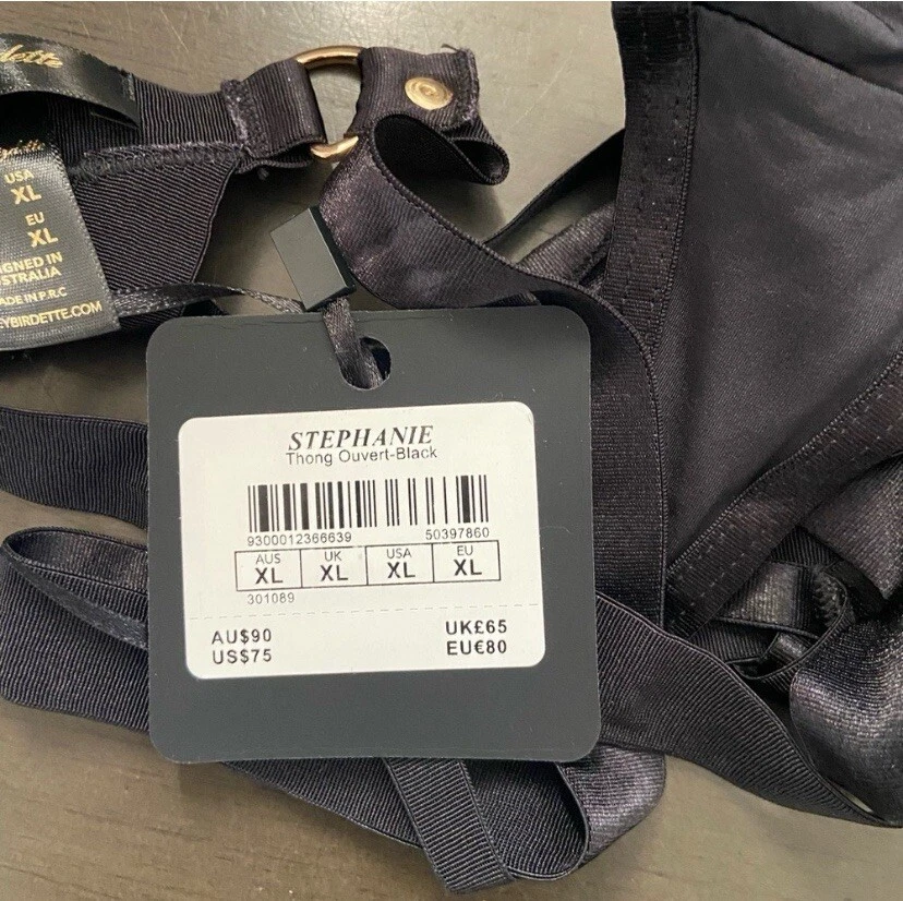 Honey Birdette Stephanie Black Thong Panty, Size XL, New With Tags. Straps to stun. Stephanie is back and she’s even better in black. Designed with statement elastics to cross over the body, the collection features gold-plated hardware and bondage D-rings. Including a new and improved fit on the contour bra, Stephanie is the style you won’t want to take off. Strappy black thong Single string elastic back Open front panel with criss-cross elastics Glossy gold studs & bondage D rings Mitred elastics on the hips can be worn high or low Black satin gusset & cotton lining