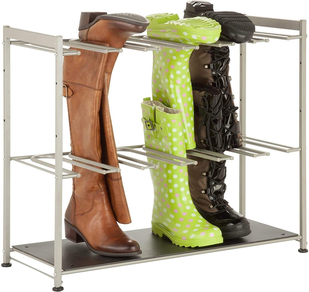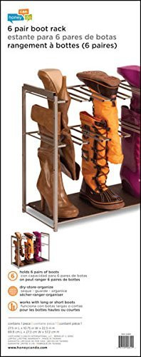 Honey-Can-Do SHO-02812 6-Pair Boot Rack, 27.5" x 10.75" x 22.5", Silver Works with nearly all types of boots Durable steel frame provides year of maintenance and worry free use Keeps boots off the floor and organized Measures: 27.5L x 10.75W x 22.5H