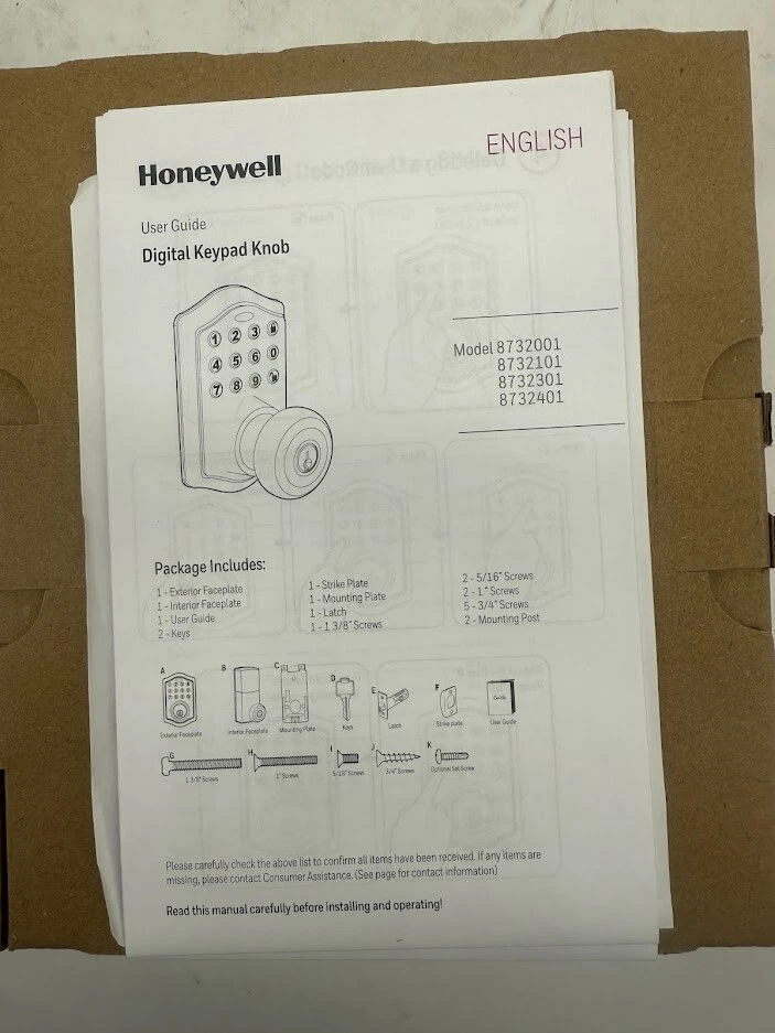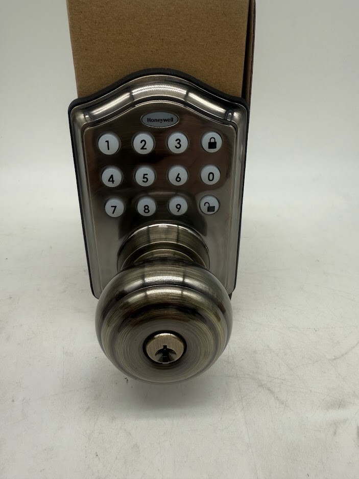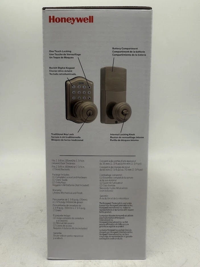 Upgrade your home security with the Honeywell Electronic Entry Knob, designed for keyless entry with a user-friendly programmable keypad. Featuring a convenient one-touch locking system and the ability to store up to 50 user codes, this electronic knob offers both security and ease of use. The backlit keypad ensures visibility in low-light conditions, while the built-in alarm system provides added protection by sounding an alert after four incorrect code attempts. Compatible with various door thicknesses and easy to install with just a Phillips screwdriver, this entry knob is a smart choice for any home. Key Features: ✔ Keyless Entry: Backlit programmable keypad for easy access without keys ✔ One-Touch Locking: Simply press the programming button to lock the door instantly ✔ Secure Access: Stores up to 50 user codes for multiple users ✔ Built-in Alarm: Sounds a warning and locks the keypad for 30 seconds after four incorrect attempts ✔ Versatile Fit: Adjusts to fit doors 1-3/8 in. to 1-3/4 in. thick with a latch adaptable to 2-3/8 in. or 2-3/4 in. backsets ✔ Easy Installation: Installs in minutes using a standard Phillips screwdriver; fits both left and right-handed doors ✔ Battery Operated: Runs on 4 AA alkaline batteries (not included) Perfect for homeowners seeking modern security, convenience, and peace of mind , the Honeywell Electronic Entry Knob blends seamlessly with any home décor while delivering reliable protection. We take great care to inspect all items and ensure they are accurately described. Should you have any issues with your purchase, please let us know immediately. We are committed to resolving any concerns promptly and to your satisfaction. Our small business truly appreciates your patronage.
