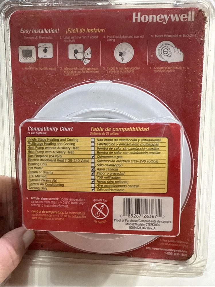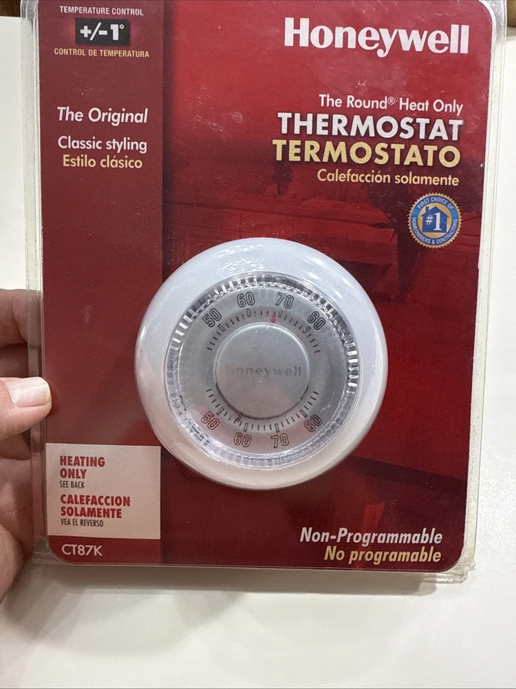 The Honeywell CT87K Round Heat Only Non-Programmable Manual Thermostat is a brand new thermostat designed for use with space heaters. It operates on a low voltage of 24V and features a 2-wire wire configuration. The thermostat has a classic round shape and a white plastic construction. With an adjustable thermostat and thermal protection properties, it offers simple manual control of heating stages. Compatible with Honeywell products and equipped with a universal smart home compatibility, this thermostat is a reliable option for maintaining a comfortable temperature in your space.